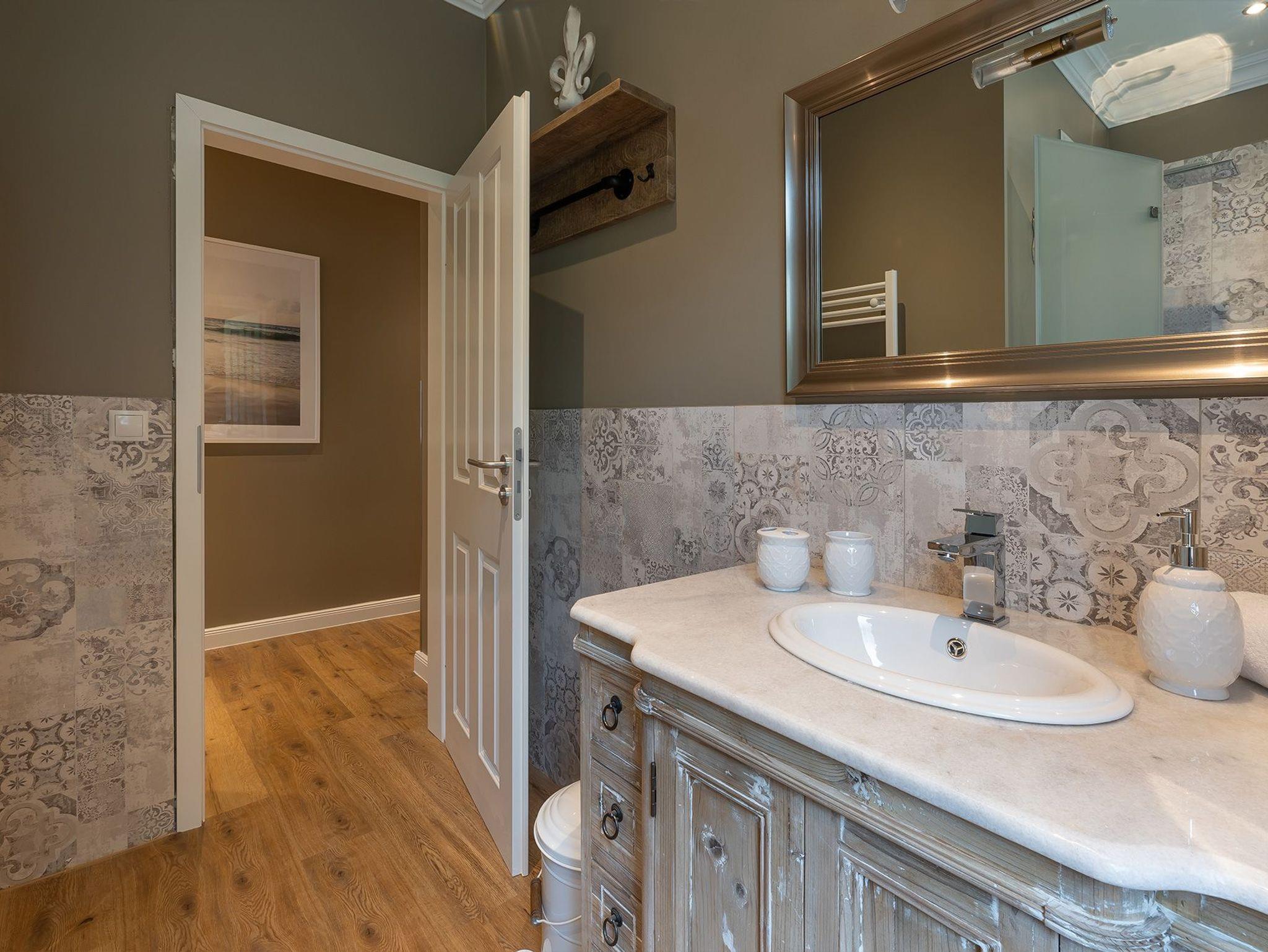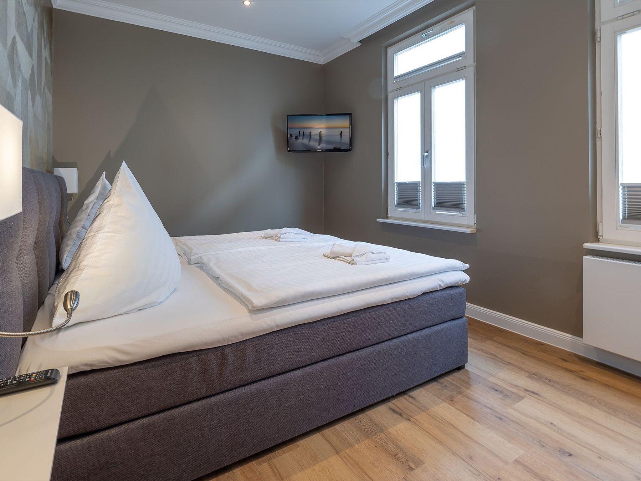 Als Rückzugsort erwartet Sie zwei Schlafzimmer mit Boxspringbetten in 180x200 cm und einem großen Kleiderschrank. Die Ferienwohnung verfügt über ein Bad mit Dusche, sowie einem separaten WC mit Handwaschbecken.