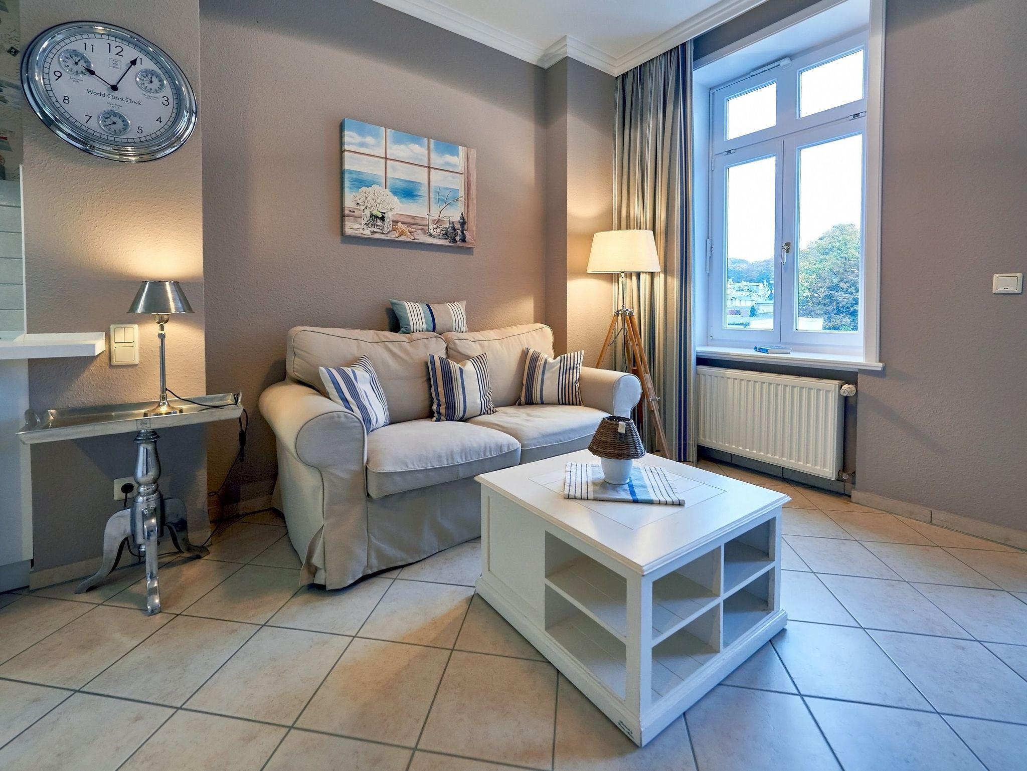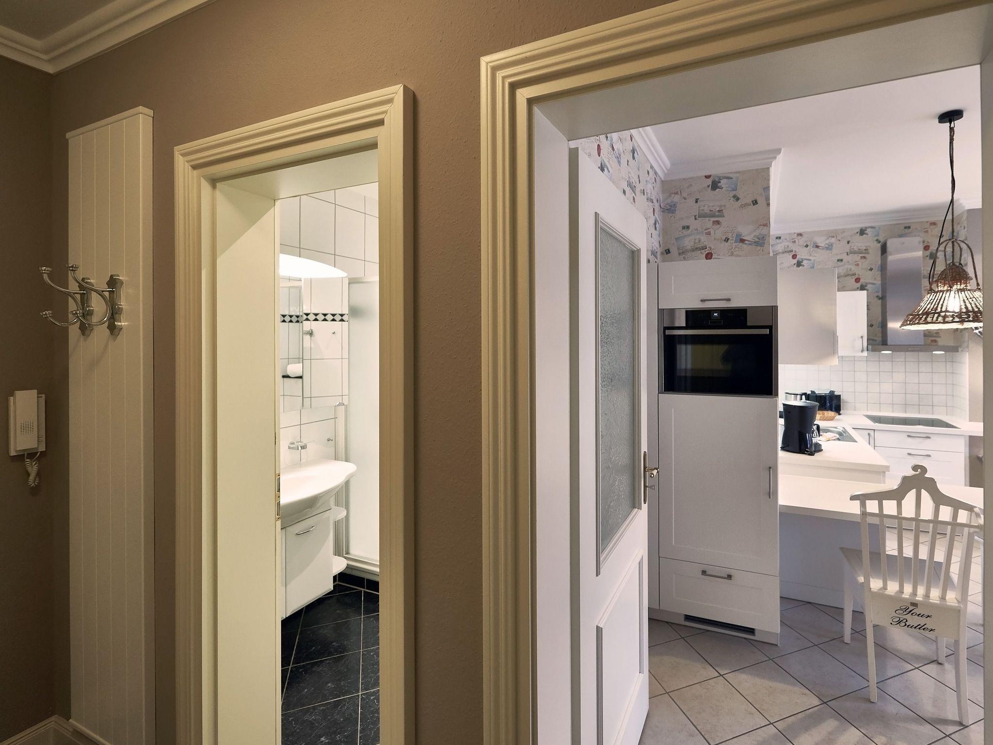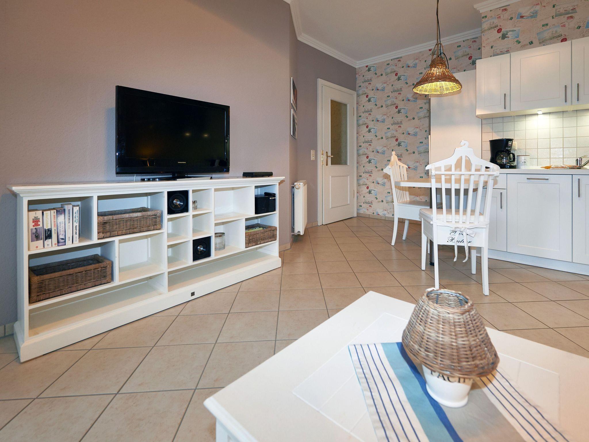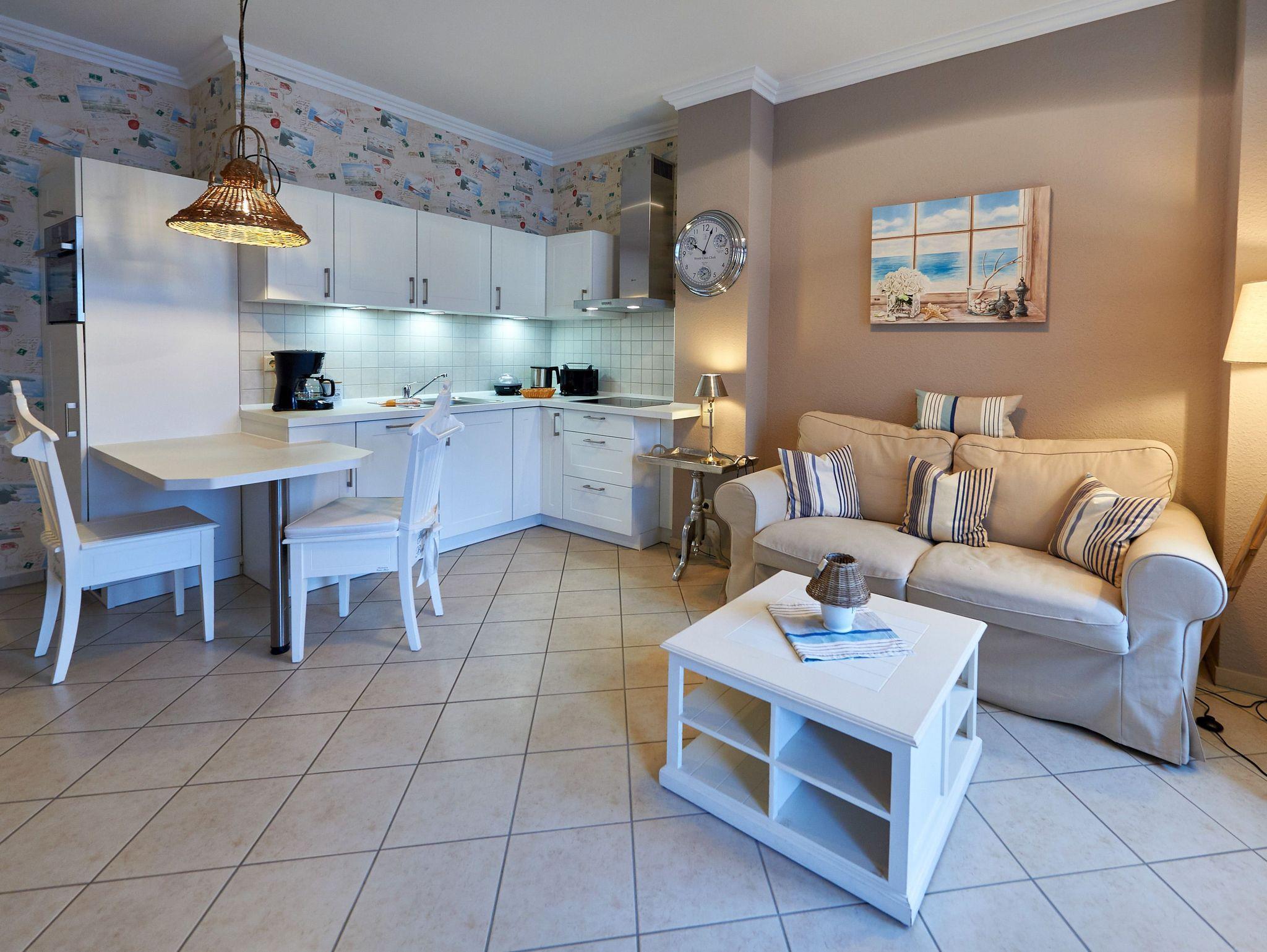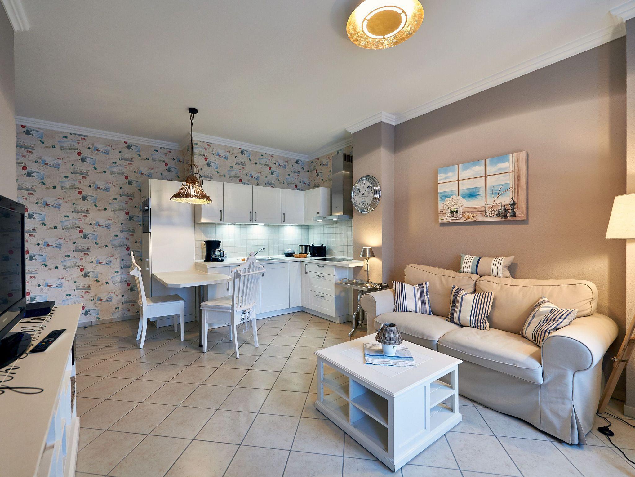 Dieses rund 40m² große und sehr stilvoll eingerichtete 2-Raum-Appartement befindet sich im 2. Obergeschoss und hat zusätzlich einen 12m² möblierten Holzbalkon im Bäderstil zur Nordseite. Die wunderschönen Landhausmöbel, ausgesuchte Stoffe und die warmen Erdtöne schaffen mit den leicht maritimen Akzenten ein ganz einzigartiges Wohlfühlambiente. Die gesamte Nichtraucherwohnung ist gefliest bzw. mit Designerboden in Vintage-Oak-Optik versehen.