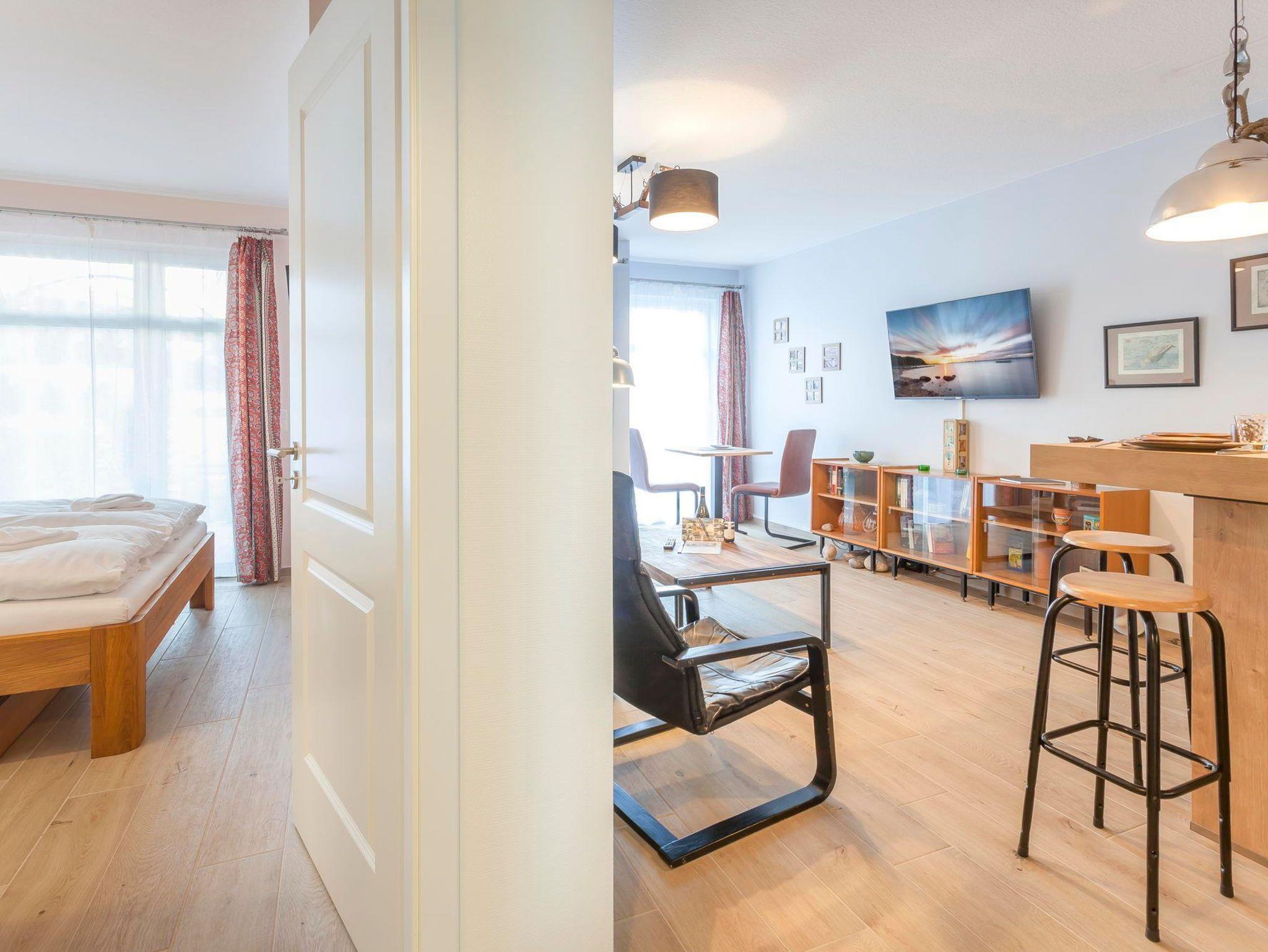 Das kombinierte Wohn- und Esszimmer verfügt über eine Ledersitzgarnitur, einen großformatigen Flachbild-TV, eine sehr gut ausgestattete Küchenzeile und eine vorgelagerte Terrasse, auf der man im wohnungseigenen Strandkorb seinen Morgenkaffee genießen oder an lauen Sommerabenden entspannt draußen sitzen kann.