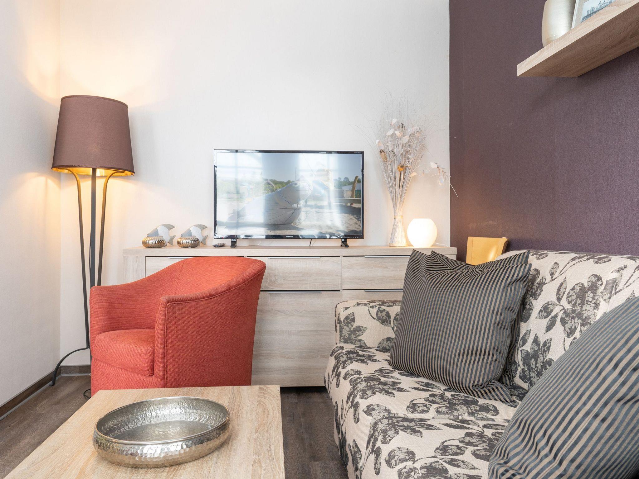 Die Ferienwohnung verfügt über 3 Fernseher, kostenfreies WLAN und die Erstausstattung an Bettwäsche ist inklusive. Das Schlafzimmer mit Verdunklung verfügt über ein Doppelbett, im Wohnzimmer befindet sich zusätzlich eine Doppelschlafcouch. Darüber hinaus verfügt die Ferienwohnung über ein Bad mit Dusche sowie ein separates WC. Die voll ausgestattete, offene Küche mit Backofen, Mikrowelle, Geschirrspüler, Kaffeemaschine und Toaster lässt keine Wünsche offen. Ein Fernseher inkl. 3 Sky-Sender rundet die hochwertige Einrichtung ab.