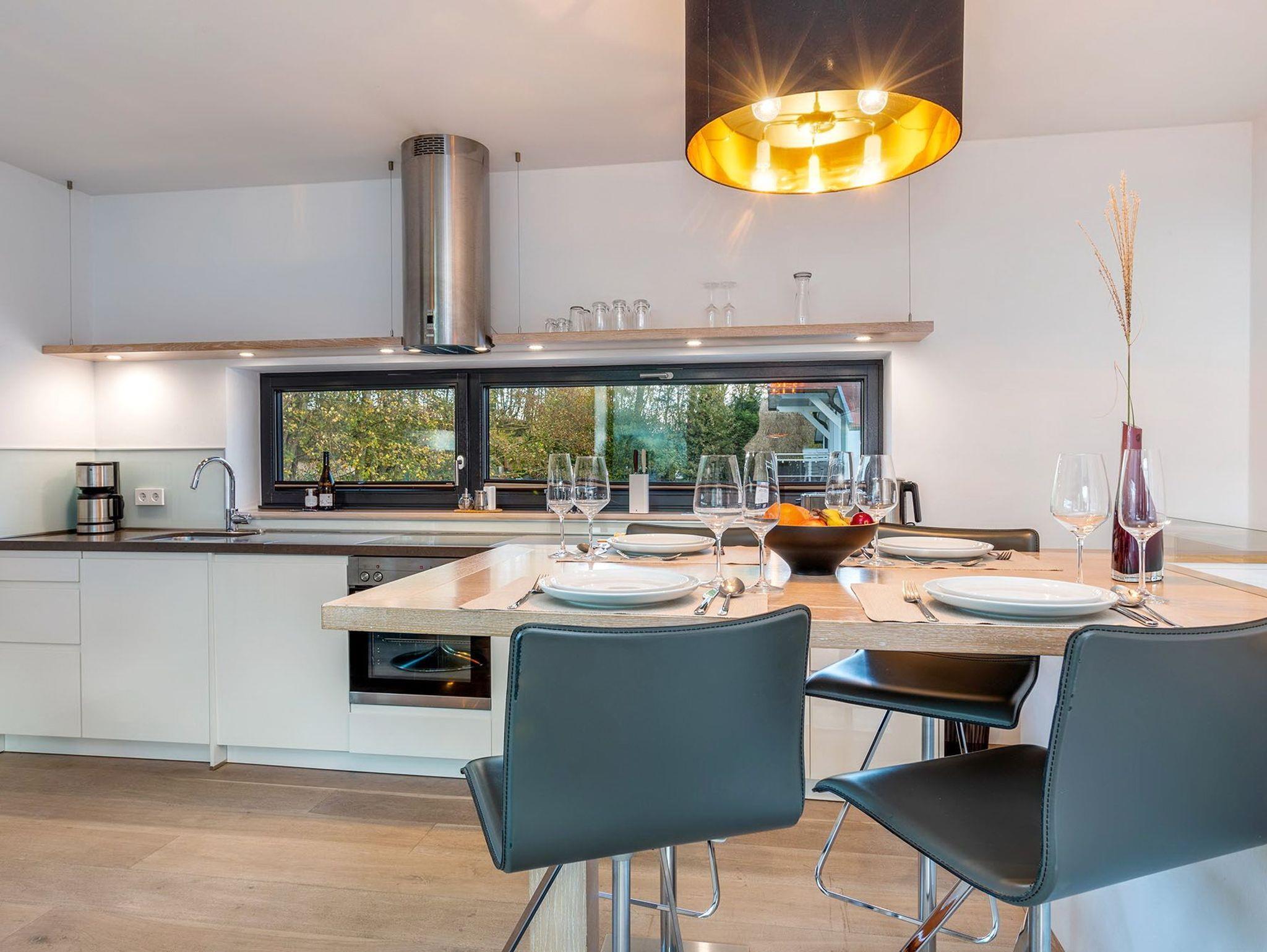 Das 3-Raum-Penthouse Wellenreiter erstreckt sich über das erste Obergeschoss und das Dachgeschoss der Strandvilla und erfüllt auf 93 Quadratmetern Wohnfläche alle Urlaubsträume von bis zu vier Personen. Hochwertige Leder- und Eichenmöbel, pointierte Dekorationen und modernste Unterhaltungselektronik zaubern ein Ambiente der Spitzenklasse. Eines der vielen Highlights ist dabei ganz sicher der geräumige Wohn- und Essbereich mit seiner integrierten Designerküche, deren exklusive Ausstattung Funktionalität und Komfort in vollkommener Weise verbindet.