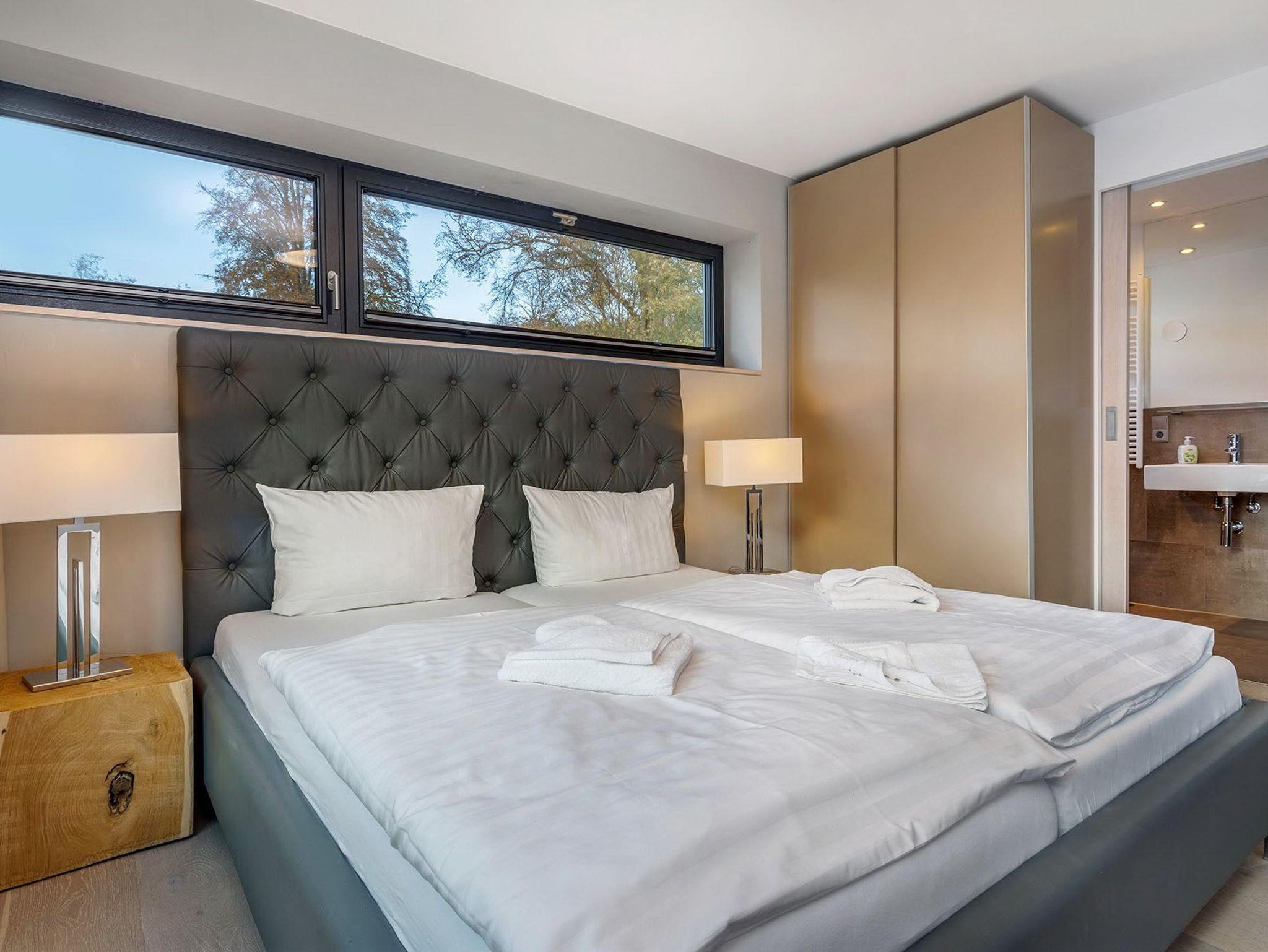 Auf der großen, nach Südwesten ausgerichteten Dachterrasse laden unter dem vollautomatischen Sonnensegel bequeme Sitzmöbel und ein BBQ-Grill zum gemütlichen Verweilen ein. Darunter warten im ersten Obergeschoss zwei elegant eingerichtete Schlafzimmer und exklusive Ensuite-Bäder darauf, von Ihnen entdeckt zu werden. Hier befindet sich auch die finnische Farblicht-Sauna, die Sie jederzeit für Ihr individuelles Verwöhnprogramm nutzen können. Die im gesamten Appartement vorhandene Fußbodenheizung sorgt für ein angenehmes Raumklima und unterstützt Ihre Entspannung zusätzlich.