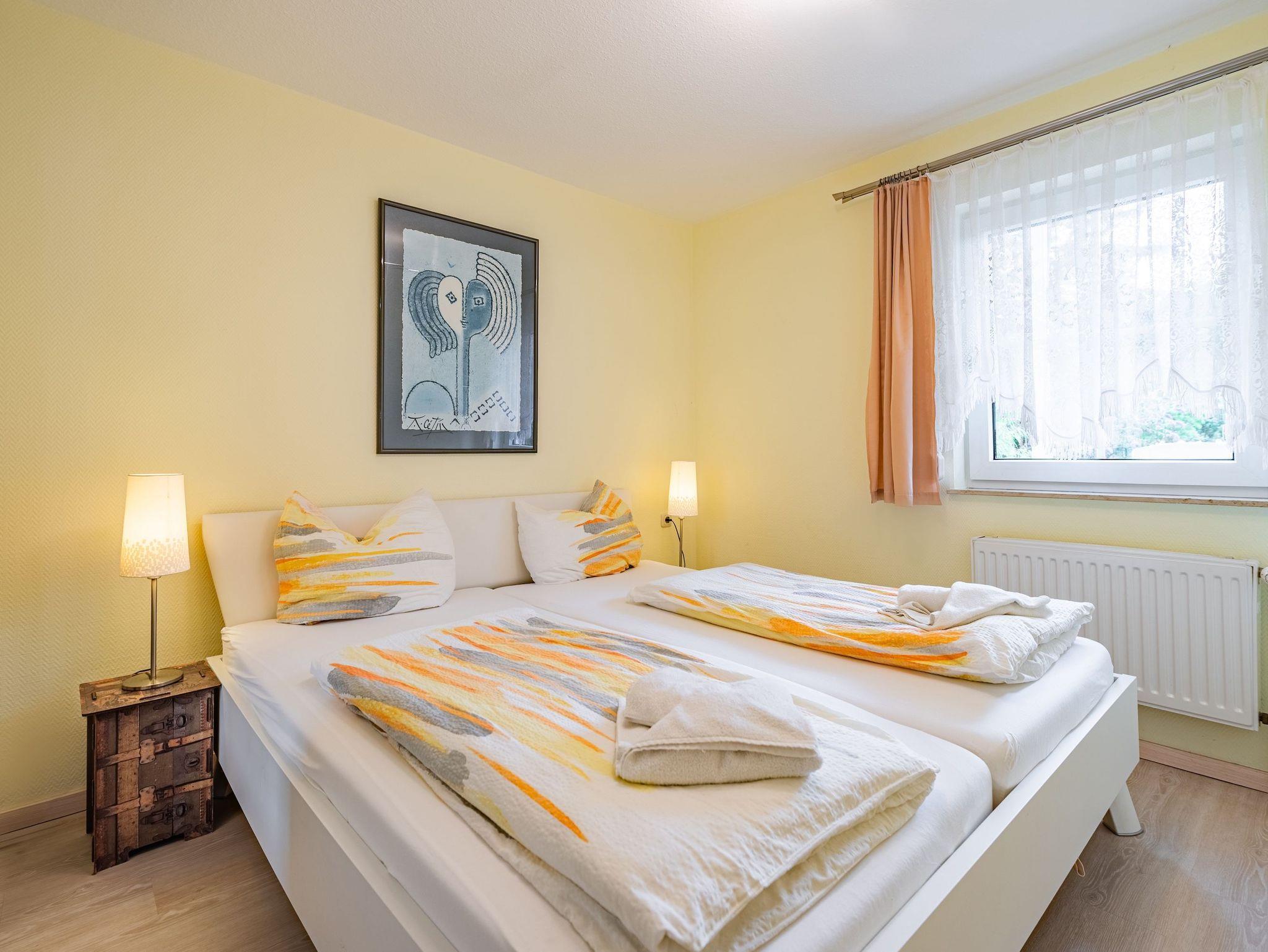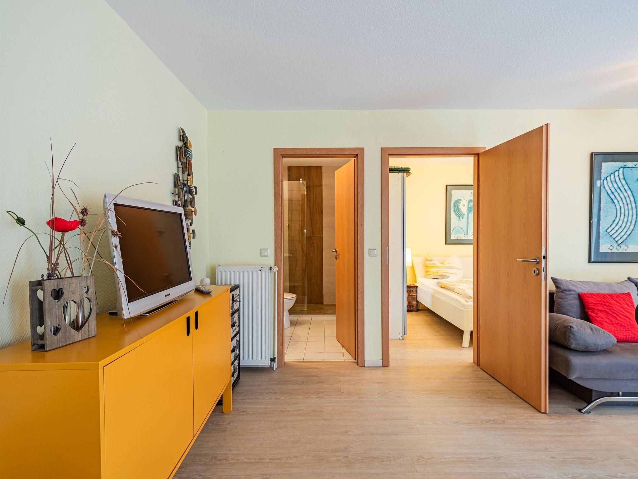 Das separate Schlafzimmer sorgt für erholsame Nächte, während das moderne Badezimmer mit seiner klaren Gestaltung zum Frischwerden nach einem Strandtag oder einer Radtour einlädt.