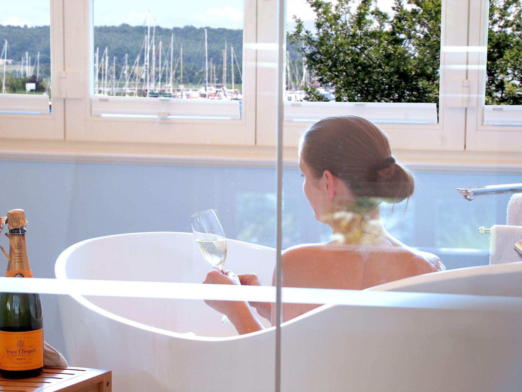 Das geflieste Bad ist durch eine Glasfront vom Schlafzimmer getrennt und verfügt über eine optisch extrem ansprechende, freistehende, englische Badewanne mit einem atemberaubenden Blick über die Lankener Bek in den Yachthafen von Seedorf mit den wundervollen Segelbooten. So kann man herrlich entspannen - unabhängig vom Wechsel der Jahreszeiten.
