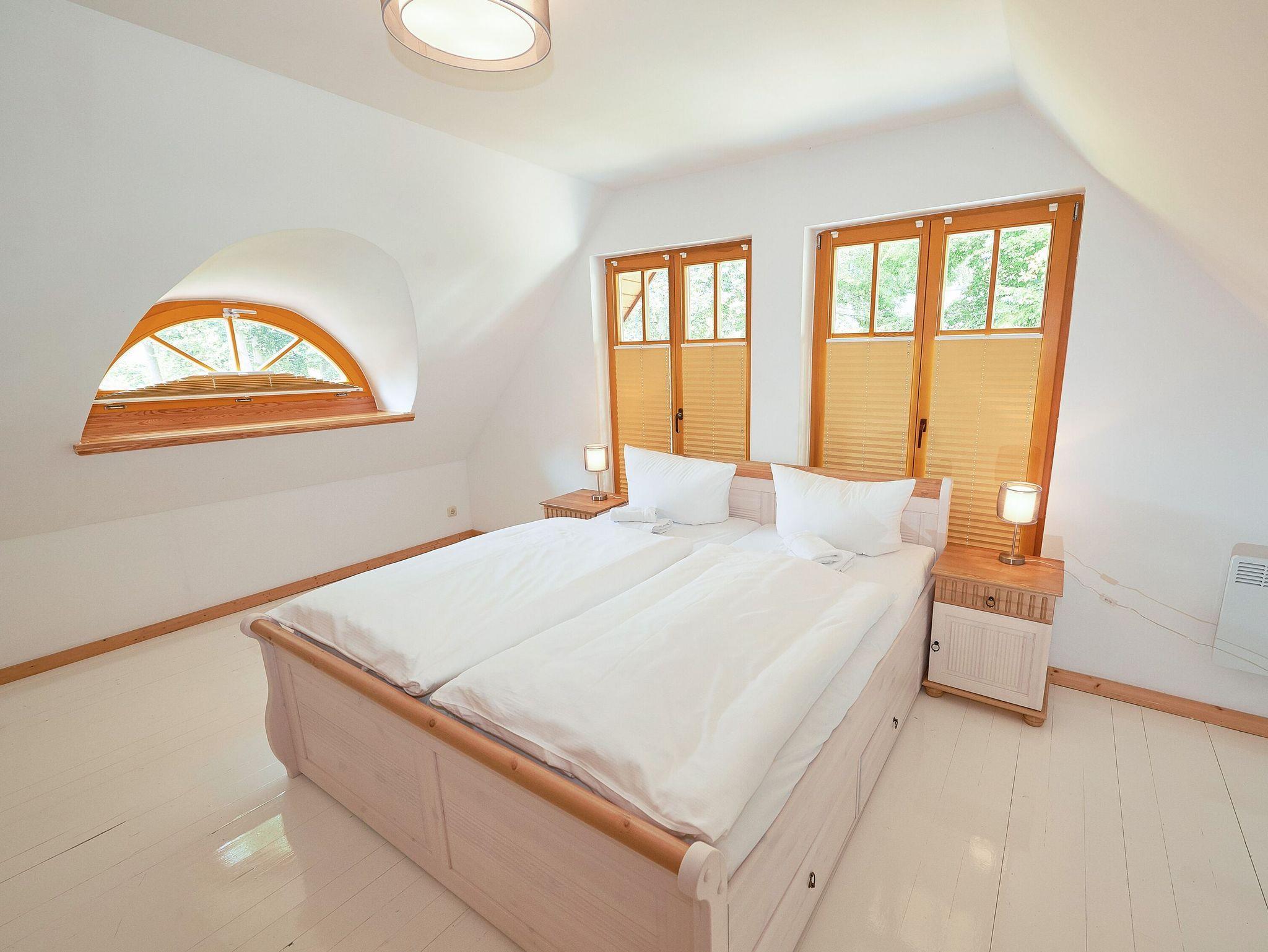 Die Haushälfte 4 begrüßt Sie an den hinteren Außenseite des Strandschlösschens Sellin mit auf zwei Ebenen verteilten Wohnfläche von rund 100 m² und vorgelagerter Terrasse. Wie in den anderen Haushälften auch, befindet sich das durch die offenen Balken besonders gemütlich wirkende Wohnzimmer im Erdgeschoss.