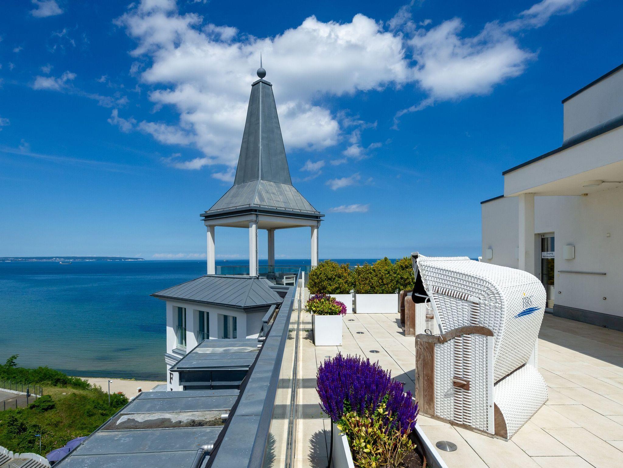 Die Dachterrasse der „Meerblick [&] SPA“ ist ein besonderes Highlight auf ca. 45 m² haben Sie Ihr eigenes Meerblick Refugium. Unter der Turmspitze stehen für Sie bequeme Loungemöbel bereit, Sonnenliegen laden zum Sonnenbaden ein.