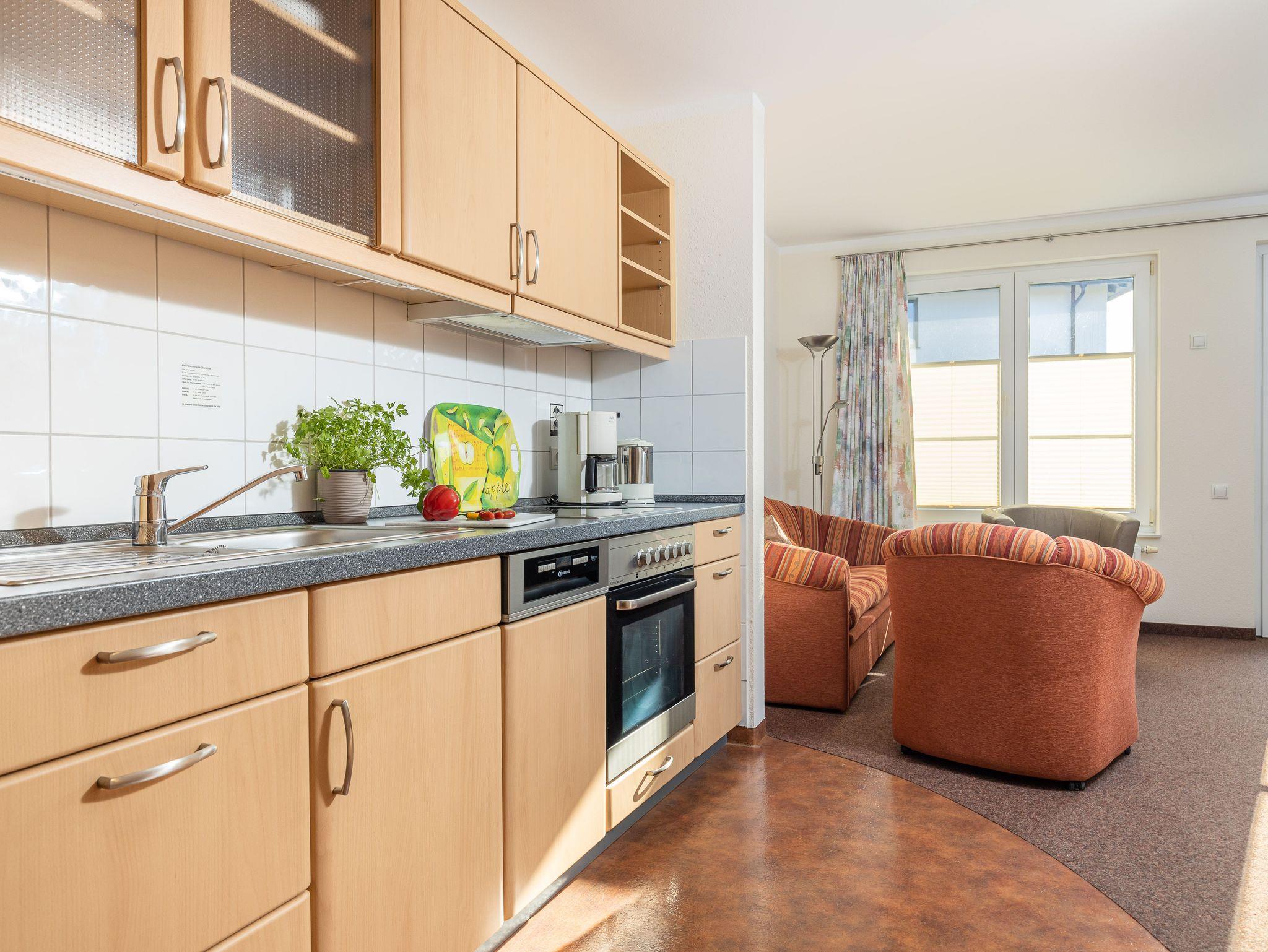 Die Küchenzeile ist mit einem Kühlschrank, einem Ceranfeld mit Backofen, einer Spülmaschine und einer Mikrowelle ausgestattet. Ebenso finden sich hier alle nötigen Küchenkleingeräte (Wasserkocher, Kaffeemaschine, Toaster..).