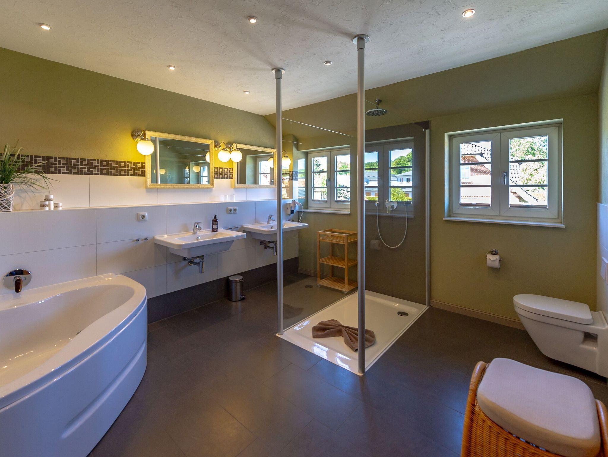 Bad mit ebenerdiger XXL-Dusche, Eckbadewanne, Sauna, Doppelwaschtisch, WC, Handtuchtrockner und Fußbodenheizung