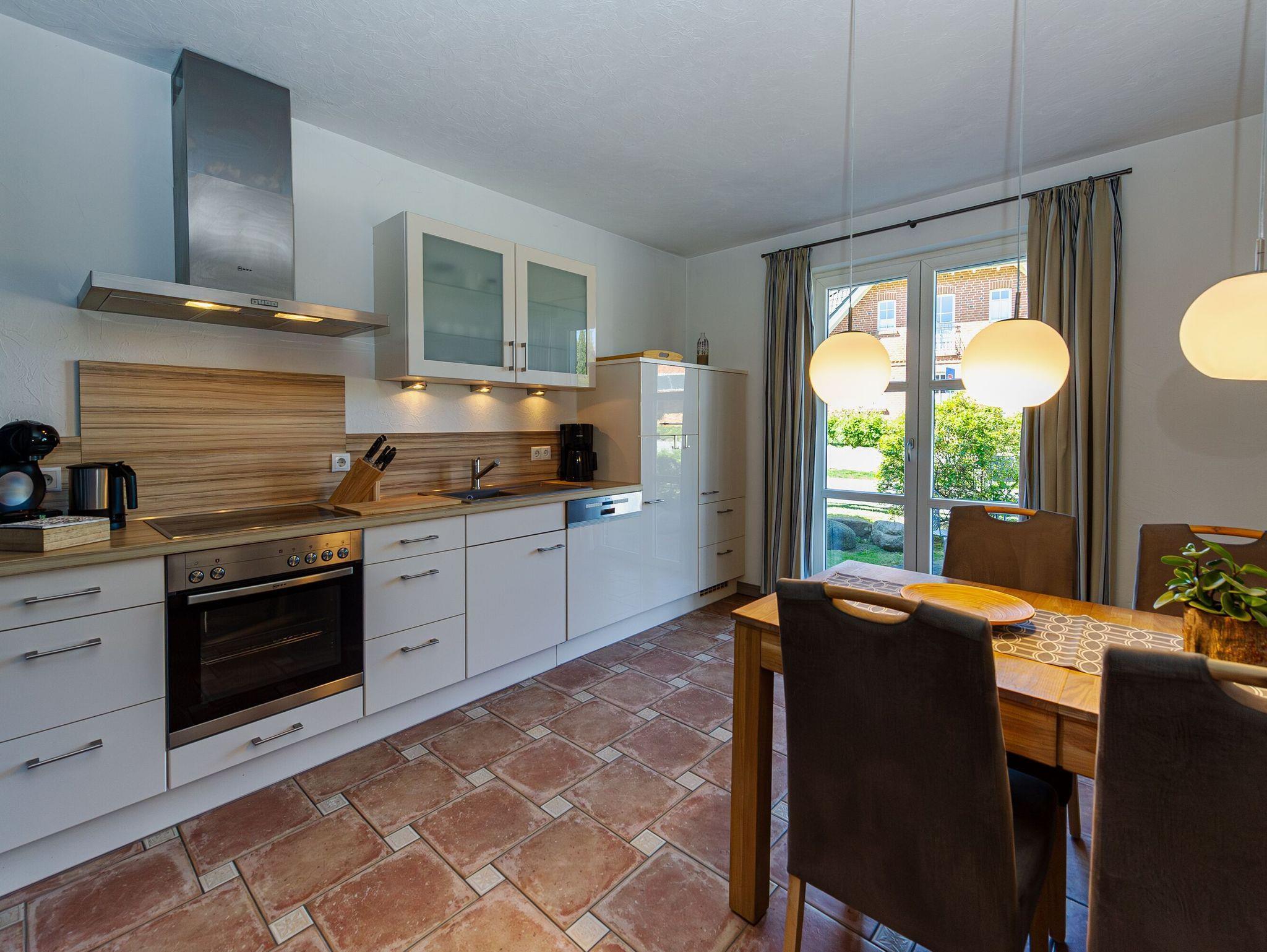 Küche u.a. mit Cerankochfeld, Backofen, Mikrowelle, Geschirrspüler, Kühlschrank mit Gefrierfach, Jura-Kaffeevollautomat mit Coffee all in, Toaster, Wasserkocher. Esstisch, Fußbodenheizung