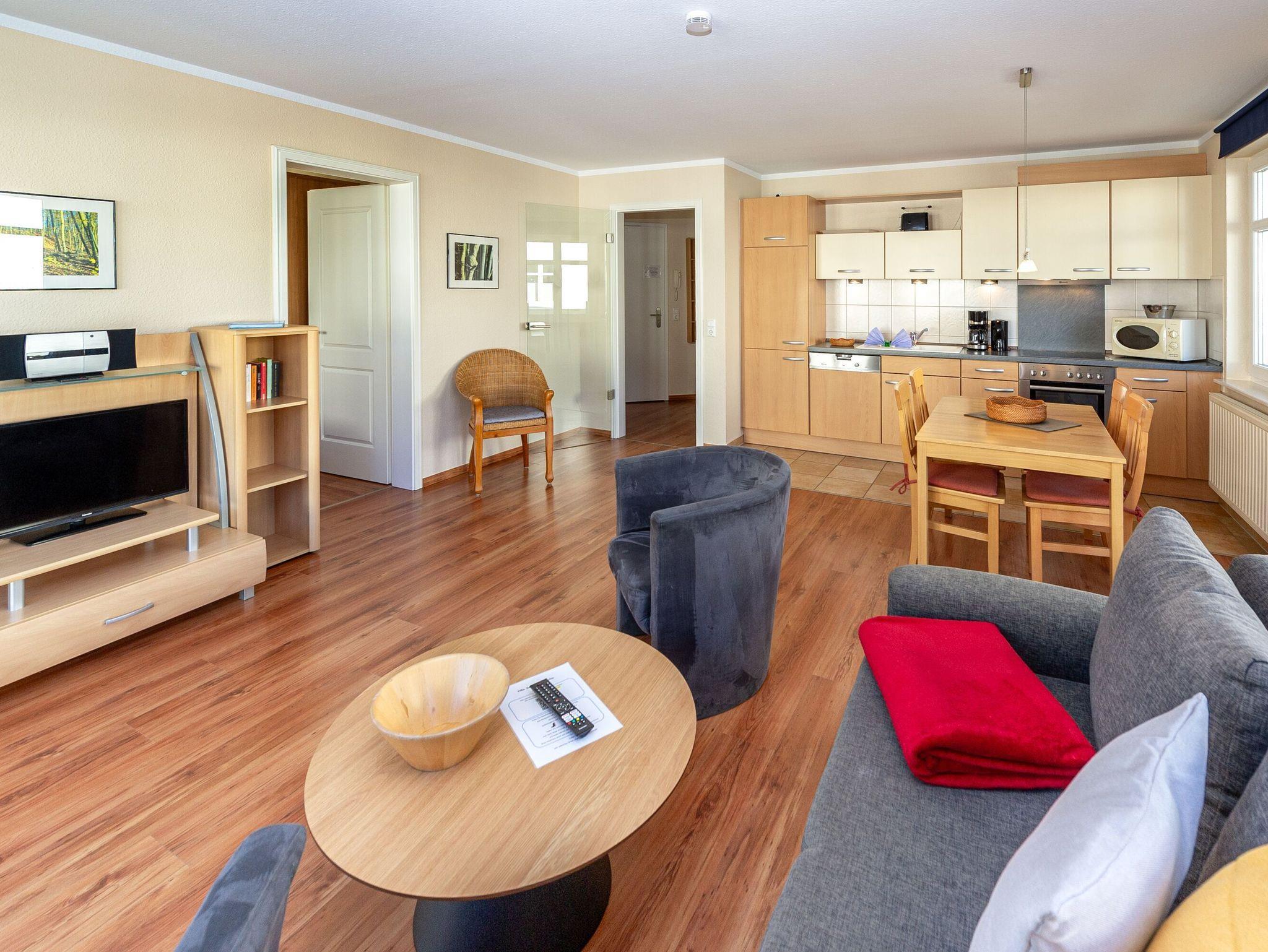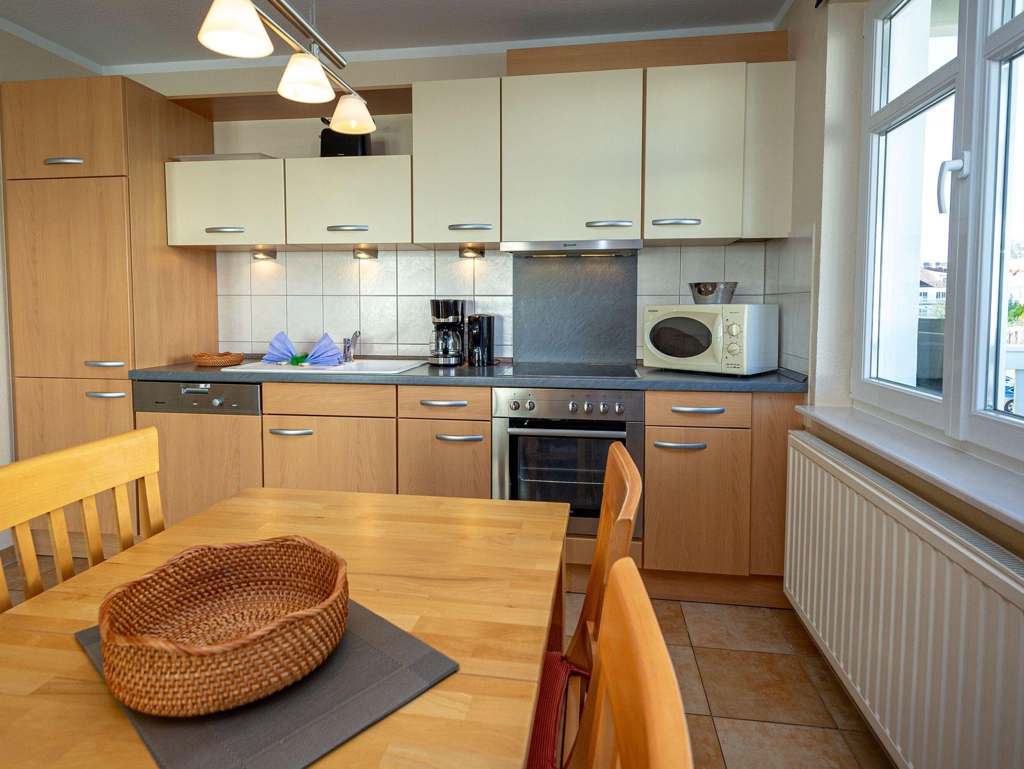Die harmonisch im Wohnbereich integrierte Küchenzeile ist ausgestattet mit einem Kühlschrank mit Gefrierfach, einem 4-Platten-Cerankochfeld, einem Backofen, einer Geschirrspülmaschine, einer Mikrowelle, Wasserkocher, Kaffeemaschine, Toaster und diversem Kleininventar, das die Küchenausstattung komplettiert.