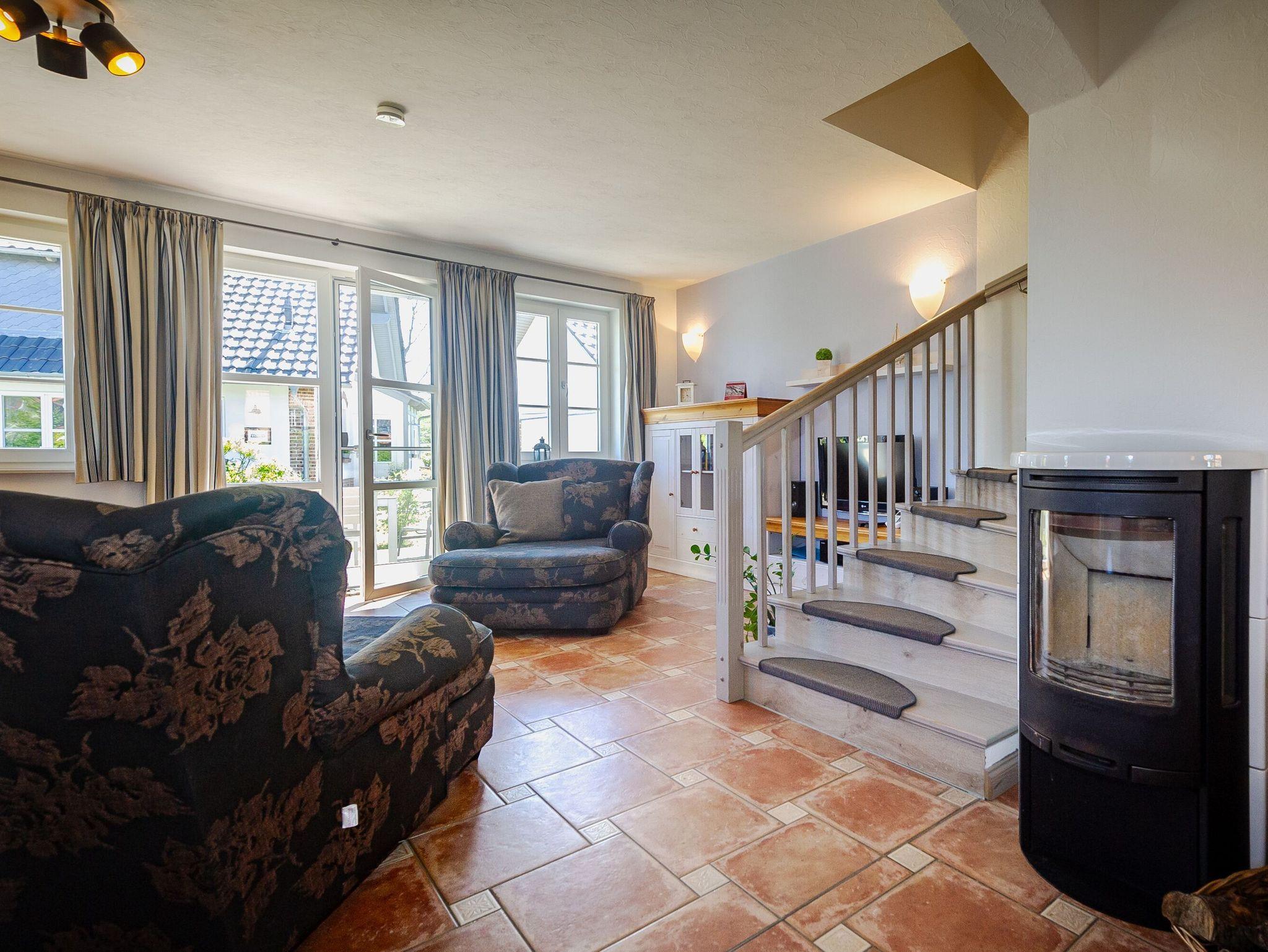 Wohnzimmer u.a. mit Kaminofen, Couch, XXL-Ohrensesseln, Flatscreen-TV, Stereoanlage mit DVD-Player, Fußbodenheizung