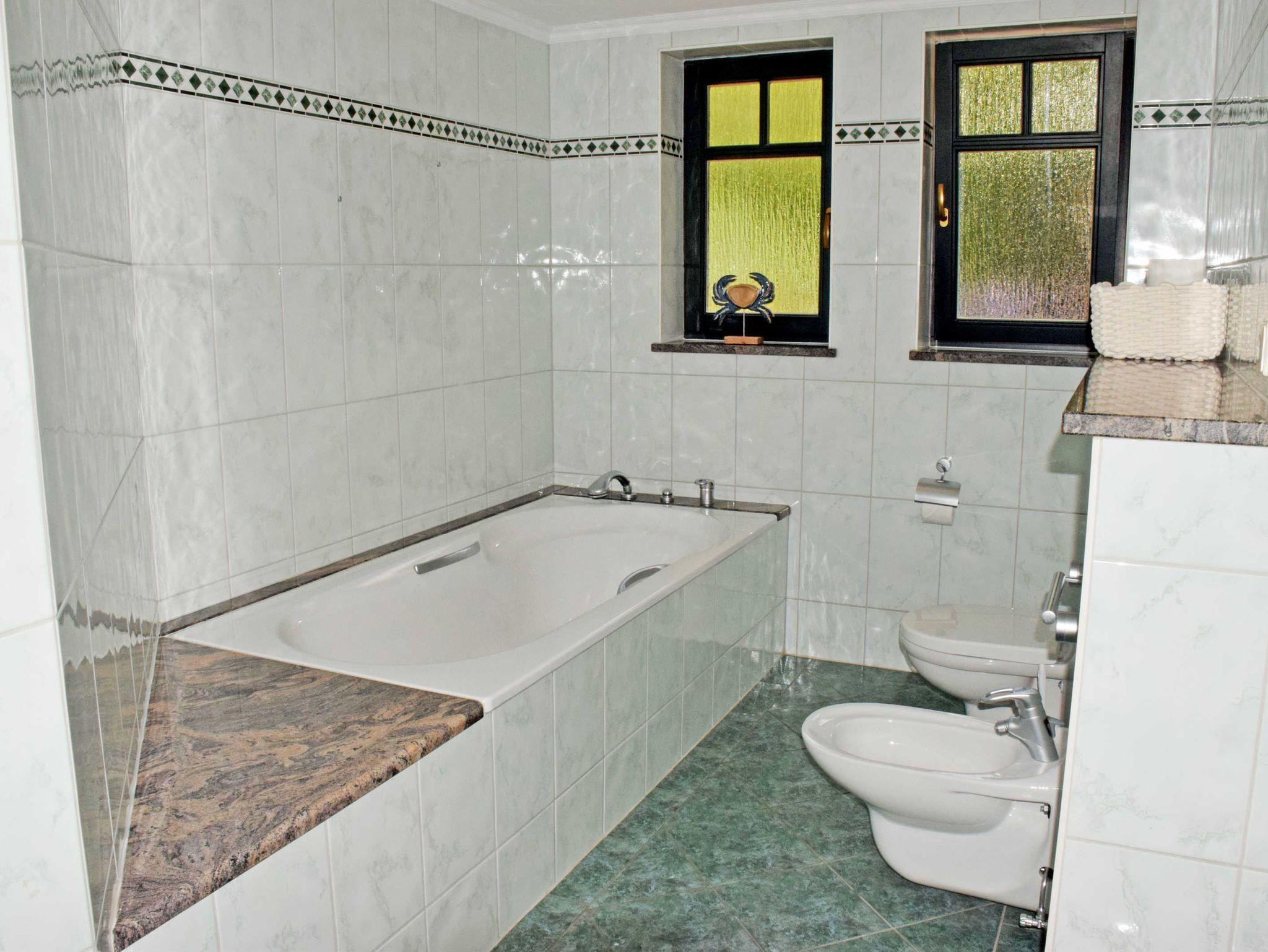 Die beiden Bäder sind mit Dusche (1 x zusätzlich Badewanne), WC und Waschtisch ausgestattet und verfügen über Tageslicht. Eine Waschmaschine kann in der Anlage gegen Entgeld mitgenutzt werden.