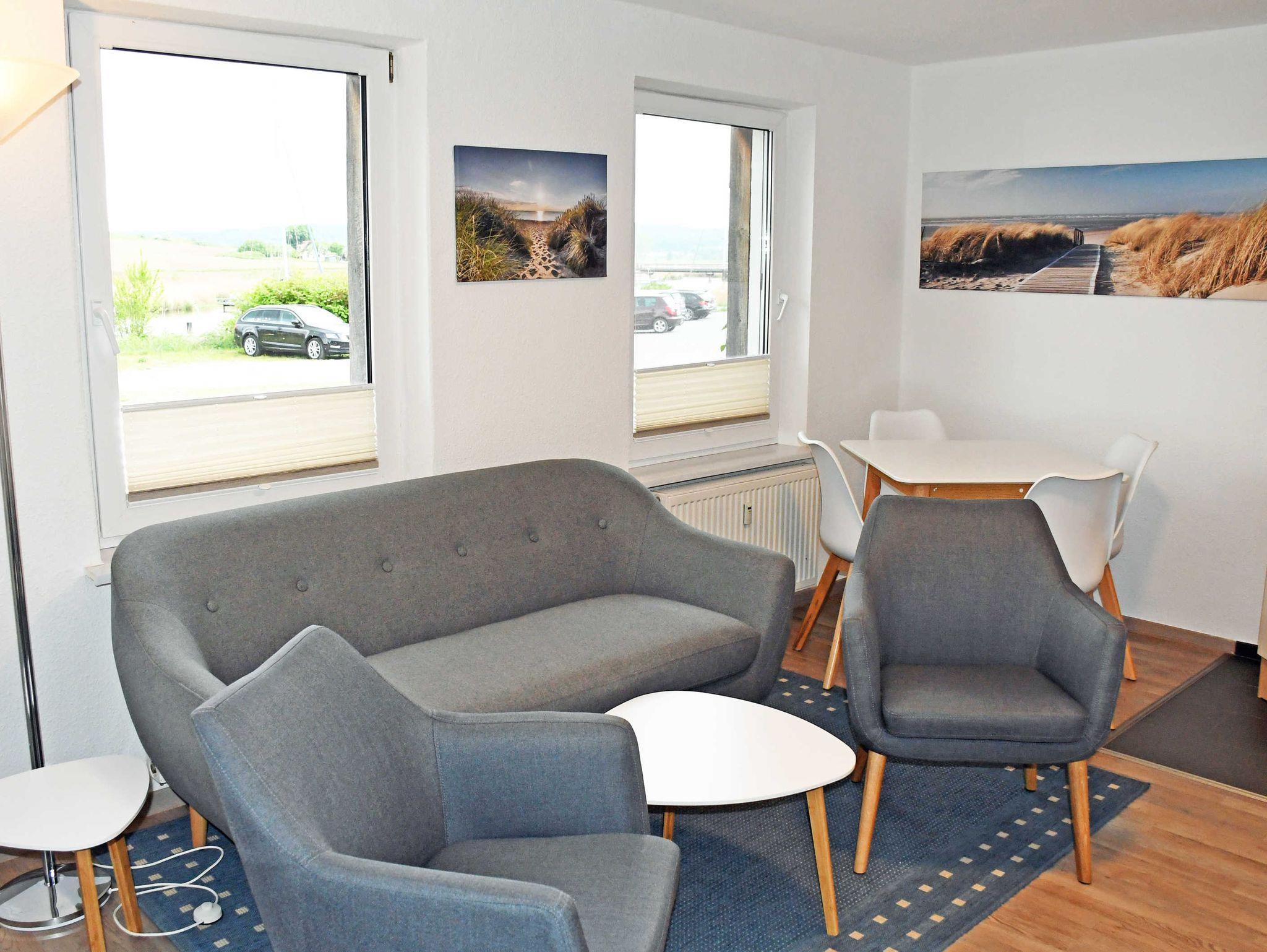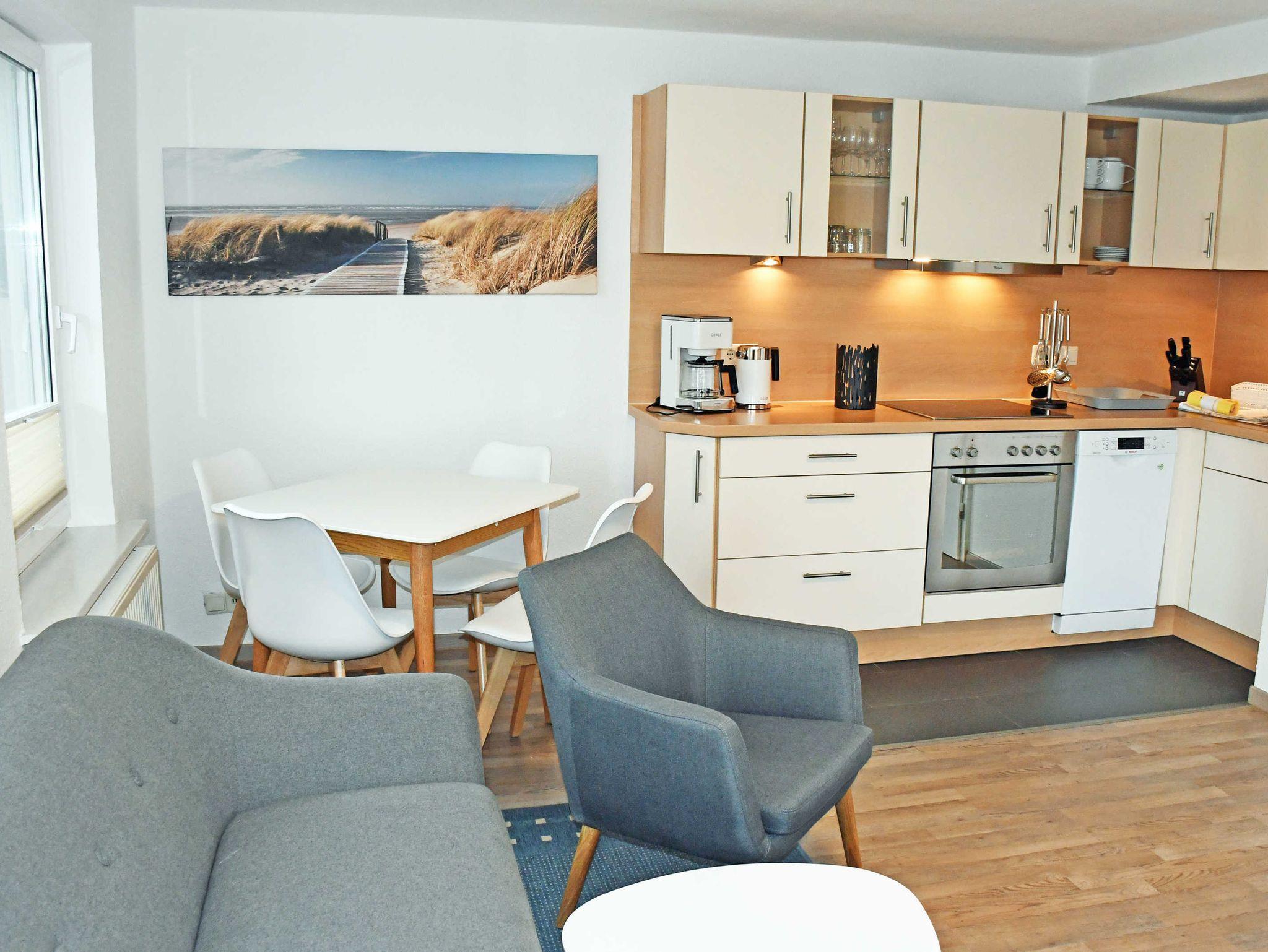 Über einen Flur kommen Sie in den Wohnraum. Hier stehen eine Couch, ein Tisch mit Sesseln und ein modernes Flachbild-TV-Gerät. Die Küchenzeile im Wohnbereich, ist mit Elektroherd mit Ceranfeld, Backofen, Kühlschrank mit Gefrierfach, Kaffeemaschine, Wasserkocher, Toaster komplett ausgestattet. Hier steht auch ein Esstisch mit Stühlen.