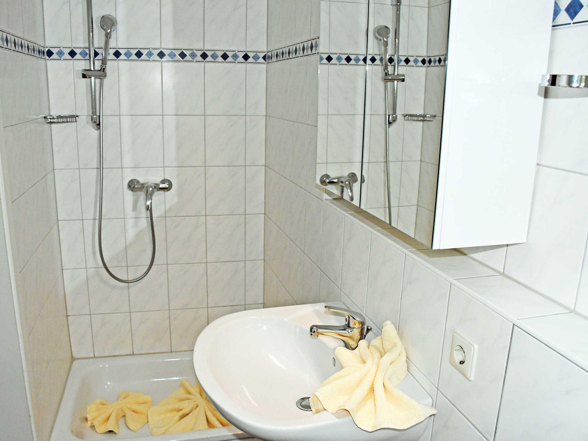 Das Bad ist mit Dusche, WC und Waschtisch ausgestattet und verfügt über Tagelslicht.