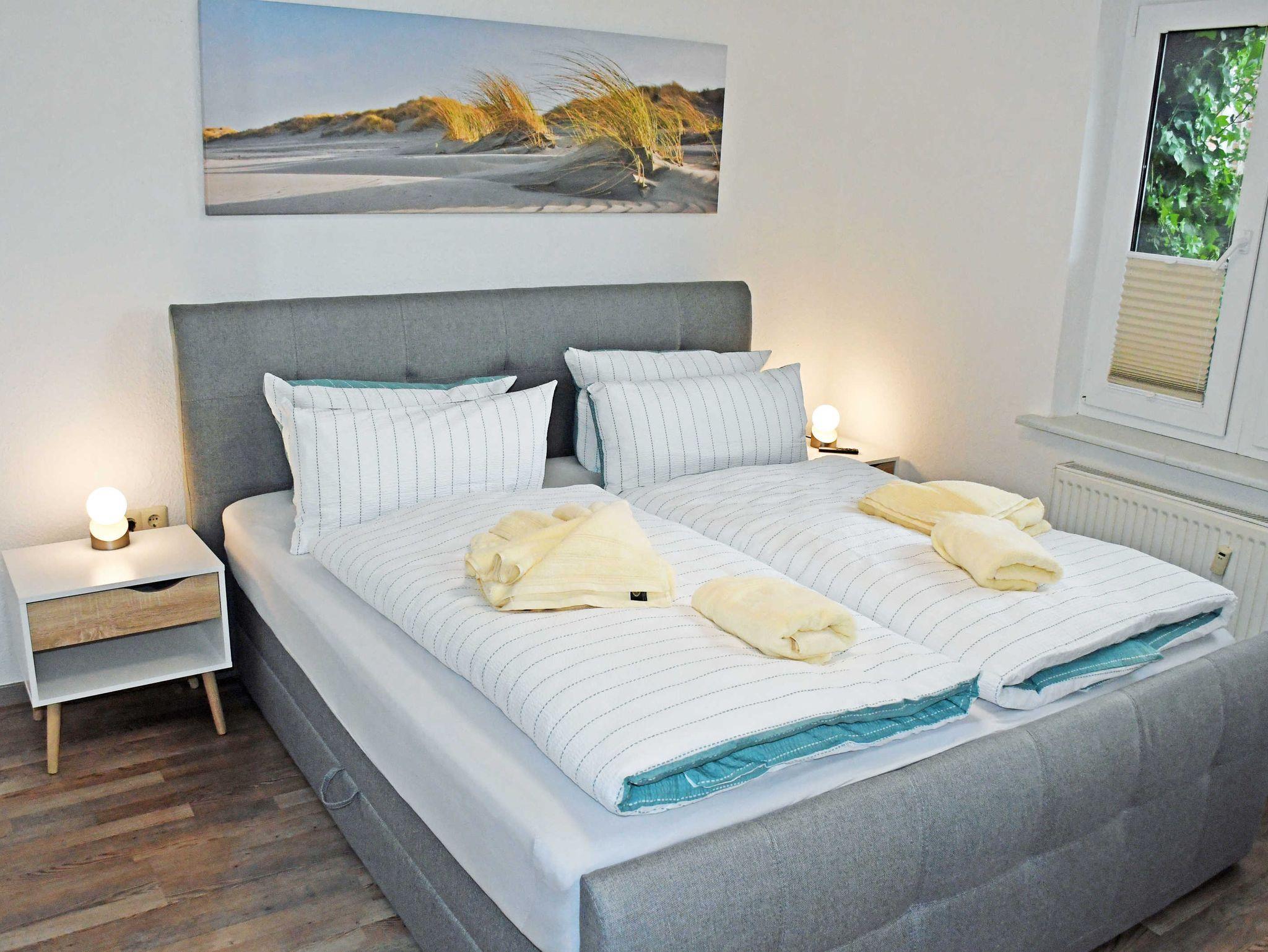 Im Schlafzimmer befinden sich ein bequemes Doppelbett mit Nachttischen und Leselampen sowie ein Kleiderschrank. Auf Wunsch kann hier ein Kinderreisebett und ein Hochstuhl bereit gestellt werden. Für 2 Gäste kann auf der Couch im Wohnraum eine Aufbettung hergestellt werden.