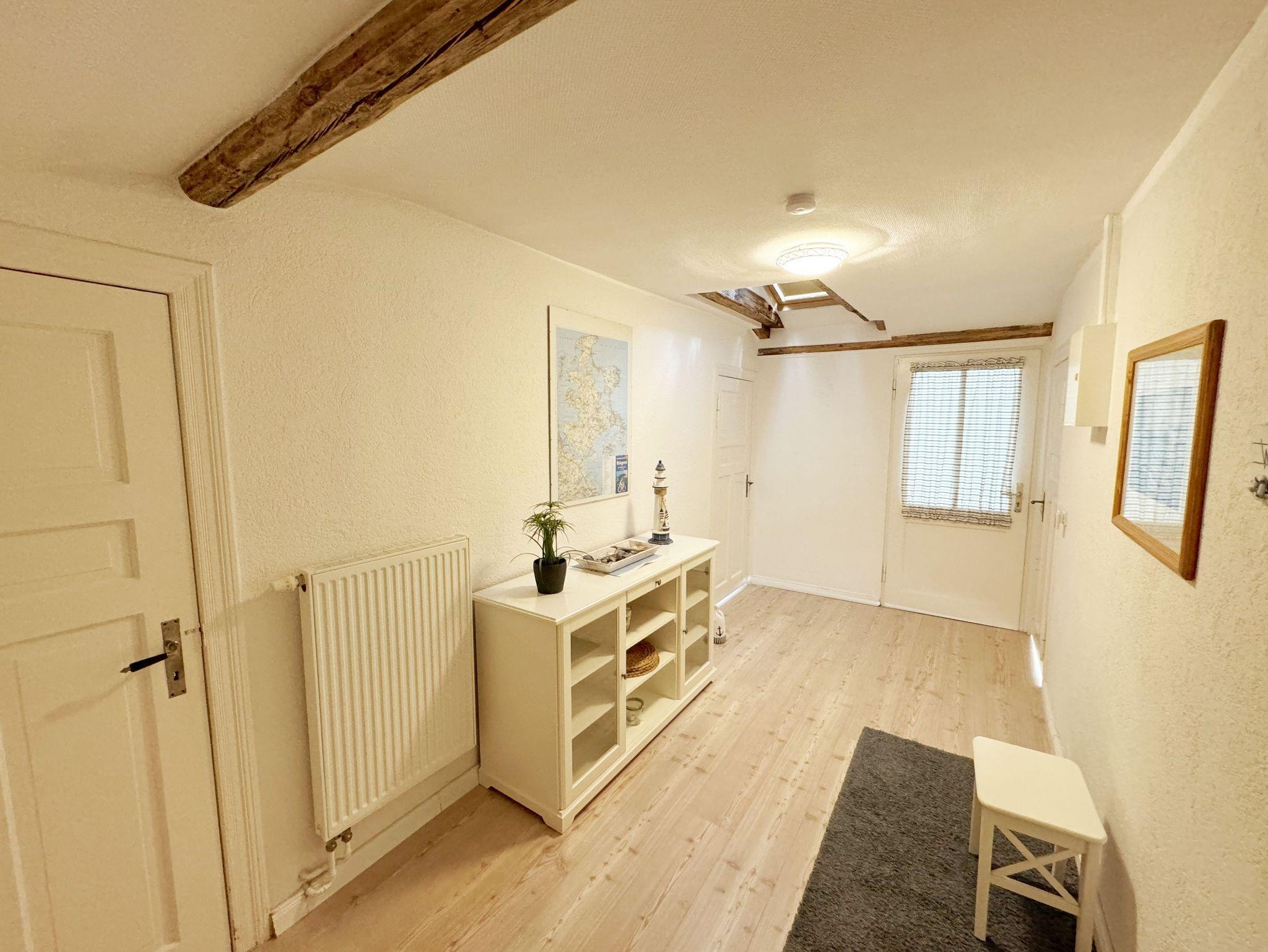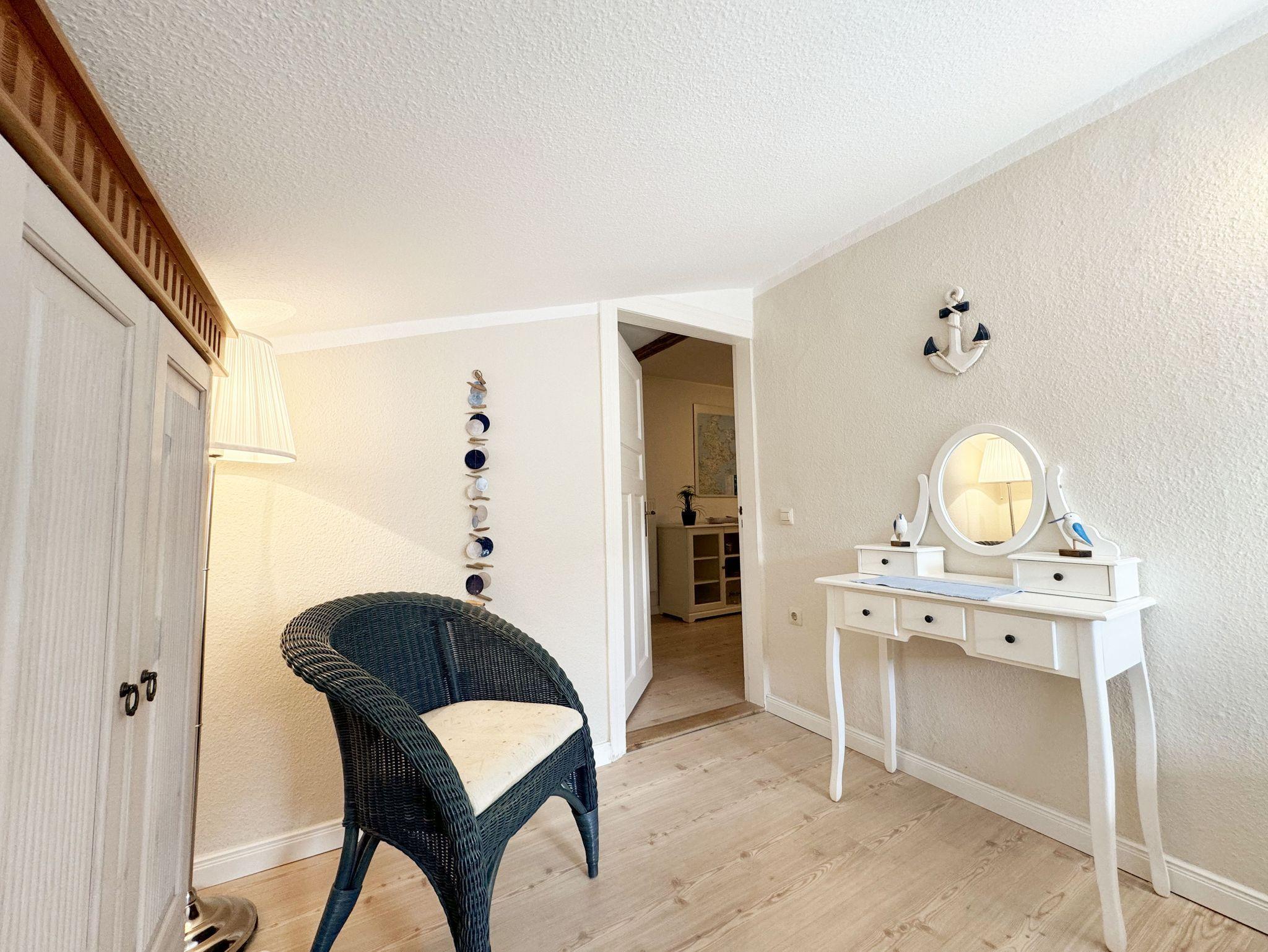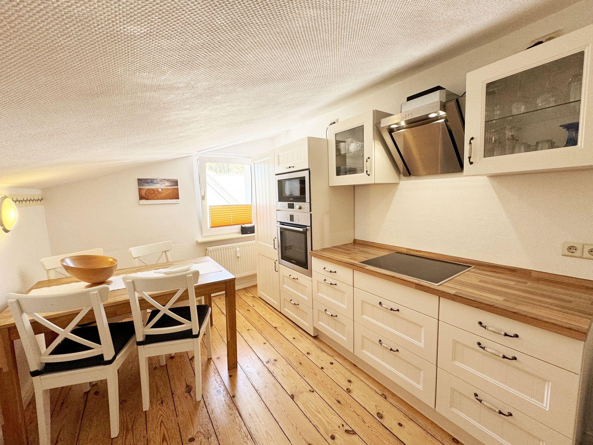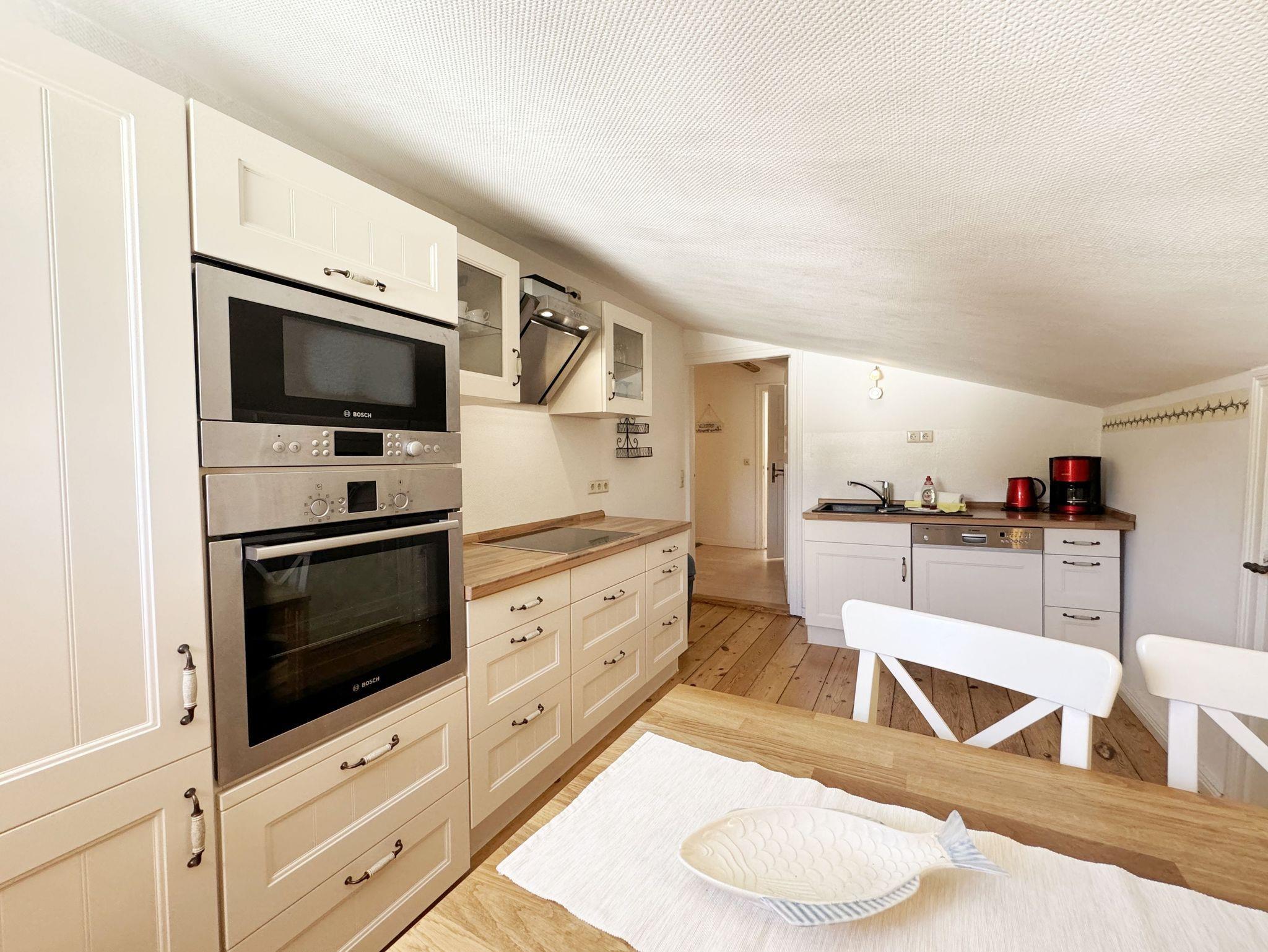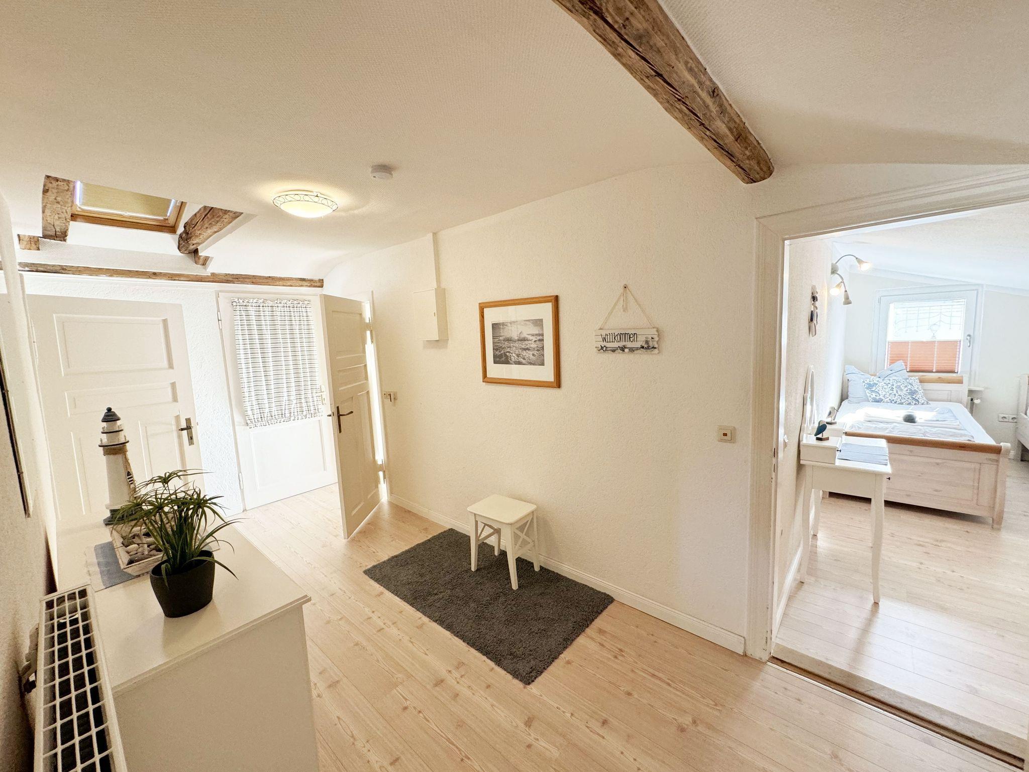 Über einen großzügigen hellen Flur gelangt man in die Ferienwohnung 4. Die Ferienwohnung befindet sich im Dachgeschoss des Hauses. Auf ca. 85 m² bietet sie ausreichend Platz für maximal 4 Erwachsene + 2 Kleinkinder bis 3 Jahre im Kinderreisebett. Die maritim eingerichtete Nichtraucherferienwohnung besteht aus einem großzügigen Wohnraum mit einer gemütlichen Couch, Couchtisch sowie ein TV-Board mit Flachbild-TV und DVD-Player. Diverse DVDs und Gesellschaftsspiele stehen Ihnen zur Verfügung. Auch auf einen Internetanschluss (WLAN) müssen Sie nicht verzichten. Dieser ist für Sie inklusive. Die separate Küche verfügt über eine Einbauküche mit einem Herd mit Cerankochfeld, einem Backofen, einem Kühlschrank, einem Gefrierschrank, einer Spülmaschine, einer Mikrowelle, einem Toaster, einer Kaffeemaschine und einem Wasserkocher. Ein gemütlicher Essplatz rundet den Raum ab. In dieser Ferienwohnung befinden sich zwei getrennte Schlafräume. Im ersten Schlafraum befindet sich ein Doppelbett (1,80m x 2,00m), verstellbare Lattenroste, Nachttischablagen mit Beleuchtung und ein großer Kleiderschrank mit Ganzkörperspiegel. Im zweiten kleineren Schlafzimmer befinden sich zwei massive Einzelbetten (1,00m x 2,00m), welche auch als Doppelbett gestellt werden können, verstellbare Lattenroste, Nachttischablagen mit Beleuchtung sowie eine Wäschekommode. In beiden Schlafzimmern sorgen ein Insektenschutzgitter sowie eine Verdunklungsmöglichkeit für einen angenehmen Schlaf. Das Tageslicht-Bad befindet sich direkt neben dem ersten Schlafzimmer und verfügt über einen Waschplatz, ein WC, einen Handtuchtrockner, eine Badewanne mit Handbrause, einen Kosmetikspiegel sowie einen Fön. Weiterhin haben Sie einen geräumigen Flur mit Garderobe und einen Abstellraum. Hier befinden sich unteranderem Reinigungsutensilien, sowie einen Staubsauger und einen Wäscheständer. Für unsere kleinen Gäste stehen Ihnen ein Kinderreisebett sowie ein Hochstuhl inklusive zur Verfügung. Ein PKW-Stellplatz (Nr.04) und eine abschließbare Fahrradunterstellmöglichkeit befinden sich direkt am Haus. Direkt am Haus, neben dem Parkplatz befindet sich eine kleine Sitzgelegenheit, die gerne zum Entspannen genutzt werden darf. Haustiere sind nicht erlaubt. Die Erstausstattung eines Wäschepaketes (komplette Bettwäsche, 1 Duschhandtuch, 2 kleine Handtücher) können Sie bis 14 Tage vor Anreise gegen einen Aufpreis dazu buchen oder durch eigene ergänzen. Ab 2 gebuchten Paketen erhalten Sie einmalig 1 Geschirrhandtuch und 1 Duschvorleger hinzu. Wir wünschen Ihnen einen traumhaften und angenehmen Urlaub an der Ostsee, erholen Sie sich gut.