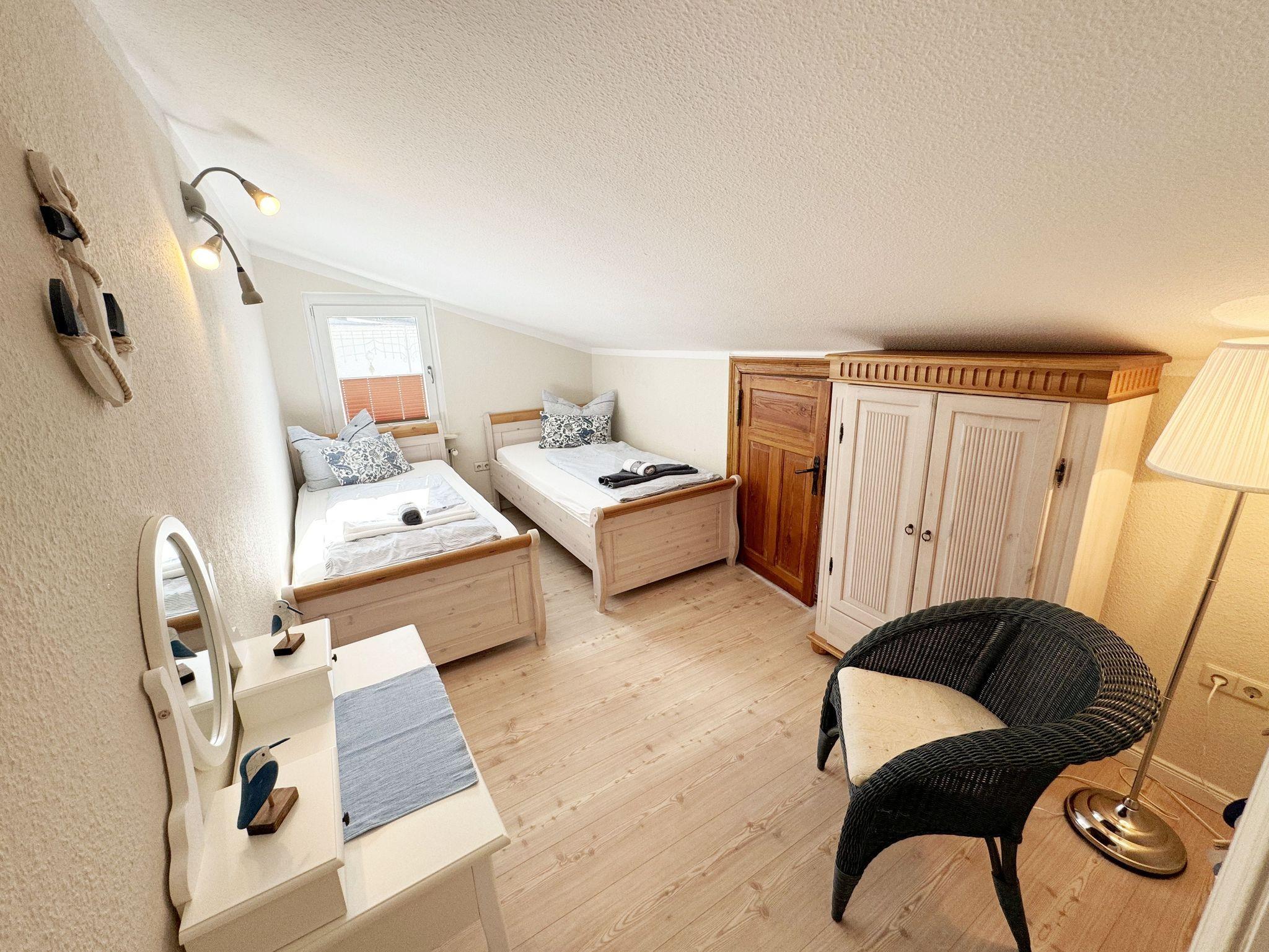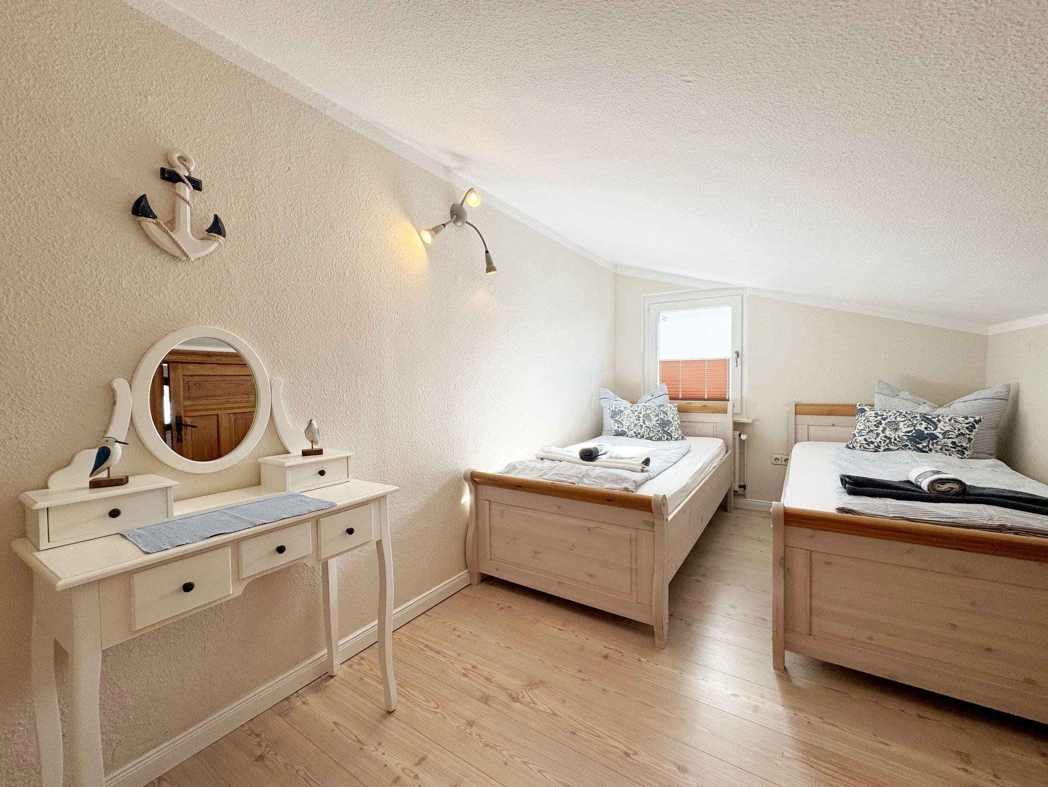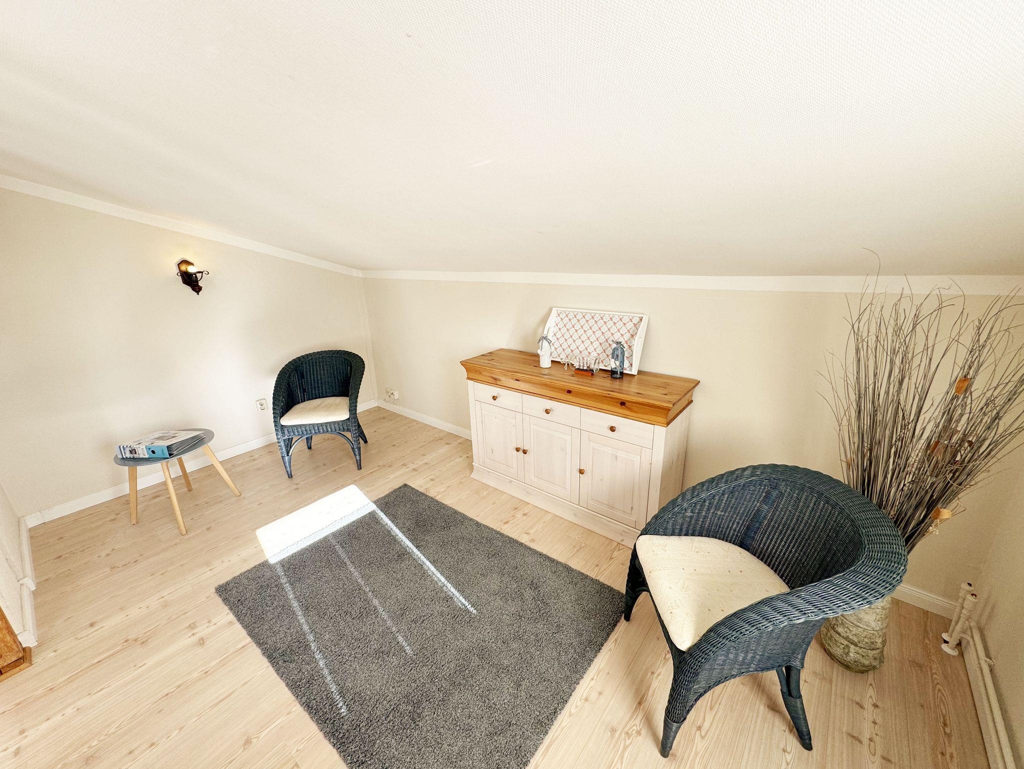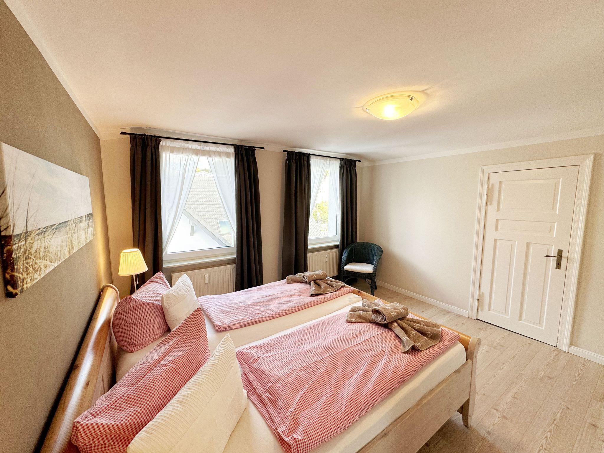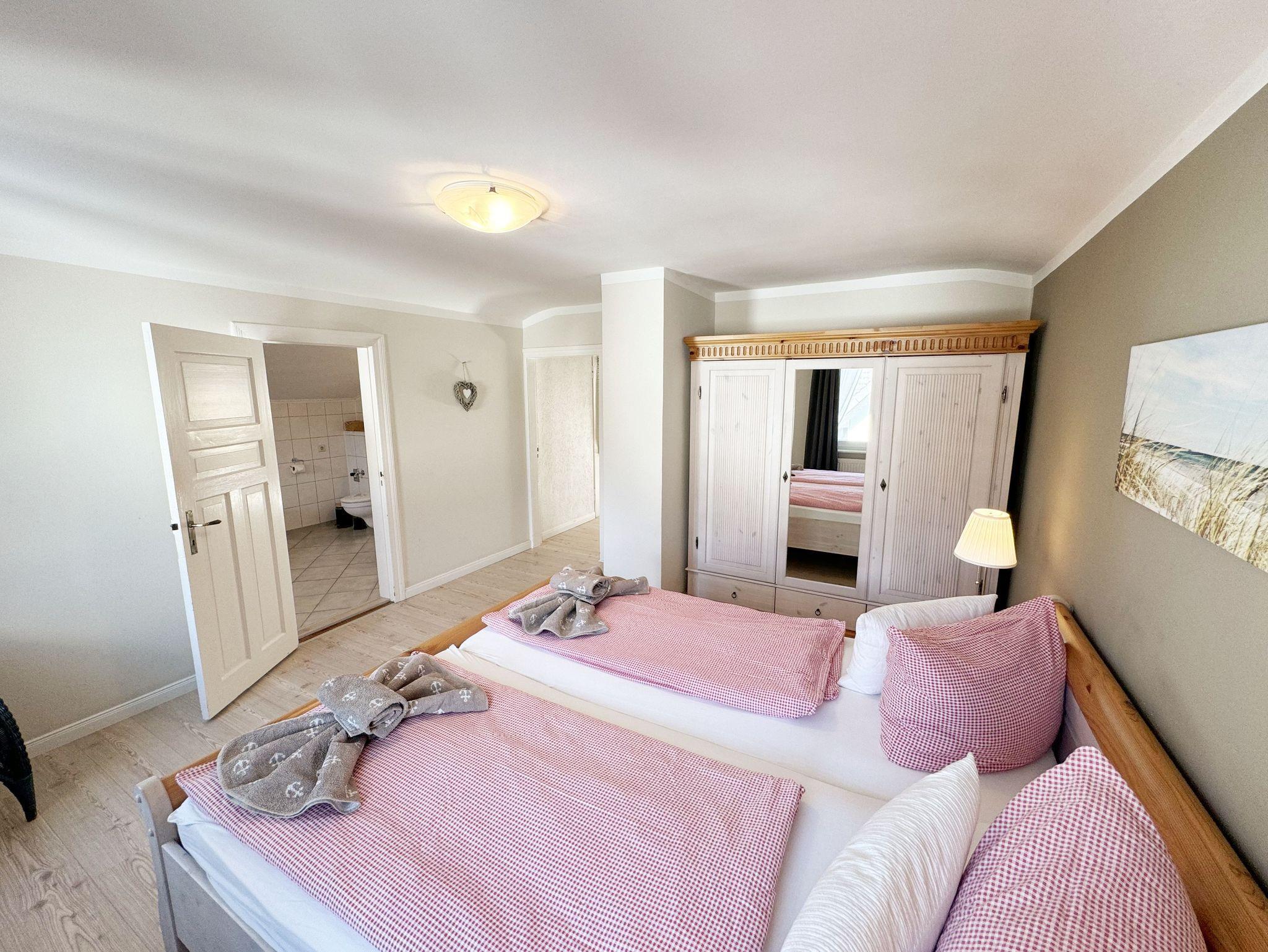 Über einen großzügigen hellen Flur gelangt man in die Ferienwohnung 4. Die Ferienwohnung befindet sich im Dachgeschoss des Hauses. Auf ca. 85 m² bietet sie ausreichend Platz für maximal 4 Erwachsene + 2 Kleinkinder bis 3 Jahre im Kinderreisebett. Die maritim eingerichtete Nichtraucherferienwohnung besteht aus einem großzügigen Wohnraum mit einer gemütlichen Couch, Couchtisch sowie ein TV-Board mit Flachbild-TV und DVD-Player. Diverse DVDs und Gesellschaftsspiele stehen Ihnen zur Verfügung. Auch auf einen Internetanschluss (WLAN) müssen Sie nicht verzichten. Dieser ist für Sie inklusive. Die separate Küche verfügt über eine Einbauküche mit einem Herd mit Cerankochfeld, einem Backofen, einem Kühlschrank, einem Gefrierschrank, einer Spülmaschine, einer Mikrowelle, einem Toaster, einer Kaffeemaschine und einem Wasserkocher. Ein gemütlicher Essplatz rundet den Raum ab. In dieser Ferienwohnung befinden sich zwei getrennte Schlafräume. Im ersten Schlafraum befindet sich ein Doppelbett (1,80m x 2,00m), verstellbare Lattenroste, Nachttischablagen mit Beleuchtung und ein großer Kleiderschrank mit Ganzkörperspiegel. Im zweiten kleineren Schlafzimmer befinden sich zwei massive Einzelbetten (1,00m x 2,00m), welche auch als Doppelbett gestellt werden können, verstellbare Lattenroste, Nachttischablagen mit Beleuchtung sowie eine Wäschekommode. In beiden Schlafzimmern sorgen ein Insektenschutzgitter sowie eine Verdunklungsmöglichkeit für einen angenehmen Schlaf. Das Tageslicht-Bad befindet sich direkt neben dem ersten Schlafzimmer und verfügt über einen Waschplatz, ein WC, einen Handtuchtrockner, eine Badewanne mit Handbrause, einen Kosmetikspiegel sowie einen Fön. Weiterhin haben Sie einen geräumigen Flur mit Garderobe und einen Abstellraum. Hier befinden sich unteranderem Reinigungsutensilien, sowie einen Staubsauger und einen Wäscheständer. Für unsere kleinen Gäste stehen Ihnen ein Kinderreisebett sowie ein Hochstuhl inklusive zur Verfügung. Ein PKW-Stellplatz (Nr.04) und eine abschließbare Fahrradunterstellmöglichkeit befinden sich direkt am Haus. Direkt am Haus, neben dem Parkplatz befindet sich eine kleine Sitzgelegenheit, die gerne zum Entspannen genutzt werden darf. Haustiere sind nicht erlaubt. Die Erstausstattung eines Wäschepaketes (komplette Bettwäsche, 1 Duschhandtuch, 2 kleine Handtücher) können Sie bis 14 Tage vor Anreise gegen einen Aufpreis dazu buchen oder durch eigene ergänzen. Ab 2 gebuchten Paketen erhalten Sie einmalig 1 Geschirrhandtuch und 1 Duschvorleger hinzu. Wir wünschen Ihnen einen traumhaften und angenehmen Urlaub an der Ostsee, erholen Sie sich gut.