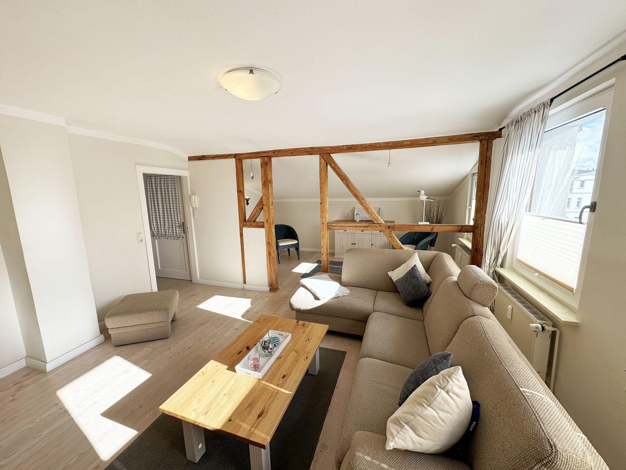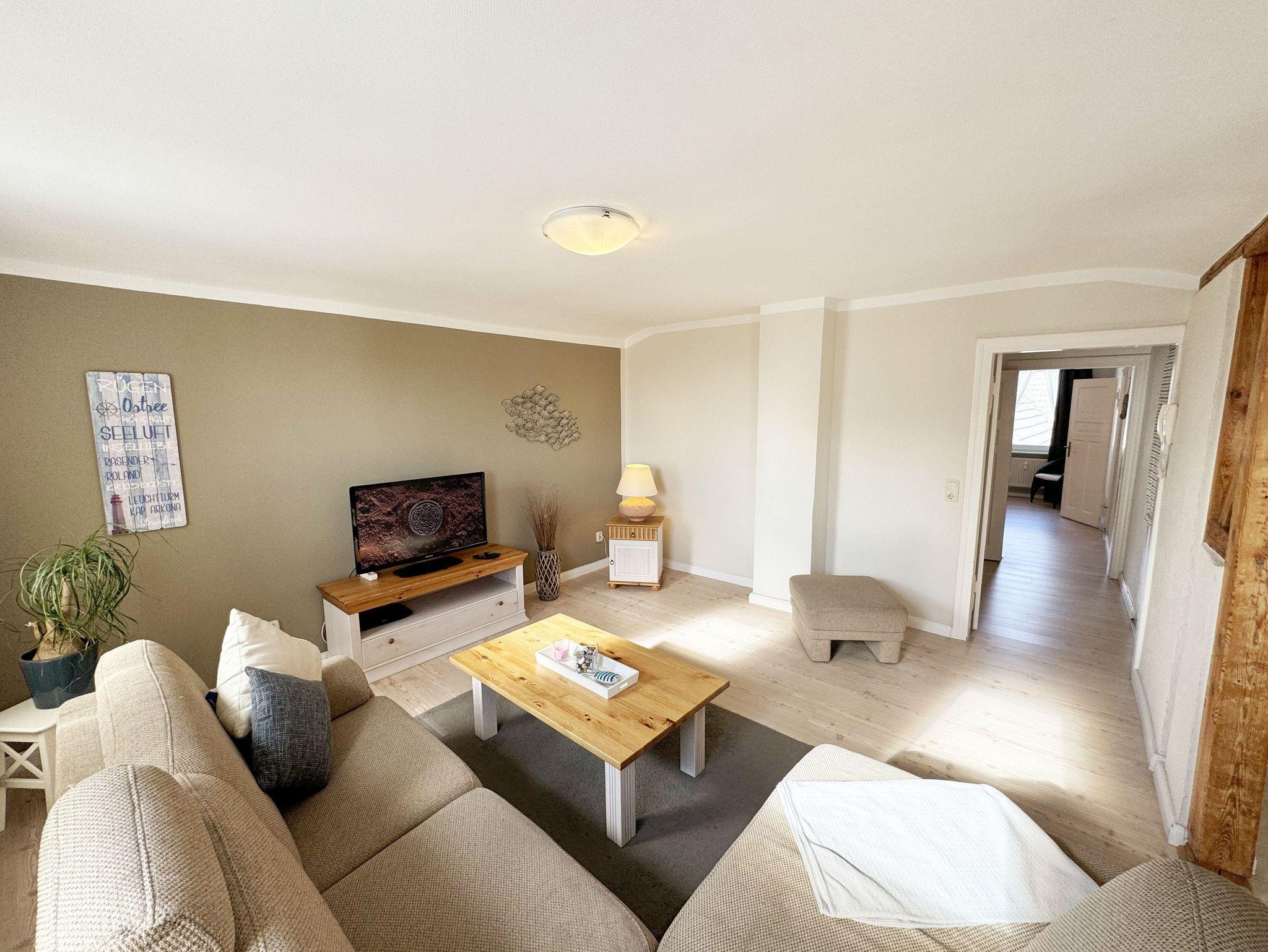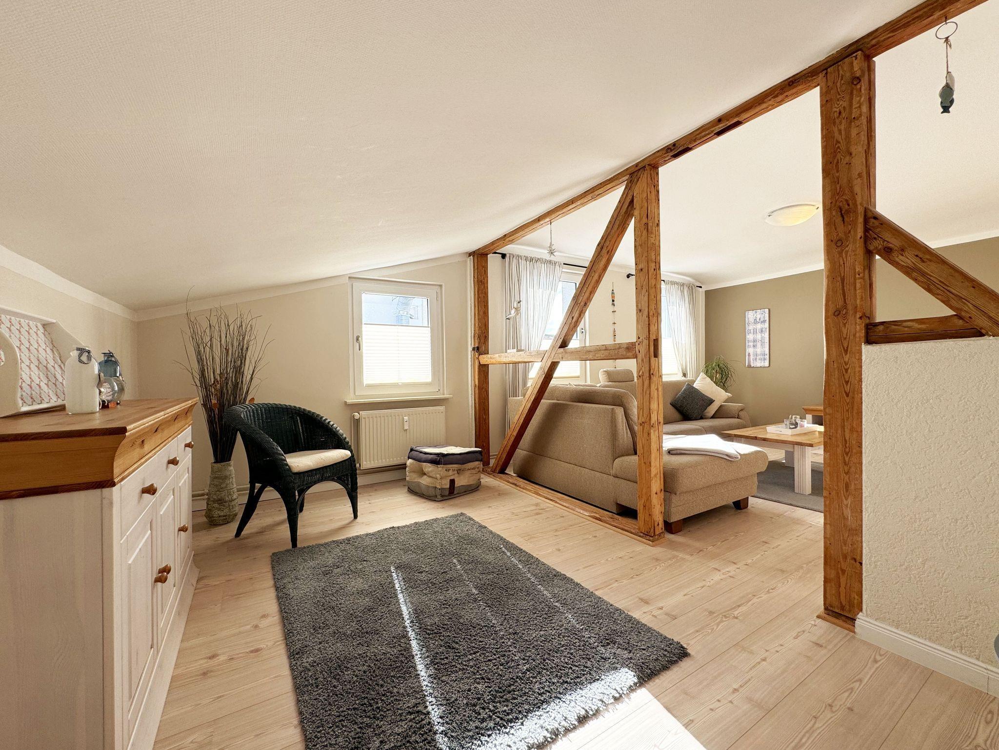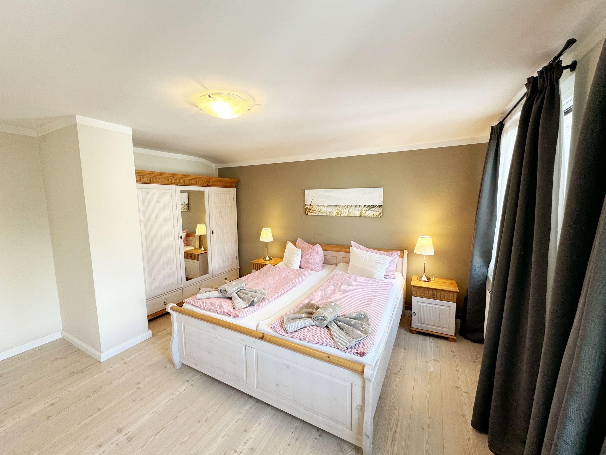 Über einen großzügigen hellen Flur gelangt man in die Ferienwohnung 4. Die Ferienwohnung befindet sich im Dachgeschoss des Hauses. Auf ca. 85 m² bietet sie ausreichend Platz für maximal 4 Erwachsene + 2 Kleinkinder bis 3 Jahre im Kinderreisebett. Die maritim eingerichtete Nichtraucherferienwohnung besteht aus einem großzügigen Wohnraum mit einer gemütlichen Couch, Couchtisch sowie ein TV-Board mit Flachbild-TV und DVD-Player. Diverse DVDs und Gesellschaftsspiele stehen Ihnen zur Verfügung. Auch auf einen Internetanschluss (WLAN) müssen Sie nicht verzichten. Dieser ist für Sie inklusive. Die separate Küche verfügt über eine Einbauküche mit einem Herd mit Cerankochfeld, einem Backofen, einem Kühlschrank, einem Gefrierschrank, einer Spülmaschine, einer Mikrowelle, einem Toaster, einer Kaffeemaschine und einem Wasserkocher. Ein gemütlicher Essplatz rundet den Raum ab. In dieser Ferienwohnung befinden sich zwei getrennte Schlafräume. Im ersten Schlafraum befindet sich ein Doppelbett (1,80m x 2,00m), verstellbare Lattenroste, Nachttischablagen mit Beleuchtung und ein großer Kleiderschrank mit Ganzkörperspiegel. Im zweiten kleineren Schlafzimmer befinden sich zwei massive Einzelbetten (1,00m x 2,00m), welche auch als Doppelbett gestellt werden können, verstellbare Lattenroste, Nachttischablagen mit Beleuchtung sowie eine Wäschekommode. In beiden Schlafzimmern sorgen ein Insektenschutzgitter sowie eine Verdunklungsmöglichkeit für einen angenehmen Schlaf. Das Tageslicht-Bad befindet sich direkt neben dem ersten Schlafzimmer und verfügt über einen Waschplatz, ein WC, einen Handtuchtrockner, eine Badewanne mit Handbrause, einen Kosmetikspiegel sowie einen Fön. Weiterhin haben Sie einen geräumigen Flur mit Garderobe und einen Abstellraum. Hier befinden sich unteranderem Reinigungsutensilien, sowie einen Staubsauger und einen Wäscheständer. Für unsere kleinen Gäste stehen Ihnen ein Kinderreisebett sowie ein Hochstuhl inklusive zur Verfügung. Ein PKW-Stellplatz (Nr.04) und eine abschließbare Fahrradunterstellmöglichkeit befinden sich direkt am Haus. Direkt am Haus, neben dem Parkplatz befindet sich eine kleine Sitzgelegenheit, die gerne zum Entspannen genutzt werden darf. Haustiere sind nicht erlaubt. Die Erstausstattung eines Wäschepaketes (komplette Bettwäsche, 1 Duschhandtuch, 2 kleine Handtücher) können Sie bis 14 Tage vor Anreise gegen einen Aufpreis dazu buchen oder durch eigene ergänzen. Ab 2 gebuchten Paketen erhalten Sie einmalig 1 Geschirrhandtuch und 1 Duschvorleger hinzu. Wir wünschen Ihnen einen traumhaften und angenehmen Urlaub an der Ostsee, erholen Sie sich gut.