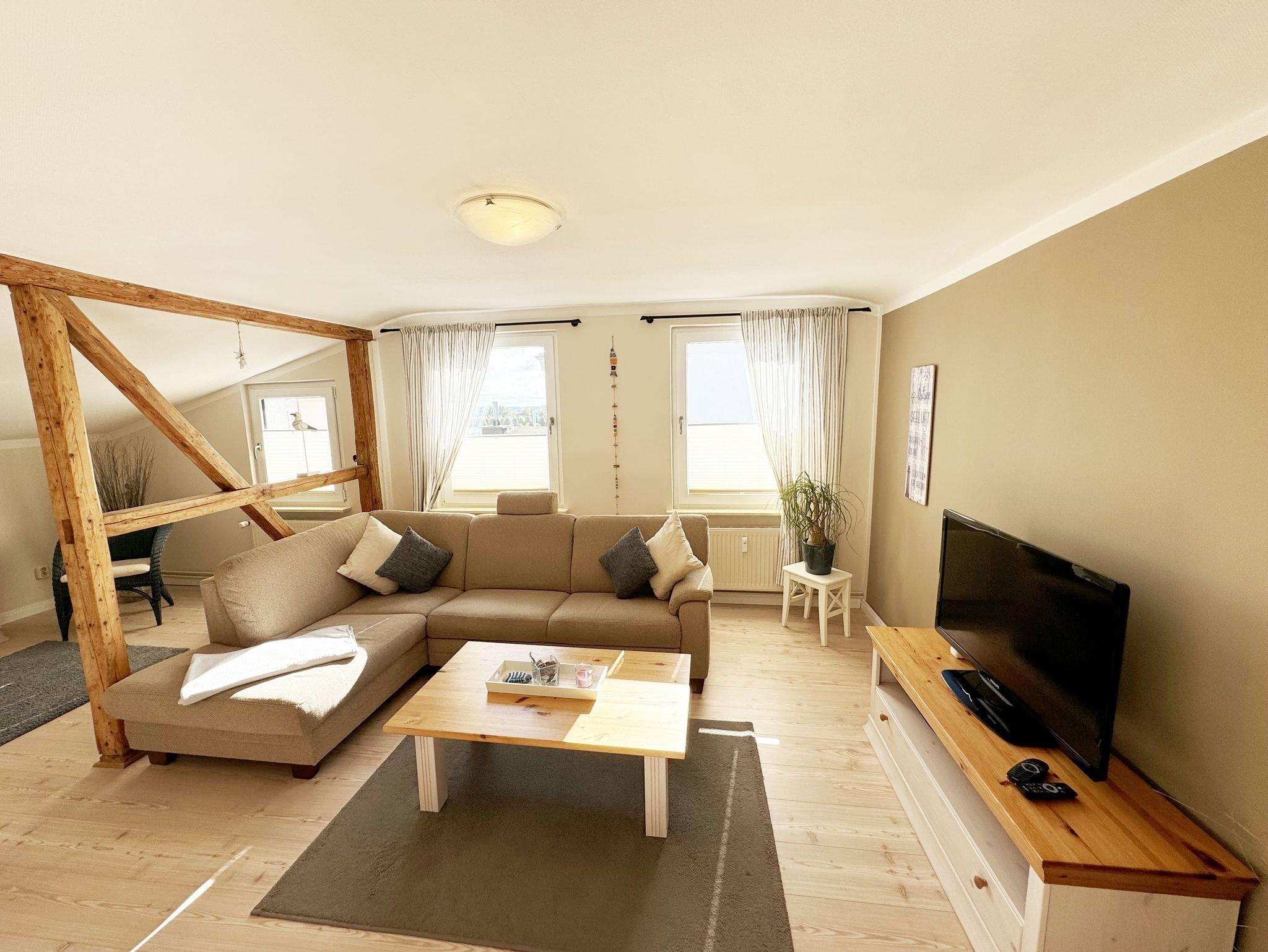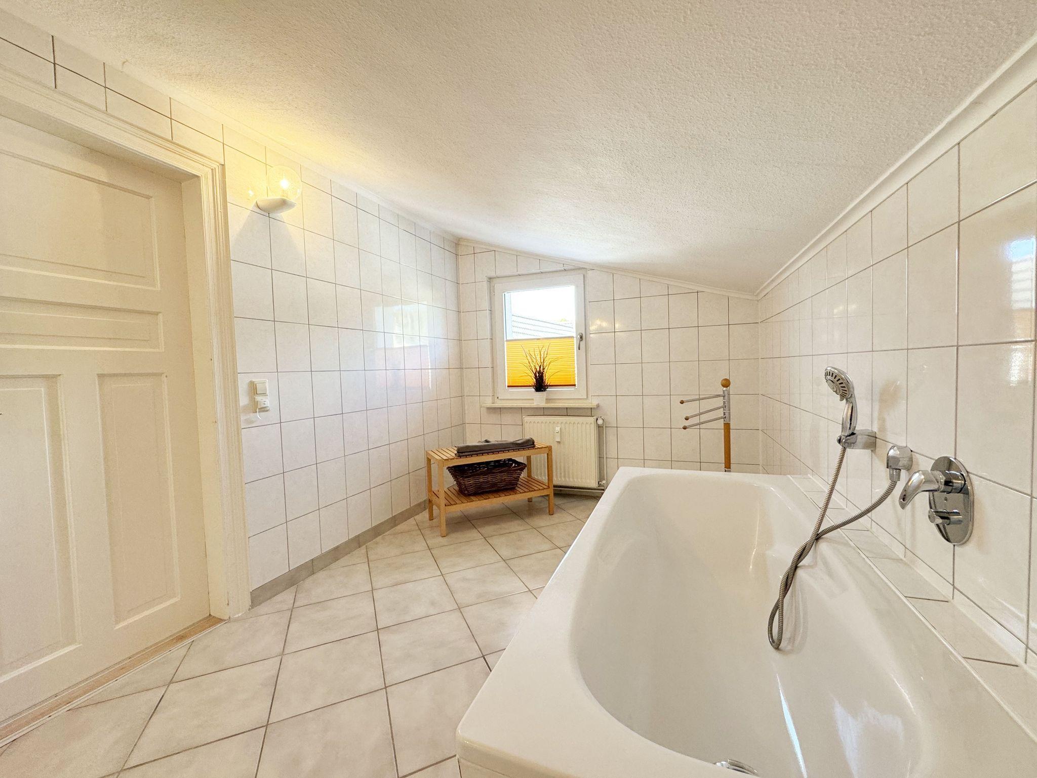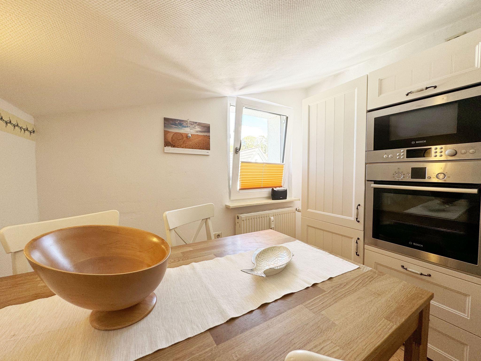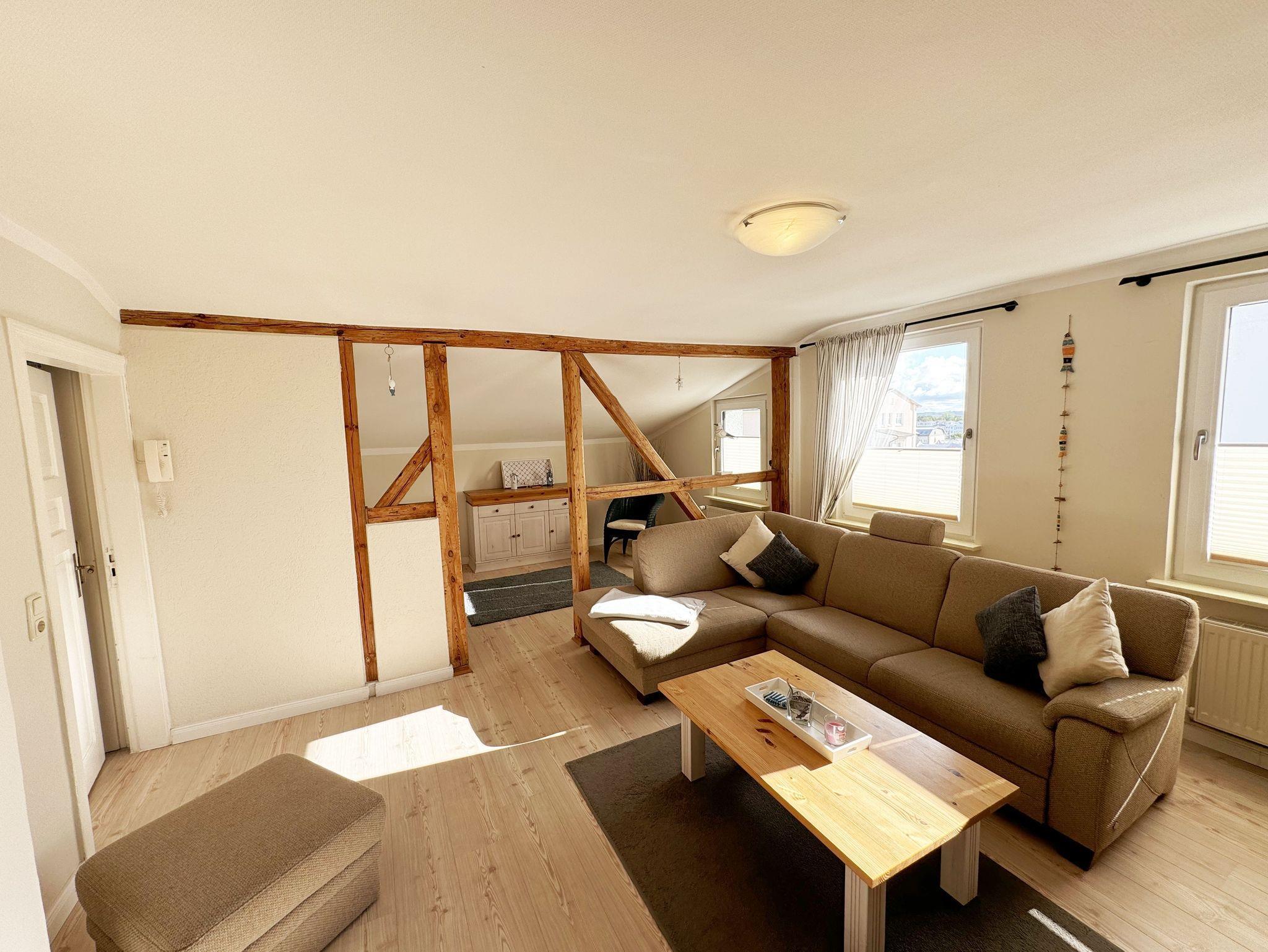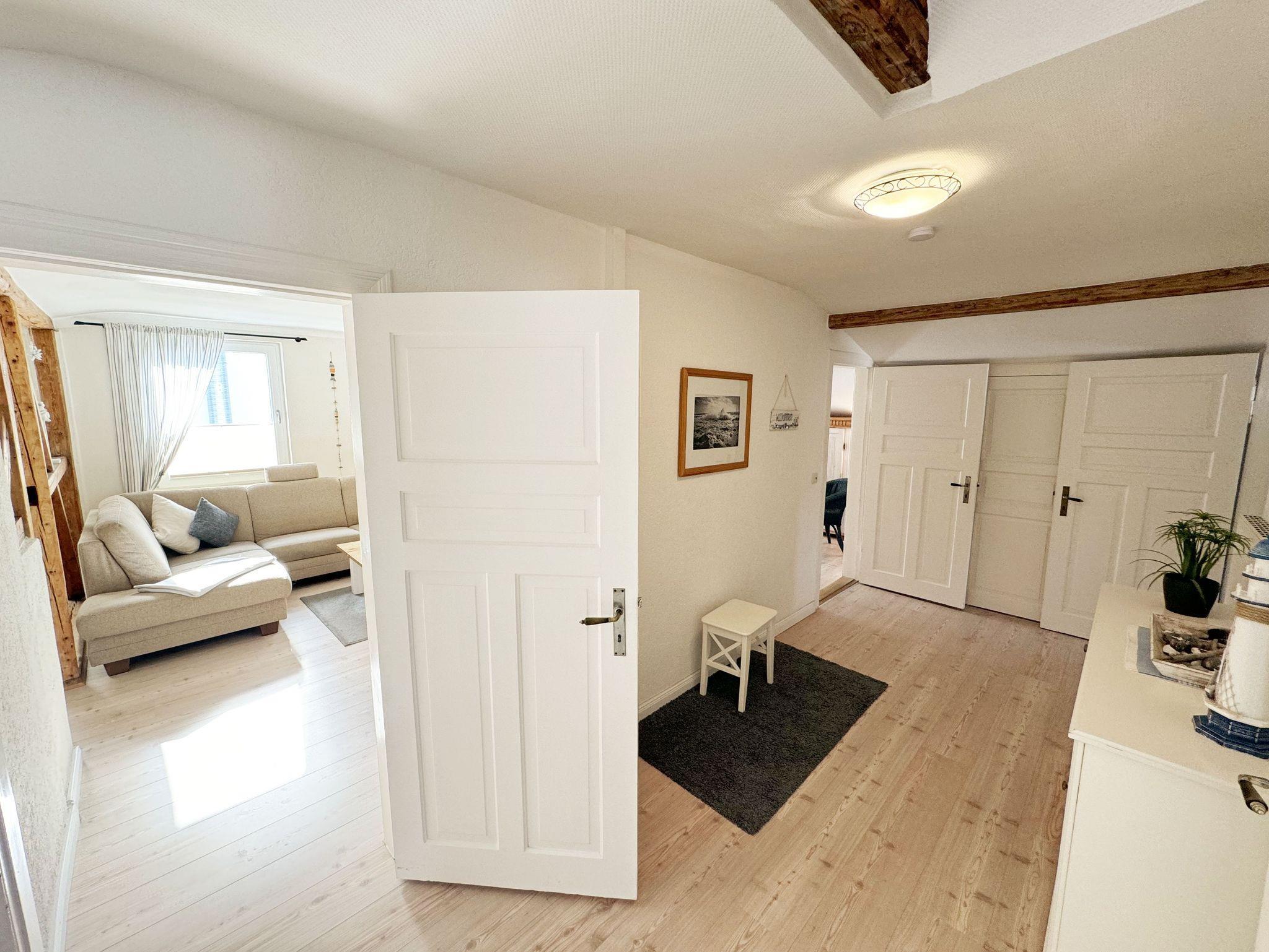 Über einen großzügigen hellen Flur gelangt man in die Ferienwohnung 4. Die Ferienwohnung befindet sich im Dachgeschoss des Hauses. Auf ca. 85 m² bietet sie ausreichend Platz für maximal 4 Erwachsene + 2 Kleinkinder bis 3 Jahre im Kinderreisebett. Die maritim eingerichtete Nichtraucherferienwohnung besteht aus einem großzügigen Wohnraum mit einer gemütlichen Couch, Couchtisch sowie ein TV-Board mit Flachbild-TV und DVD-Player. Diverse DVDs und Gesellschaftsspiele stehen Ihnen zur Verfügung. Auch auf einen Internetanschluss (WLAN) müssen Sie nicht verzichten. Dieser ist für Sie inklusive. Die separate Küche verfügt über eine Einbauküche mit einem Herd mit Cerankochfeld, einem Backofen, einem Kühlschrank, einem Gefrierschrank, einer Spülmaschine, einer Mikrowelle, einem Toaster, einer Kaffeemaschine und einem Wasserkocher. Ein gemütlicher Essplatz rundet den Raum ab. In dieser Ferienwohnung befinden sich zwei getrennte Schlafräume. Im ersten Schlafraum befindet sich ein Doppelbett (1,80m x 2,00m), verstellbare Lattenroste, Nachttischablagen mit Beleuchtung und ein großer Kleiderschrank mit Ganzkörperspiegel. Im zweiten kleineren Schlafzimmer befinden sich zwei massive Einzelbetten (1,00m x 2,00m), welche auch als Doppelbett gestellt werden können, verstellbare Lattenroste, Nachttischablagen mit Beleuchtung sowie eine Wäschekommode. In beiden Schlafzimmern sorgen ein Insektenschutzgitter sowie eine Verdunklungsmöglichkeit für einen angenehmen Schlaf. Das Tageslicht-Bad befindet sich direkt neben dem ersten Schlafzimmer und verfügt über einen Waschplatz, ein WC, einen Handtuchtrockner, eine Badewanne mit Handbrause, einen Kosmetikspiegel sowie einen Fön. Weiterhin haben Sie einen geräumigen Flur mit Garderobe und einen Abstellraum. Hier befinden sich unteranderem Reinigungsutensilien, sowie einen Staubsauger und einen Wäscheständer. Für unsere kleinen Gäste stehen Ihnen ein Kinderreisebett sowie ein Hochstuhl inklusive zur Verfügung. Ein PKW-Stellplatz (Nr.04) und eine abschließbare Fahrradunterstellmöglichkeit befinden sich direkt am Haus. Direkt am Haus, neben dem Parkplatz befindet sich eine kleine Sitzgelegenheit, die gerne zum Entspannen genutzt werden darf. Haustiere sind nicht erlaubt. Die Erstausstattung eines Wäschepaketes (komplette Bettwäsche, 1 Duschhandtuch, 2 kleine Handtücher) können Sie bis 14 Tage vor Anreise gegen einen Aufpreis dazu buchen oder durch eigene ergänzen. Ab 2 gebuchten Paketen erhalten Sie einmalig 1 Geschirrhandtuch und 1 Duschvorleger hinzu. Wir wünschen Ihnen einen traumhaften und angenehmen Urlaub an der Ostsee, erholen Sie sich gut.