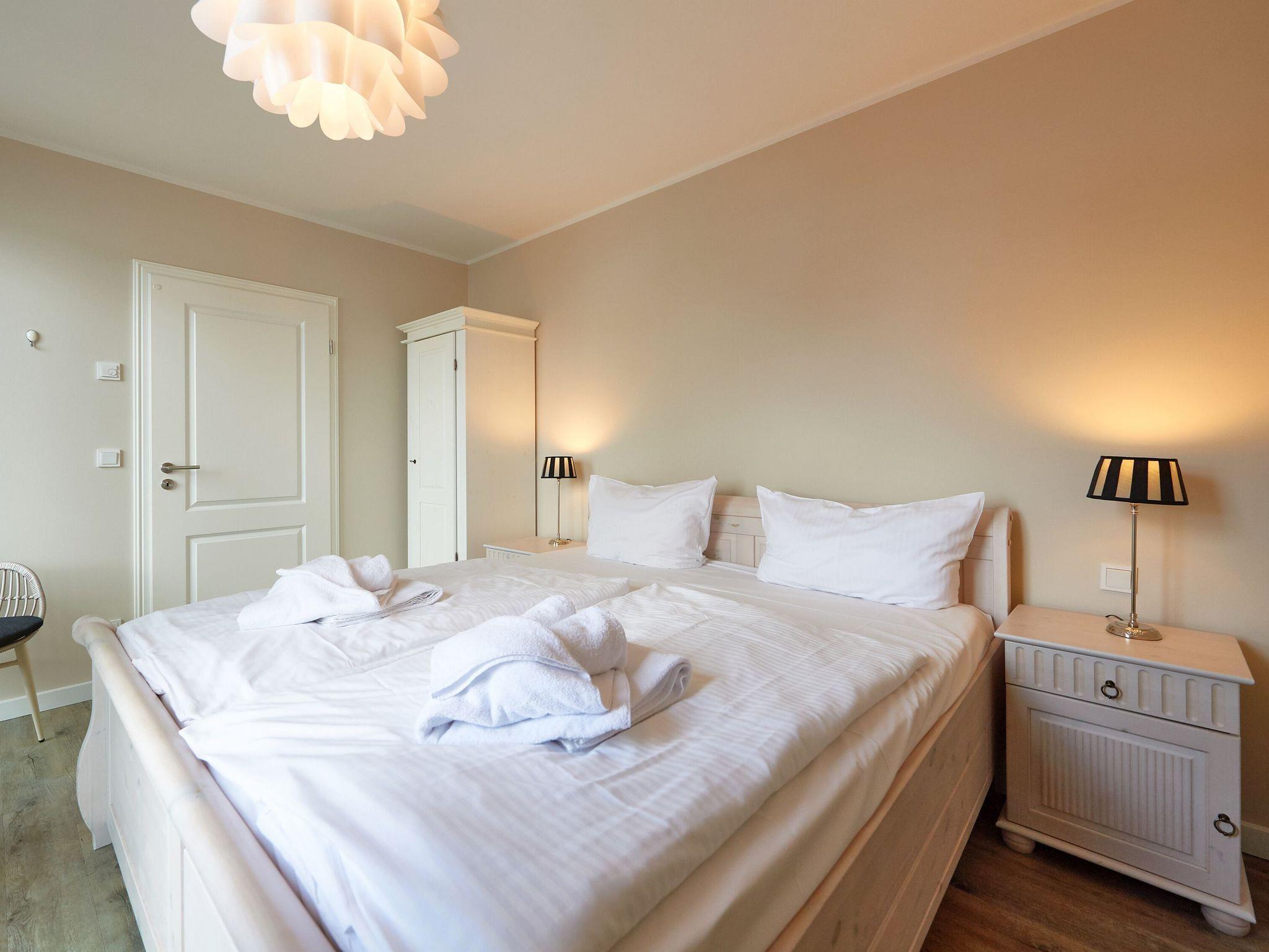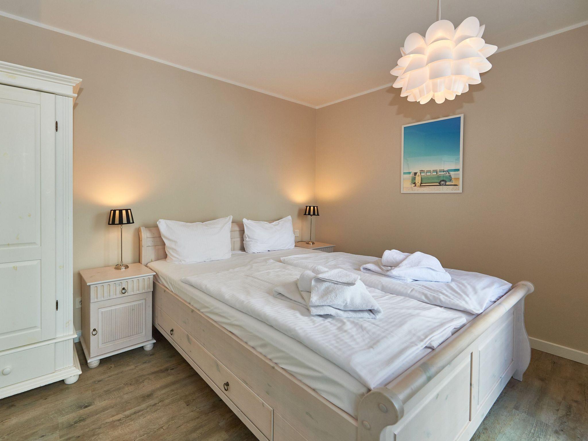 In den beiden Schlafzimmern finden Sie jeweils ein komfortables Doppelbett (1,80 x 2,00 m) und einen Kleiderschrank für die Urlaubsgarderobe, im größeren der beiden Schlafzimmer zusätzlich einen zweiten Fernseher.