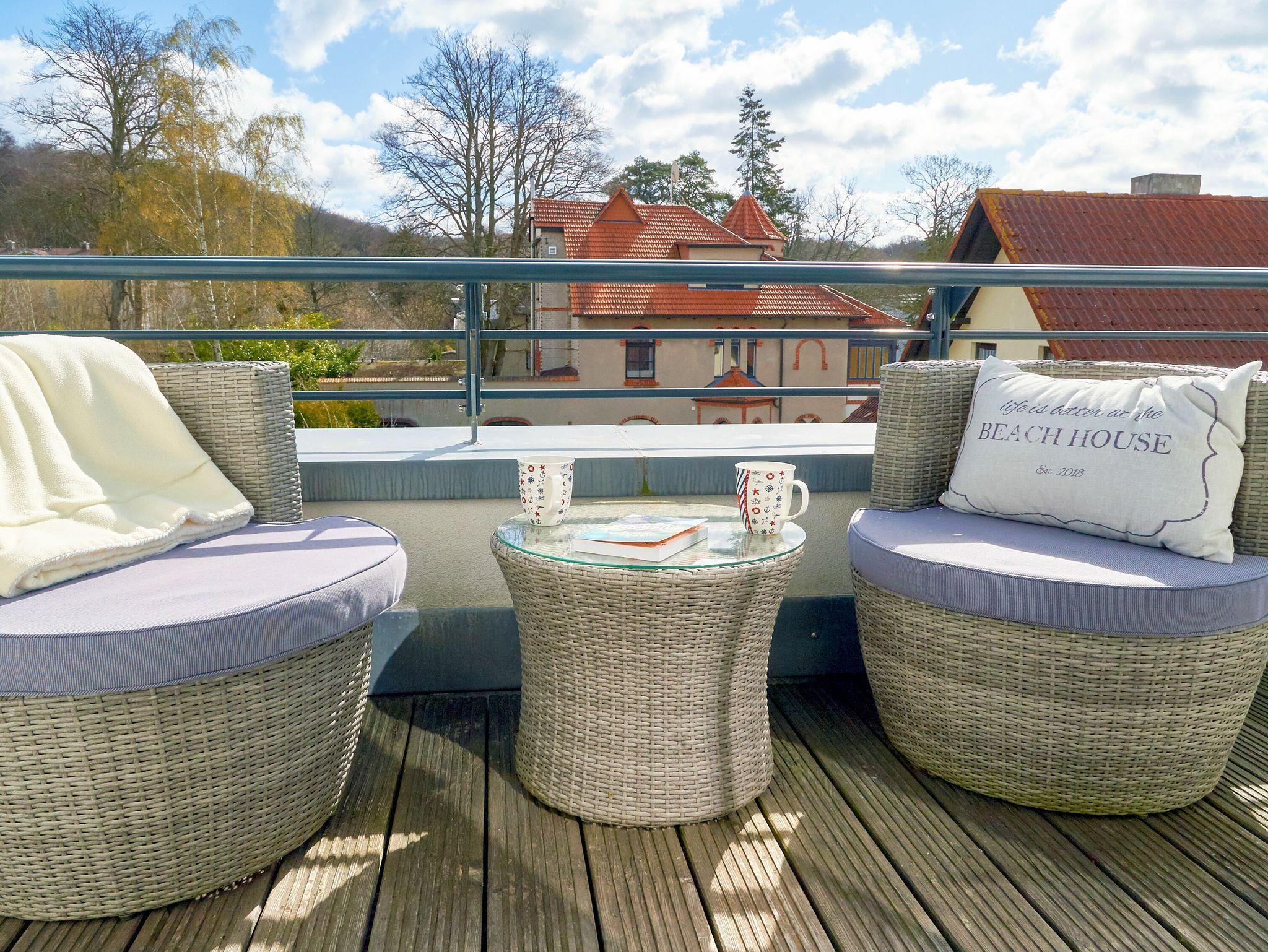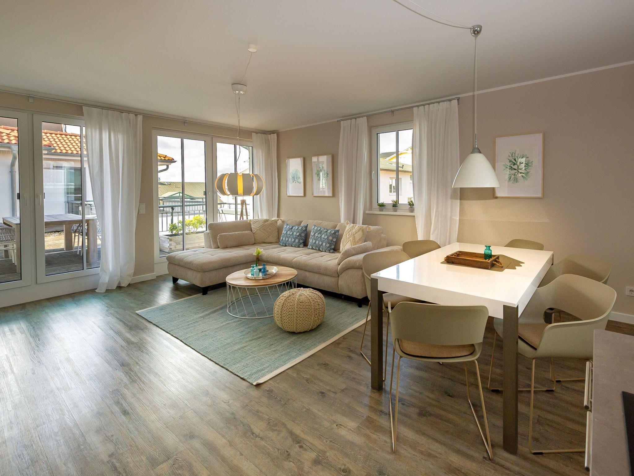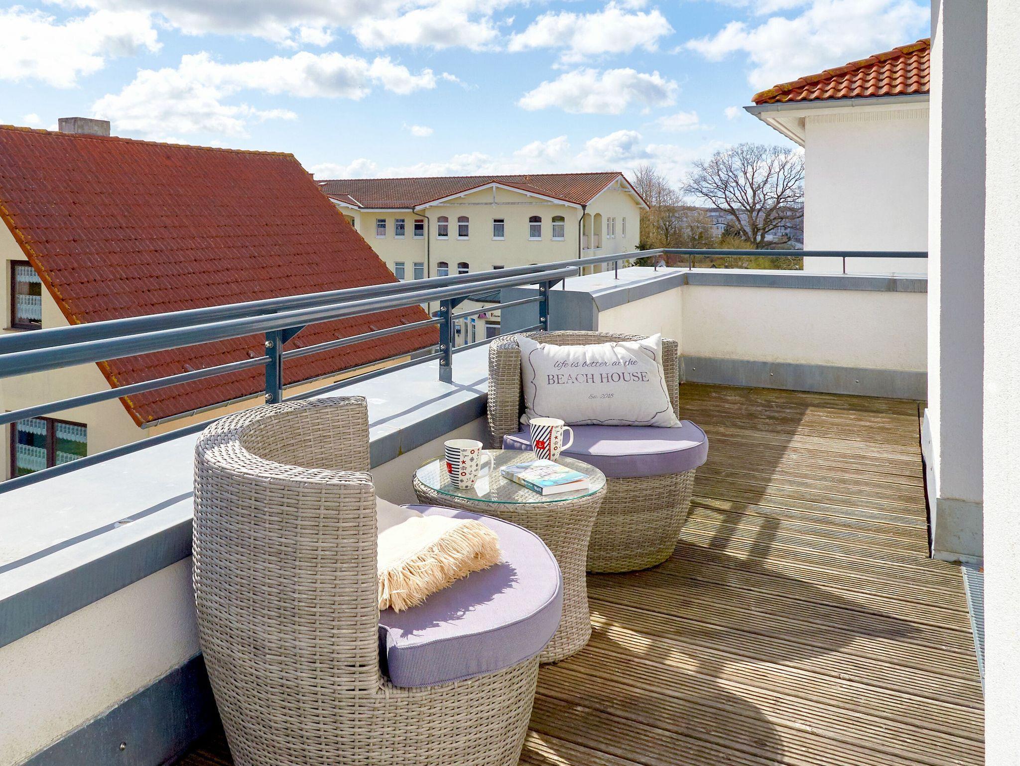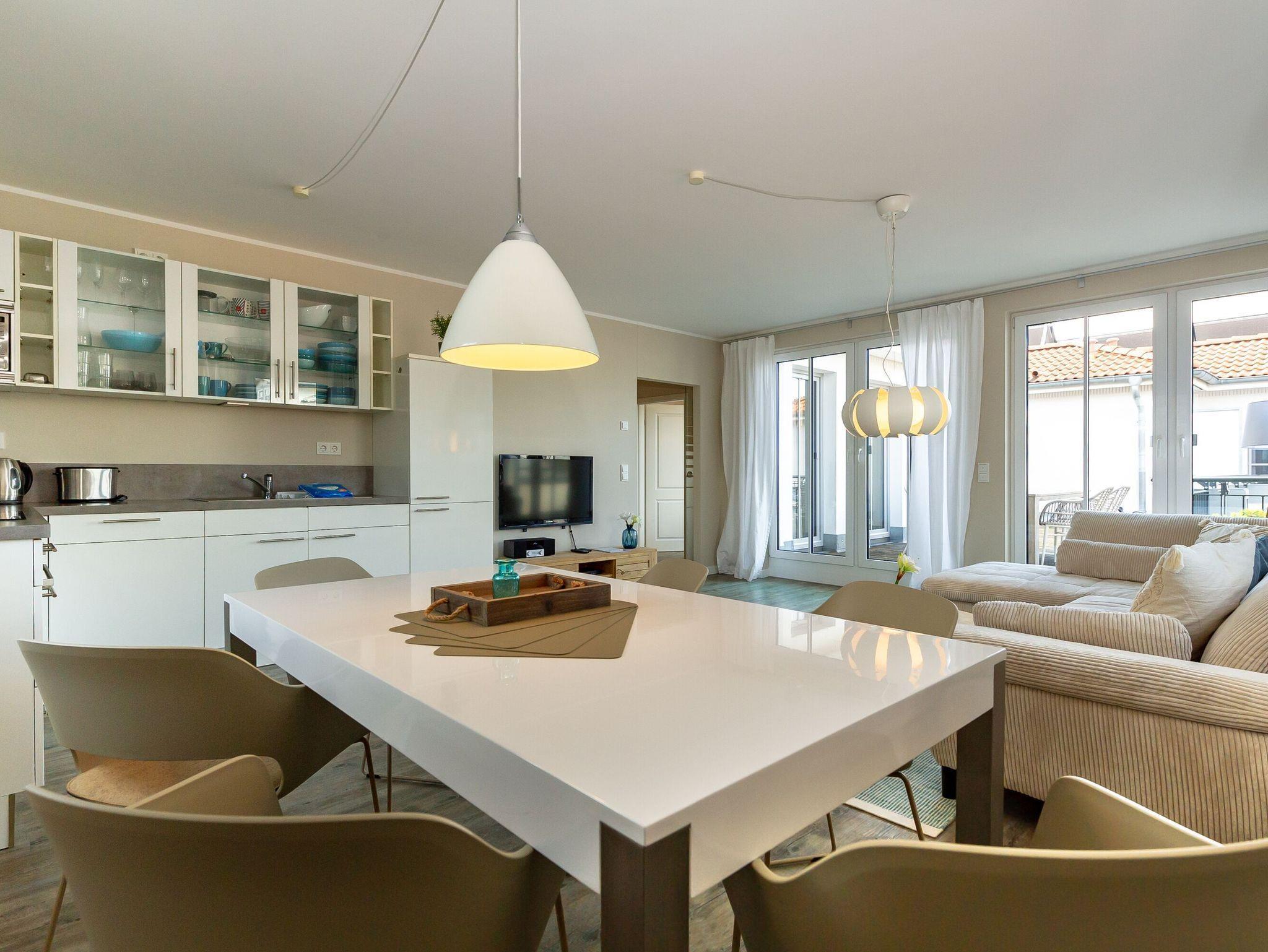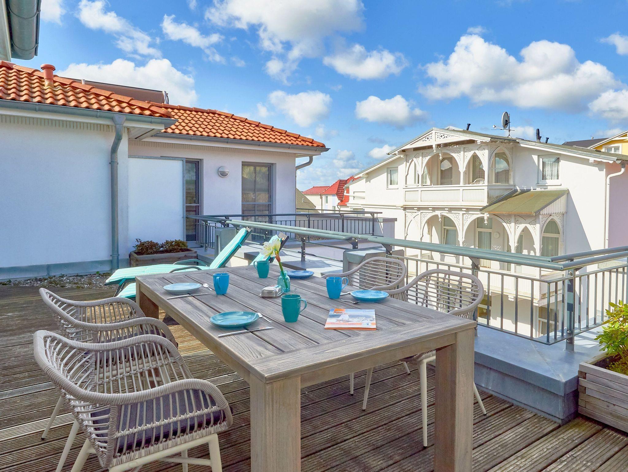Ein Urlaubsdomizil zum Wohlfühlen! Dieses elegante Penthouse-Appartement bietet mit seinen drei Räumen und 89 m² Wohnfläche nicht nur jede Menge Raum, sondern begeistert darüber hinaus mit jeder Menge Freifläche auf dem Dach. Genießen Sie morgens die Sonne auf dem 15 m² großen Südostbalkon und tagsüber die 38 m² große Dachterrasse im Südwesten. Sie hat einen großen Tisch und zwei Liegestühle.