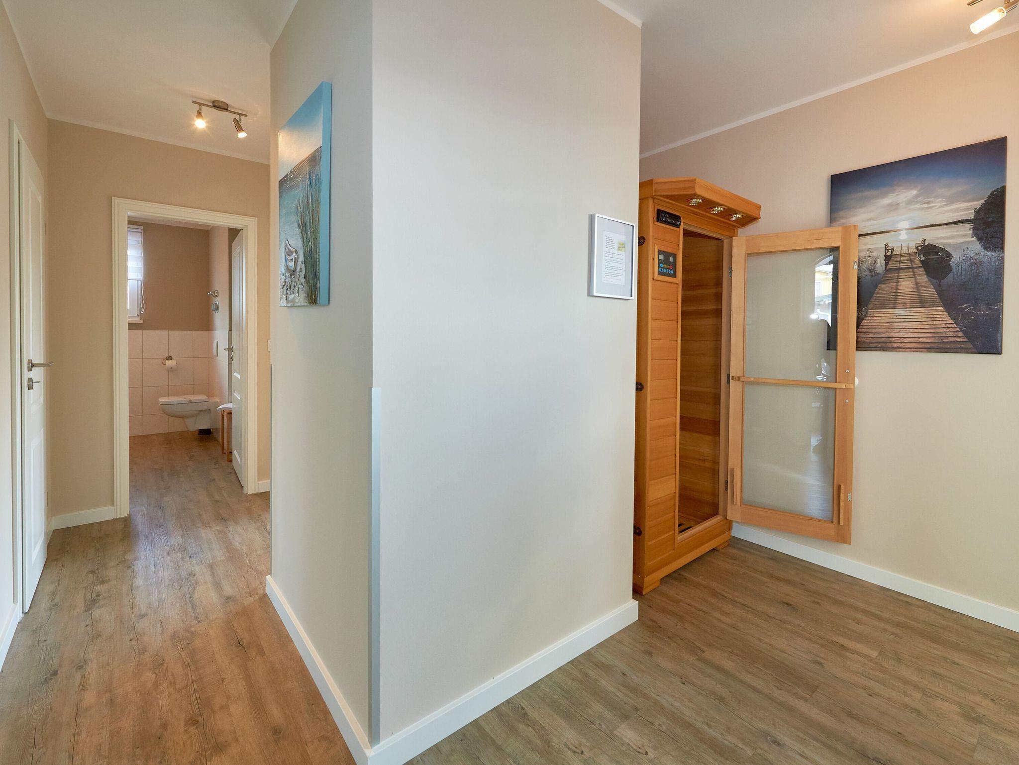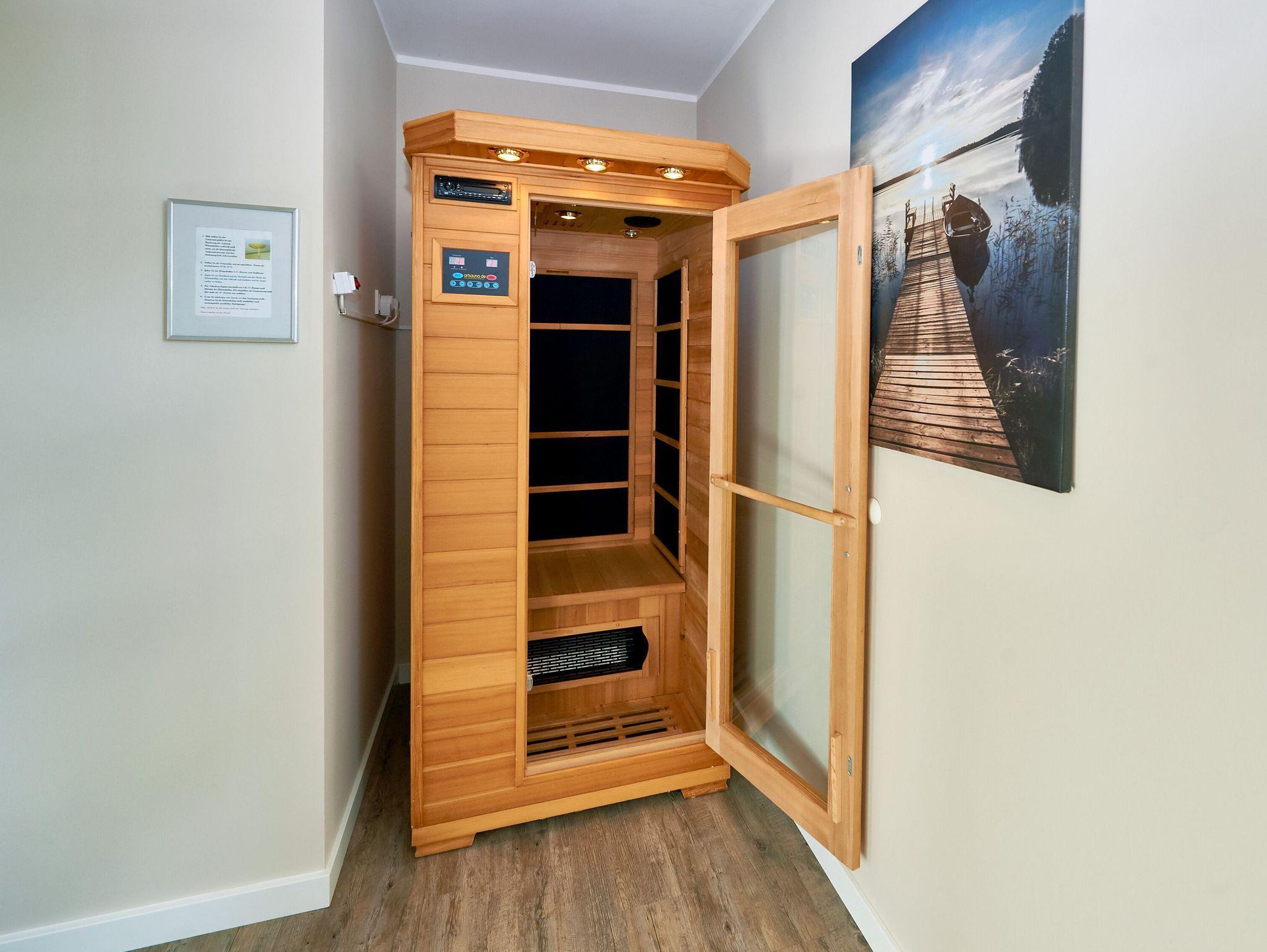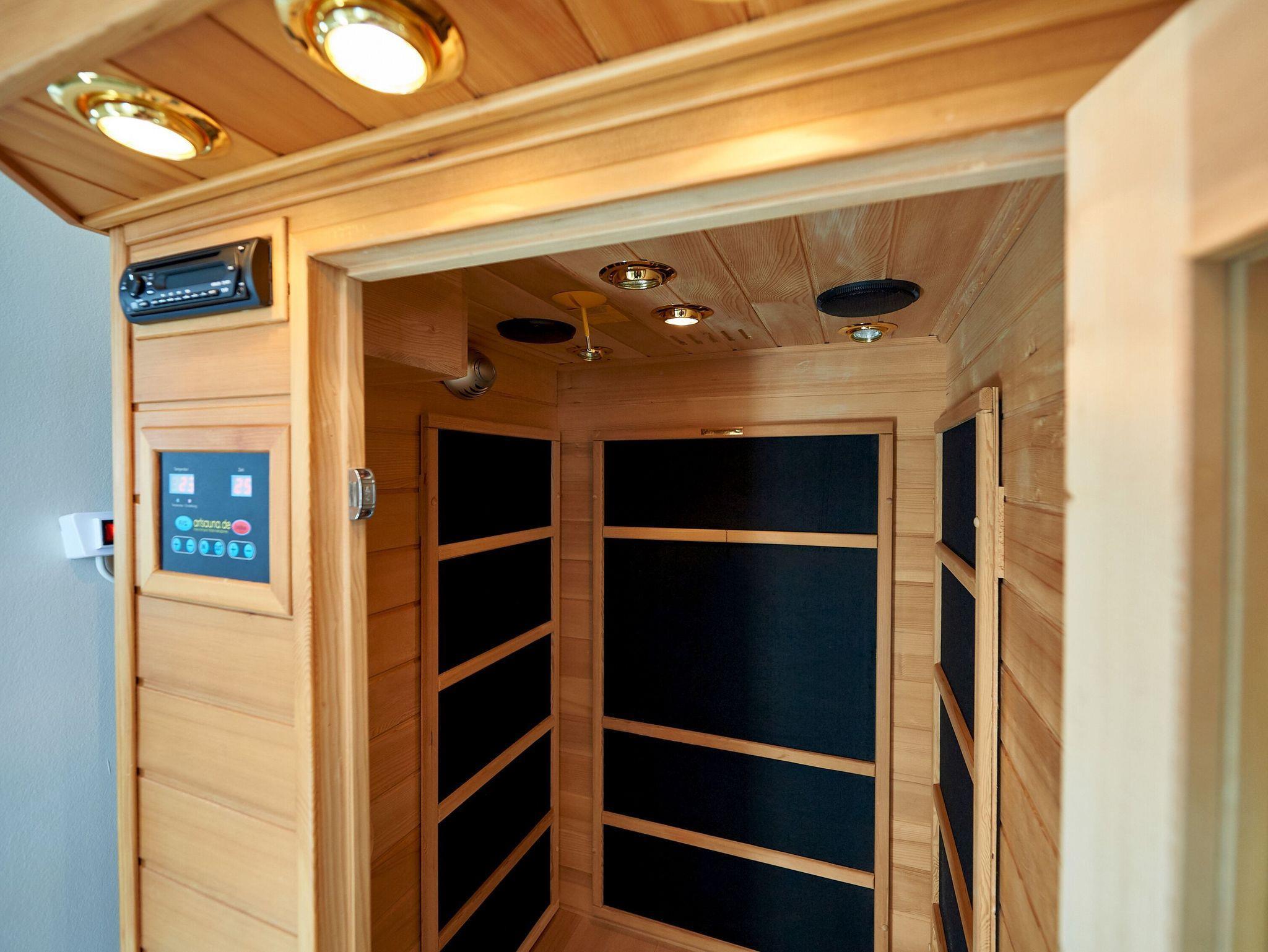 Das großzügige Badezimmer ist mit Dusche/WC, beleuchteten Waschtisch sowie Handtuchwärmer, Kosmetikspiegel und Fön ausgestattet. Eine Infrarotsauna mit Flächenstrahler und Lichttherapie steht Ihnen nach einer kurzen Aufwärmphase gratis zur Verfügung.