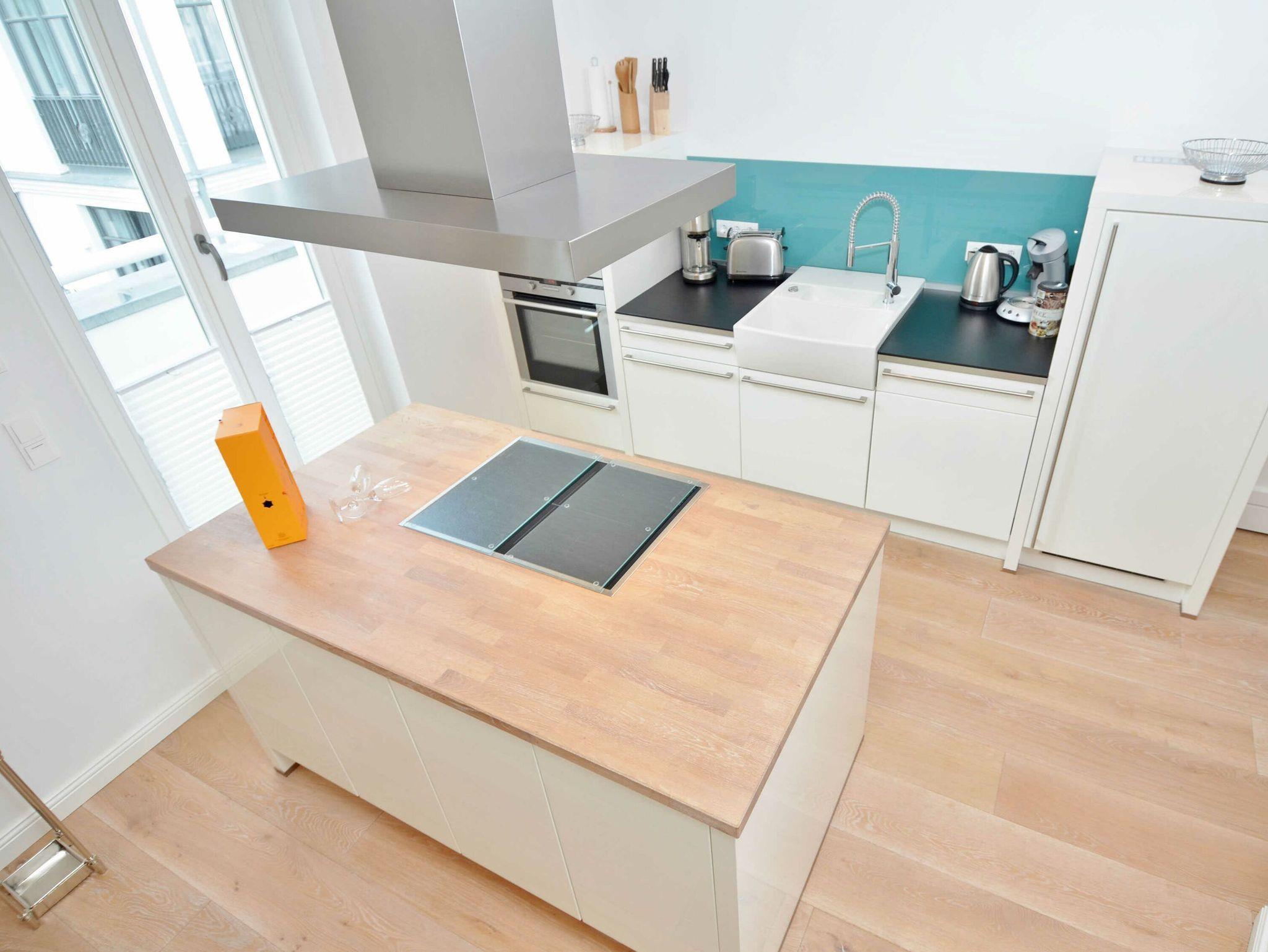 Der in den Wohnraum harmonisch integrierte Kochbereich überzeugt mit hochwertigen Geräten. Der freistehende Kochblock mit Induktionsherd, Backofen, Mikrowelle, Geschirrspüler, Kühlschrank, Kaffeemaschine, Senseo-Kaffeepadmaschine für Kaffeespezialitäten, Toaster, Wasserkocher, Eierkocher und diversem Kleininventar lässt das Herz jeden Hobbykochs höher schlagen.