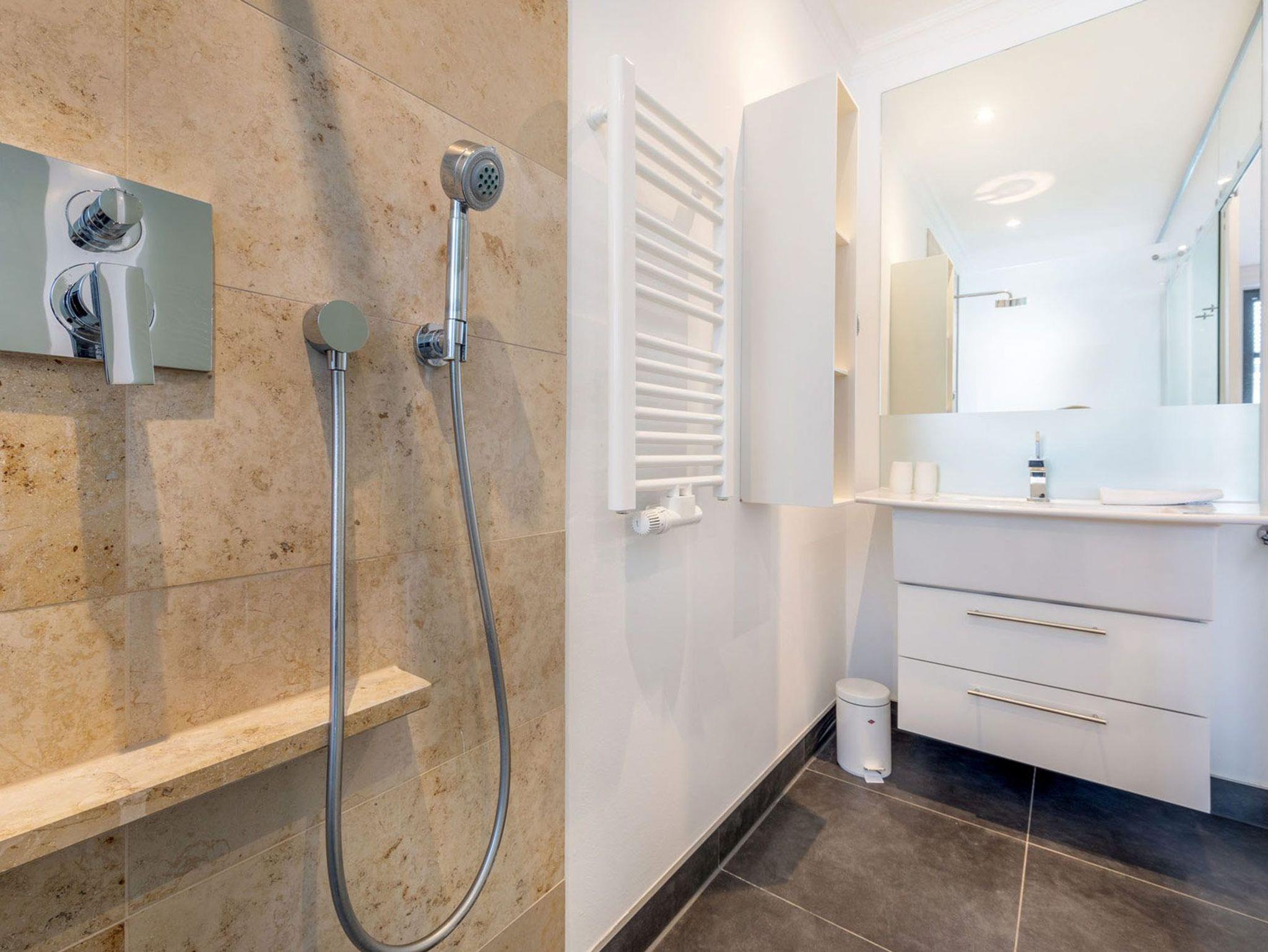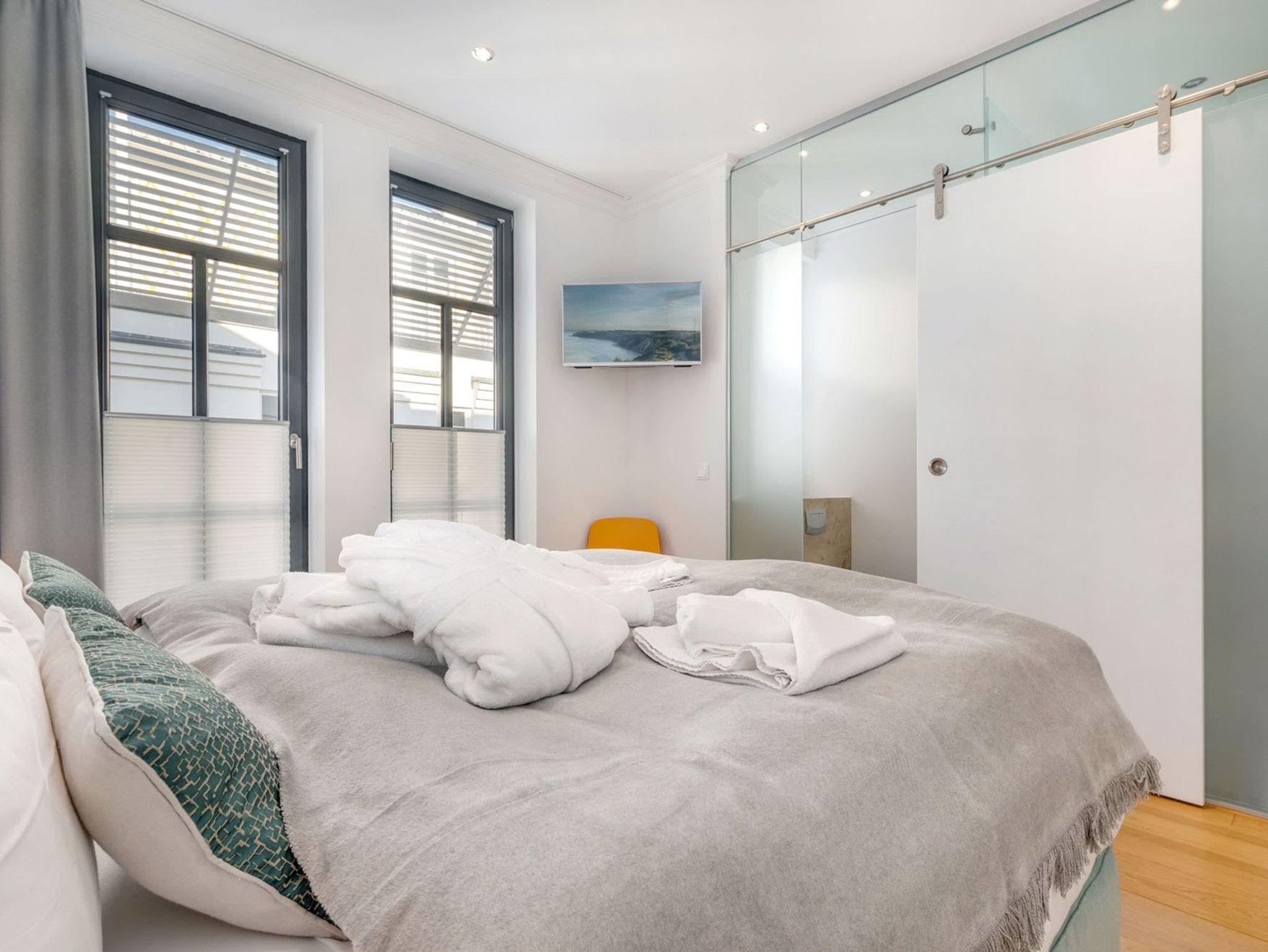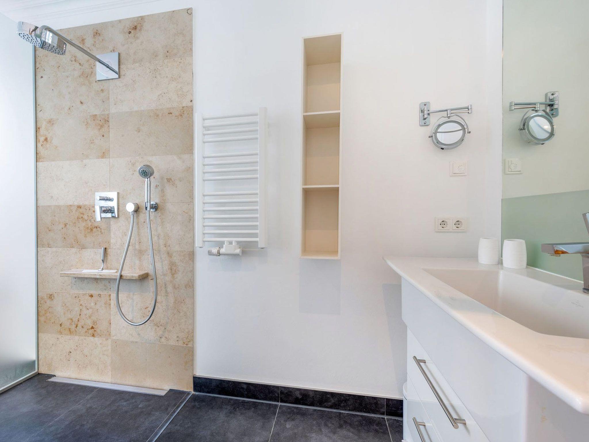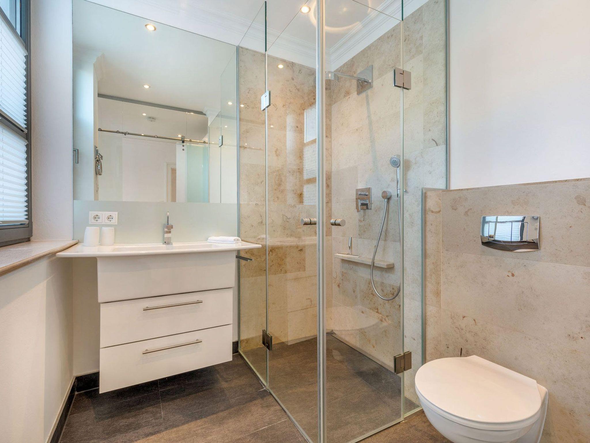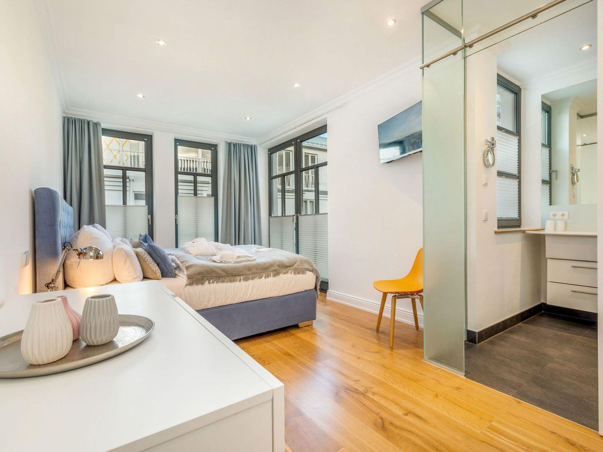 Die beiden Schlafzimmer überzeugen mit ihren luxuriösen Boxspring-Doppelbetten, Kleiderschränken und den 32 Zoll LED Fernsehern (inkl. Netflix) und strahlen eine elegante Behaglichkeit aus. Vom ersten Schlafzimmer (Richtung Osten) genießen Sie einen herrlichen Blick auf den solar beheizten Aussenpool und dem seitlichen Blick auf die Wilhelmstraße. Dem Schlafzimmer angeschlossen befinden sich jeweils ein Ensuite-Bad, welches mit hochwertiger Keramik von Villeroy [&] Boch und Amaturen von Grohe Axor ausgestattet ist. Dies gibt den Ensuite-Bädern eine definierte Ästhetik und lässt keine Wünsche offen.