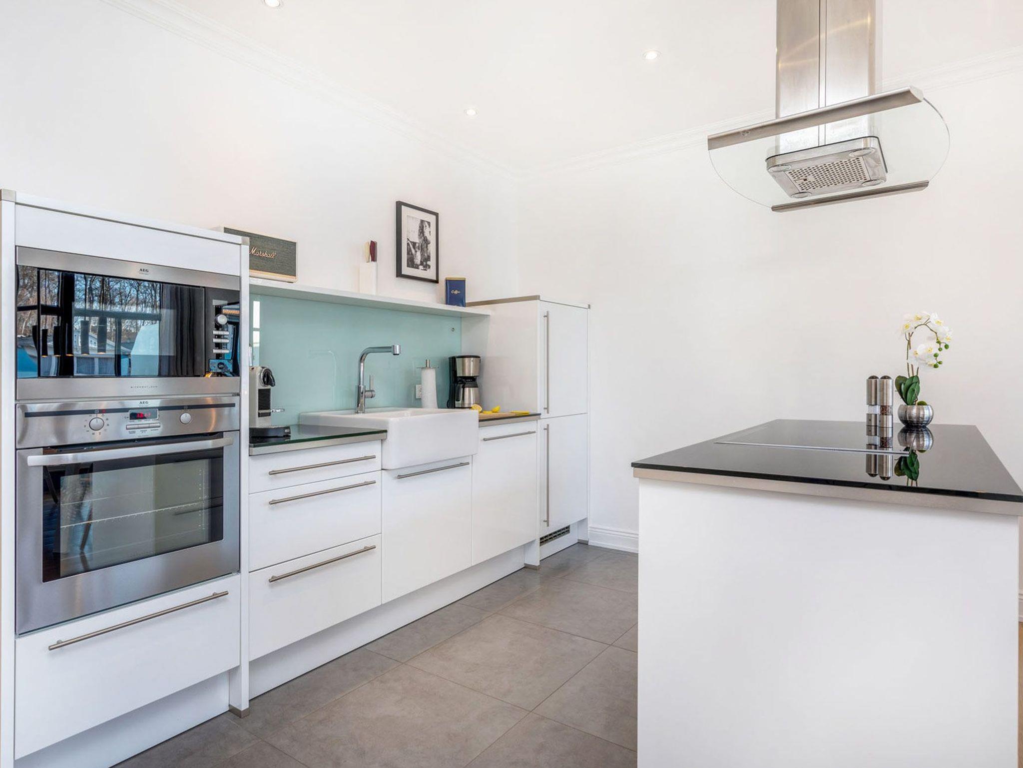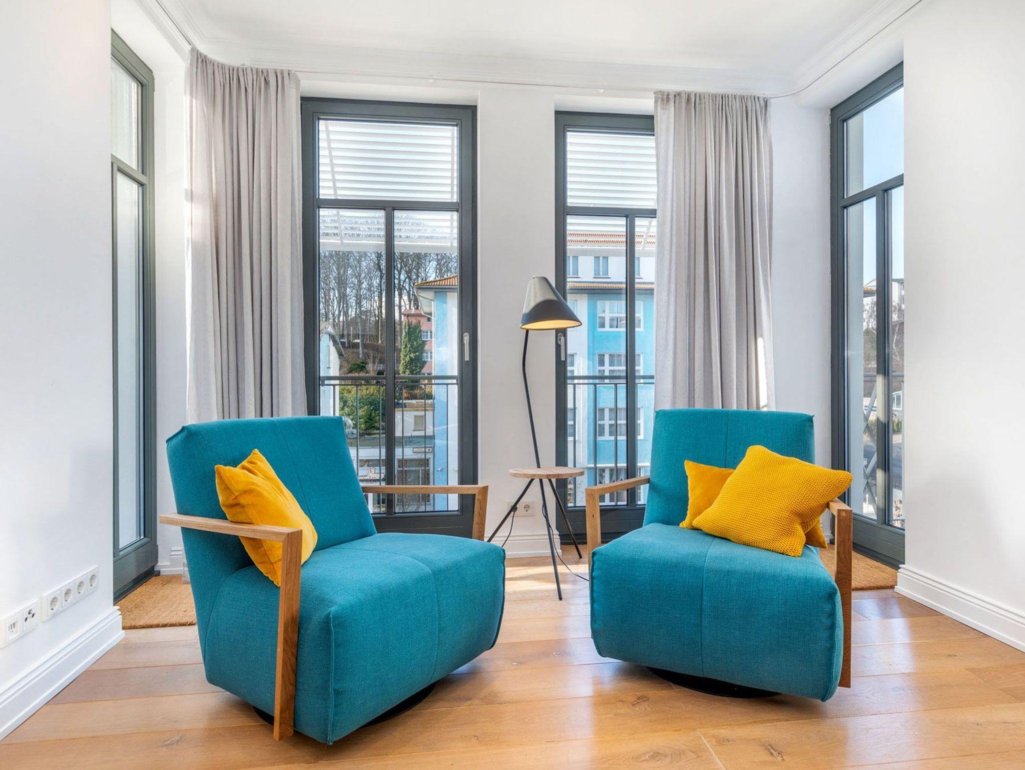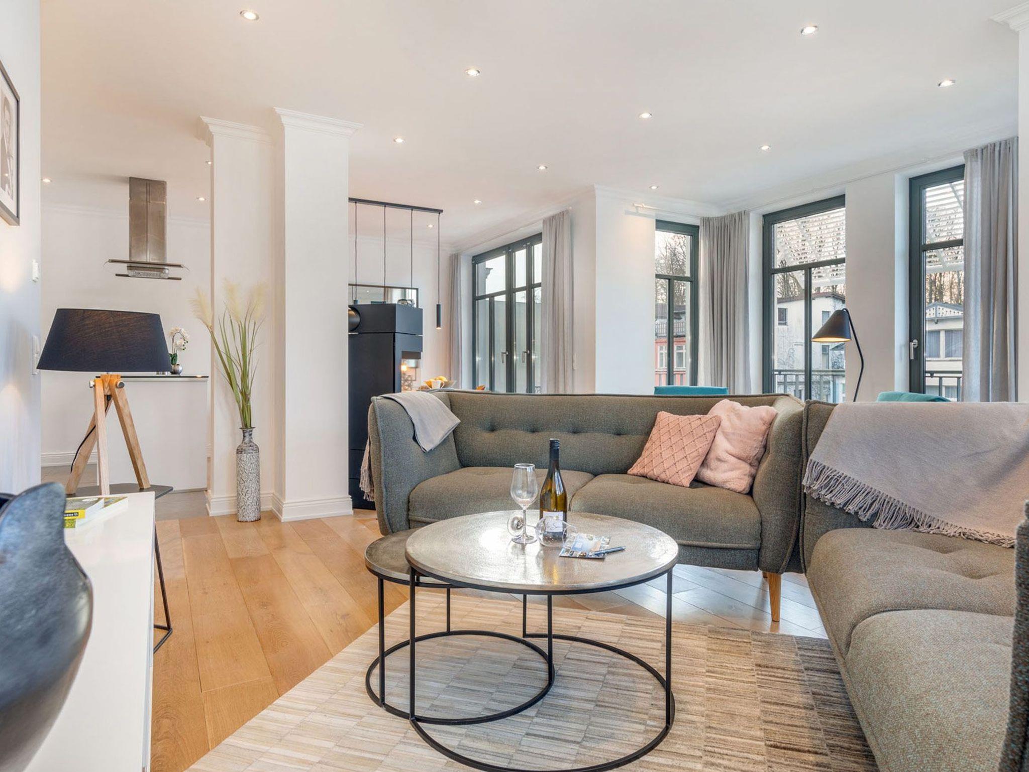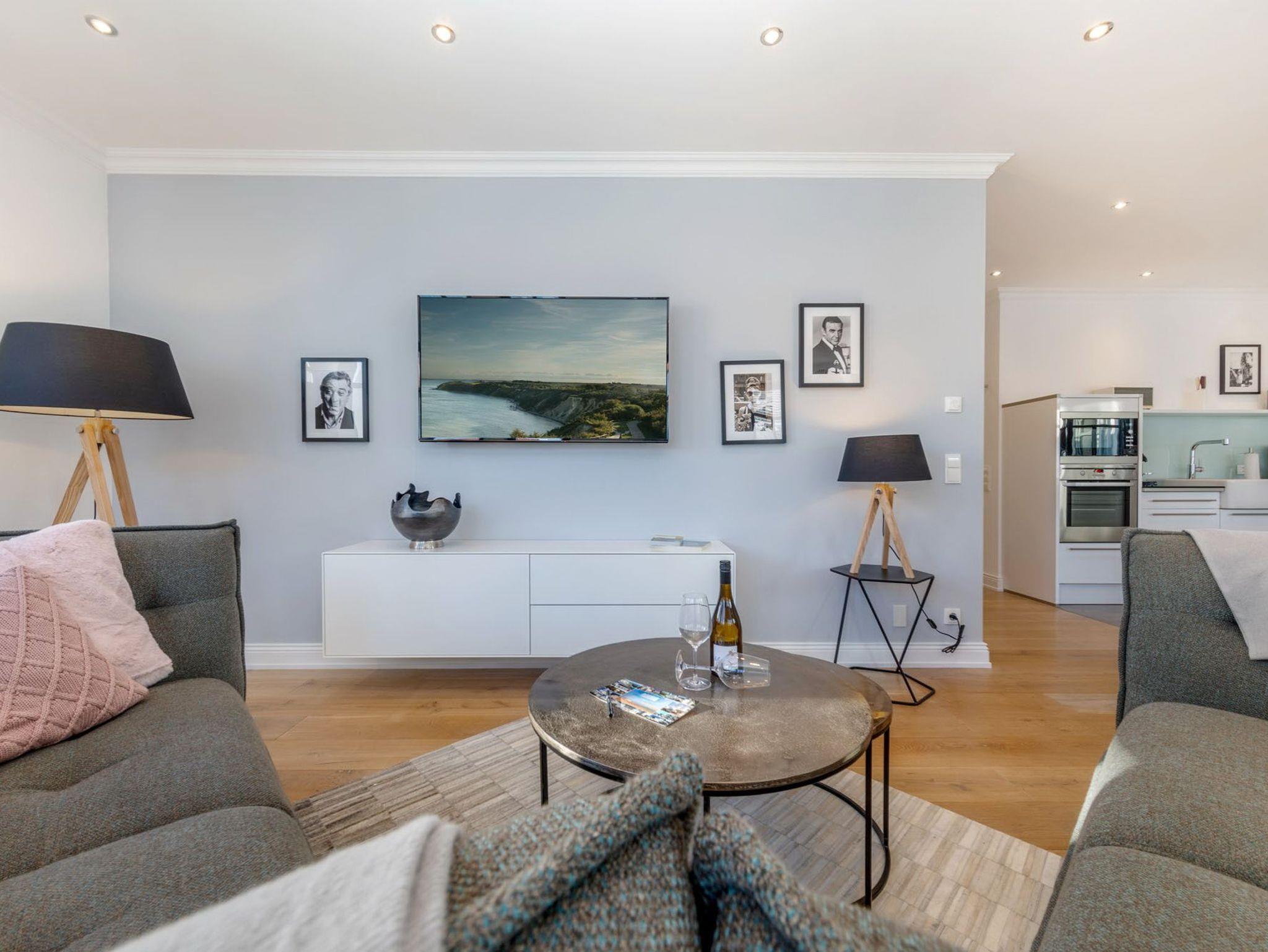 Das Wohnzimmer besticht durch einen Hauch von Skandinavien und ist mit jeweils zwei 2,5-Sitzer-Sofas ausgestattet und lädt zum Entspannen vor dem 55 Zoll LED Fernseher (inkl. Netflix) ein. Das besondere Highlight dieser Ferienwohnung sind die schwenkbaren und drehbaren Loungesessel mit Blick auf den flackernden Kamin und dem atemberaubenden seitlichen Meerblick auf die Ostsee.