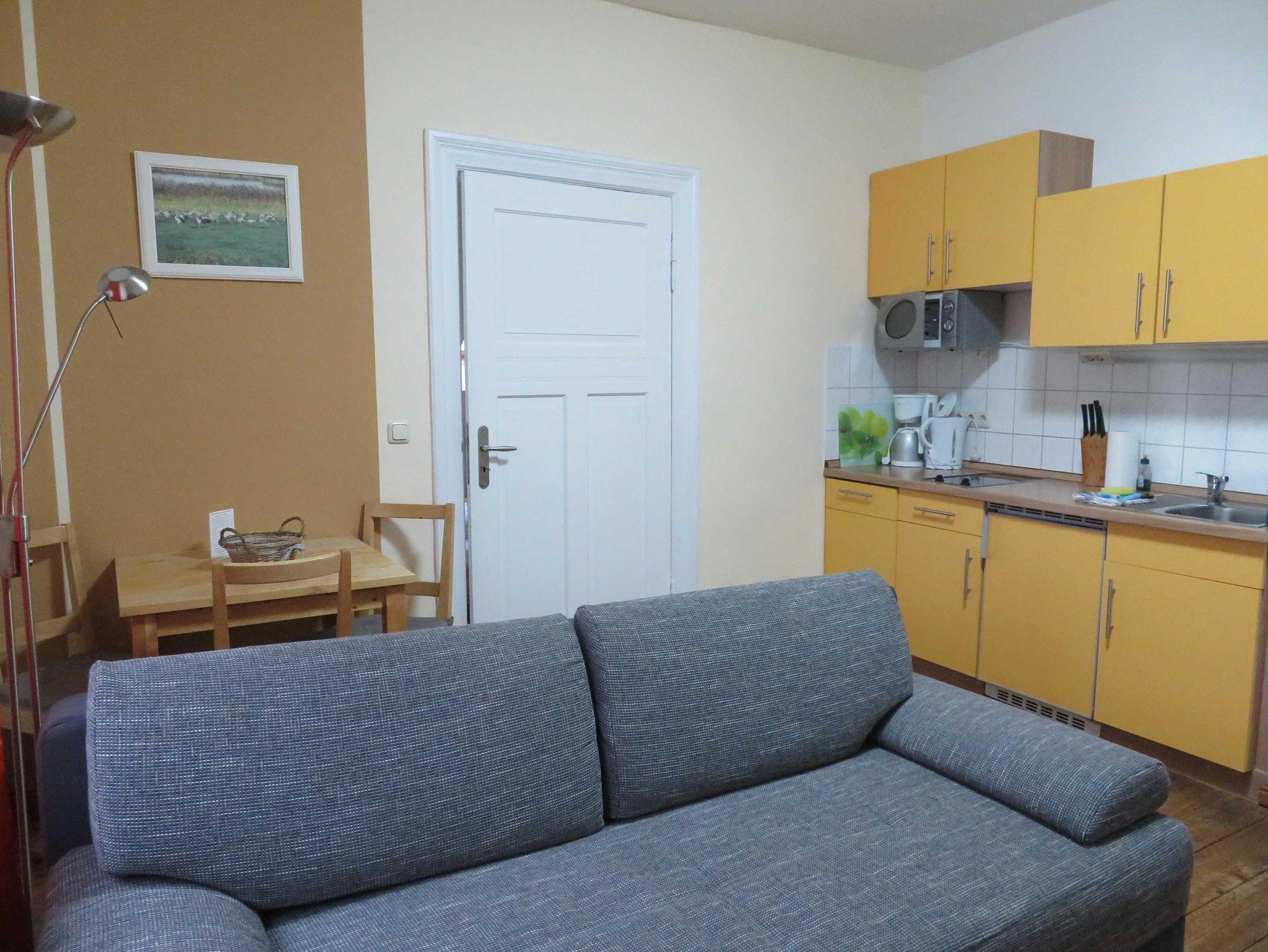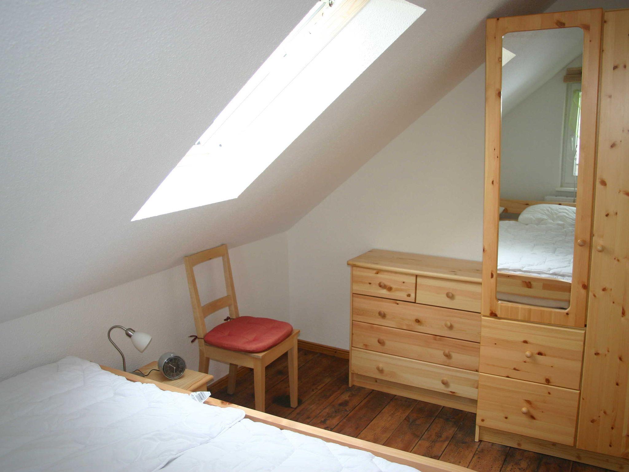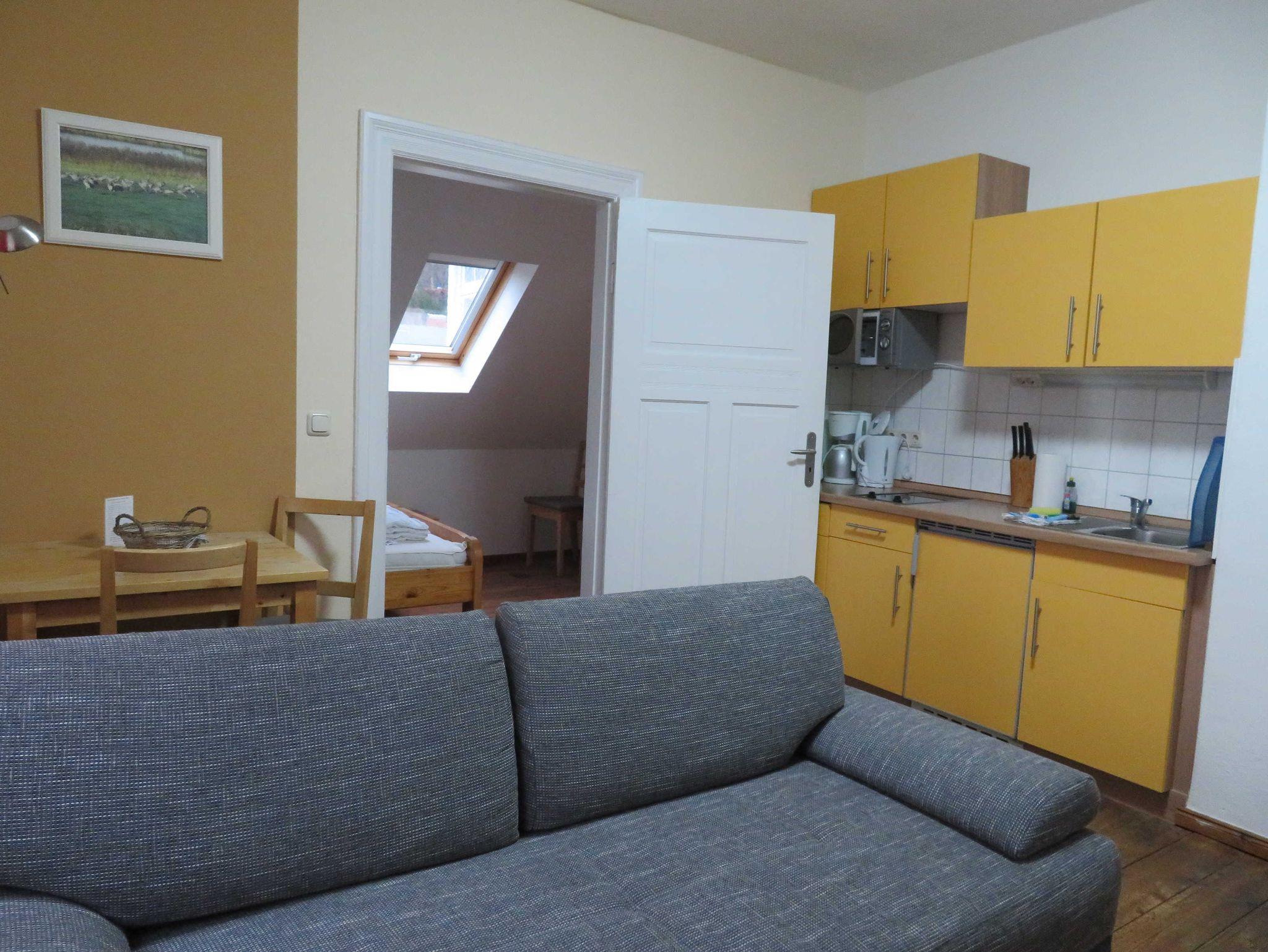 Hier handelt es sich um die kleine 2- Raum- Ferienwohnung Ummanz im Obergeschoss. Diese hat ein Schlafzimmer mit einem Doppelbett unter der Dachschräge und im Wohnzimmer ein Schlafsofa mit zwei weiteren Schlafplätzen. Im Wohnzimmer befindet sich die Küche mit Kühlschrank, Geschirrspülmaschine, Mikrowelle, Kaffeemaschine, Toaster und Wasserkocher. Die Ferienwohnung ist mit Sat- TV ausgestattet und hat einen Balkon, den Sie über den Flur erreichen können.