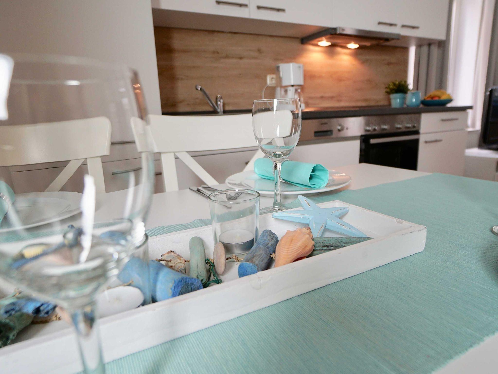 Wintergarten mit Vorhängen als Sonnenschutz, reichhaltige Küchenausstattung mit Herd mit Cerankochfeld, Dunstabzugshaube, Geschirrspüler, Kühlschrank, getrennte Müllentsorgung, Kaffeemaschine, Isolierkanne, Toaster, Töpfe und Pfannen, Geschirr und Gläser sind ausreichend vorhanden, Laminat- oder Fliesenboden für leichte Sauberhaltung. Auf jeder Etage befindet sich auch ein Staubsauger und weitere Reinigungsmittel, sowie großer Wäsche- und Kleiderschrank, Schuhschrank, Flurgarderobe, geräumiges Duschbad sowie ein separates WC mit Handwaschbecken, Kabel-TV, kostenloses W-LAN, SodaStream, bei Bedarf kann eine Mikrowelle an der Rezeption ausgeliehen werden.