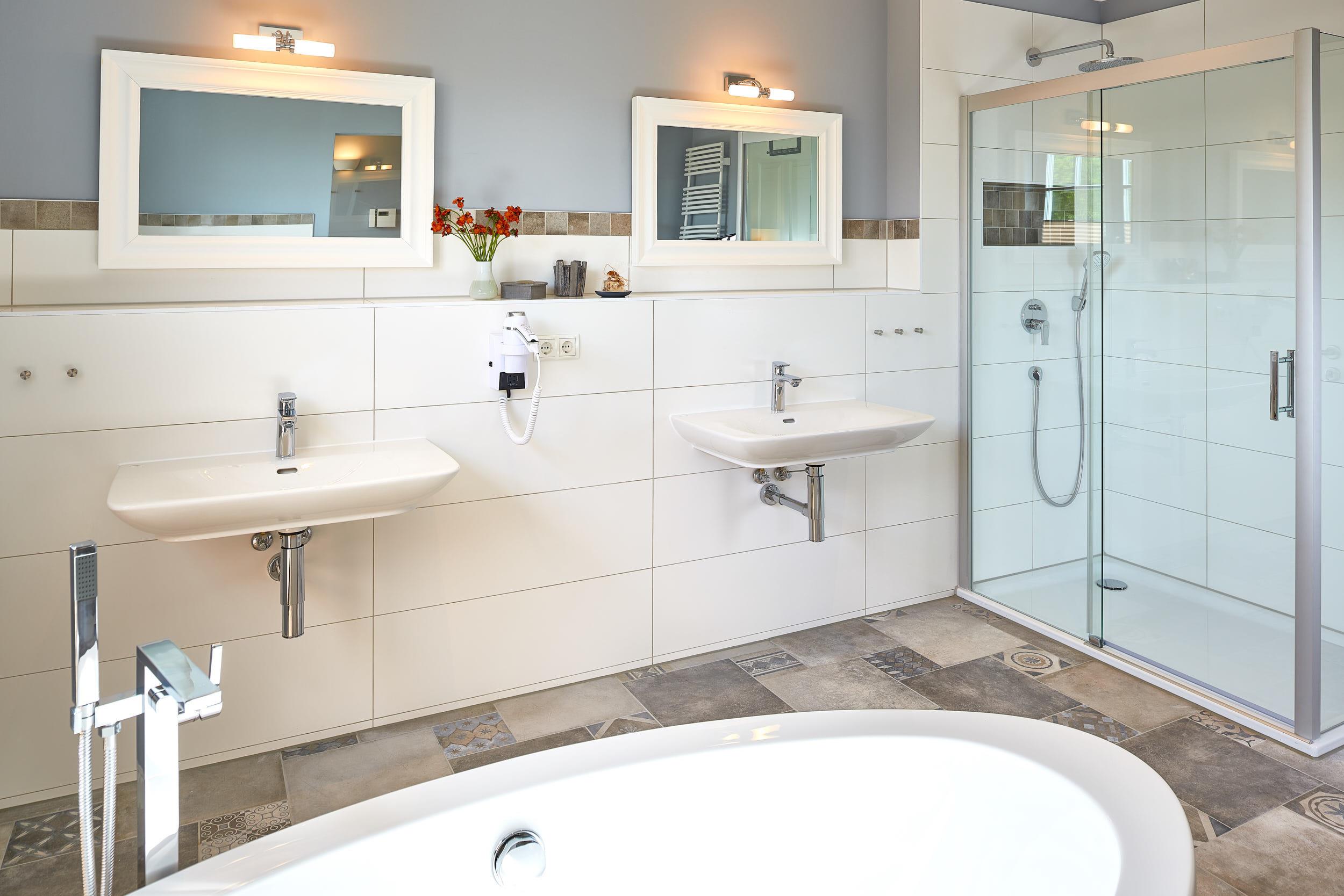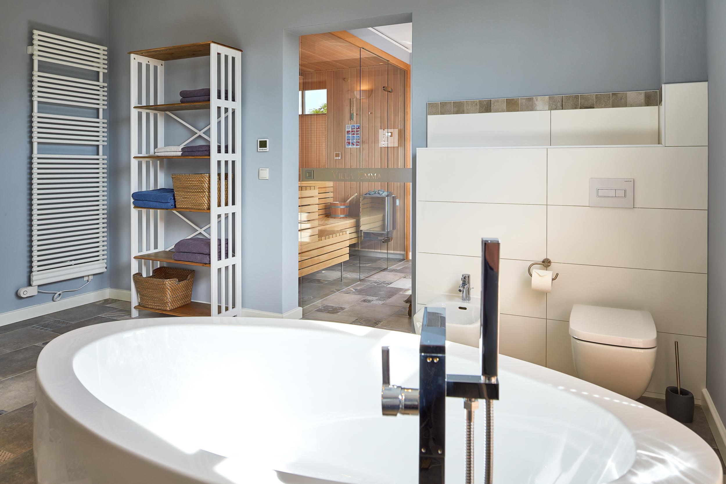 Bad: 2 Waschbecken, WC, Bidet, Sauna mit Ruhebereich , Badewanne, XXL-Dusche ebenerdig, Fußbodenheizung, Fön, Duschgel, Kindertoilettensitz, Kindertöpfchen, Musikanlage