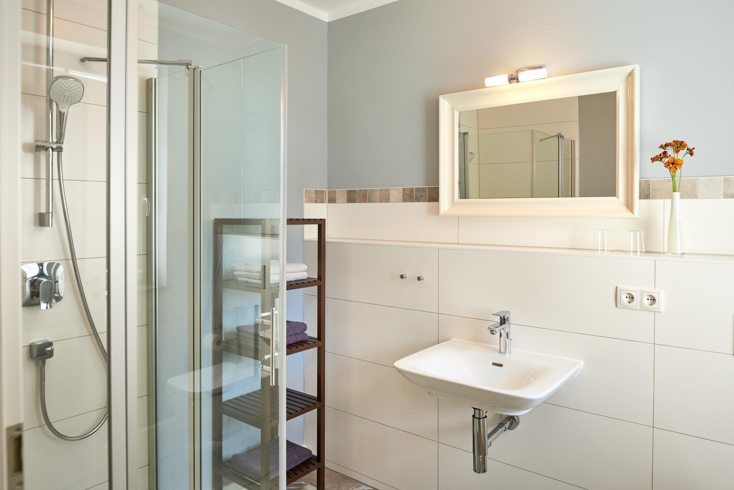 Bad: Waschbecken, WC, Dusche ebenerdig, Fußbodenheizung, Duschgel