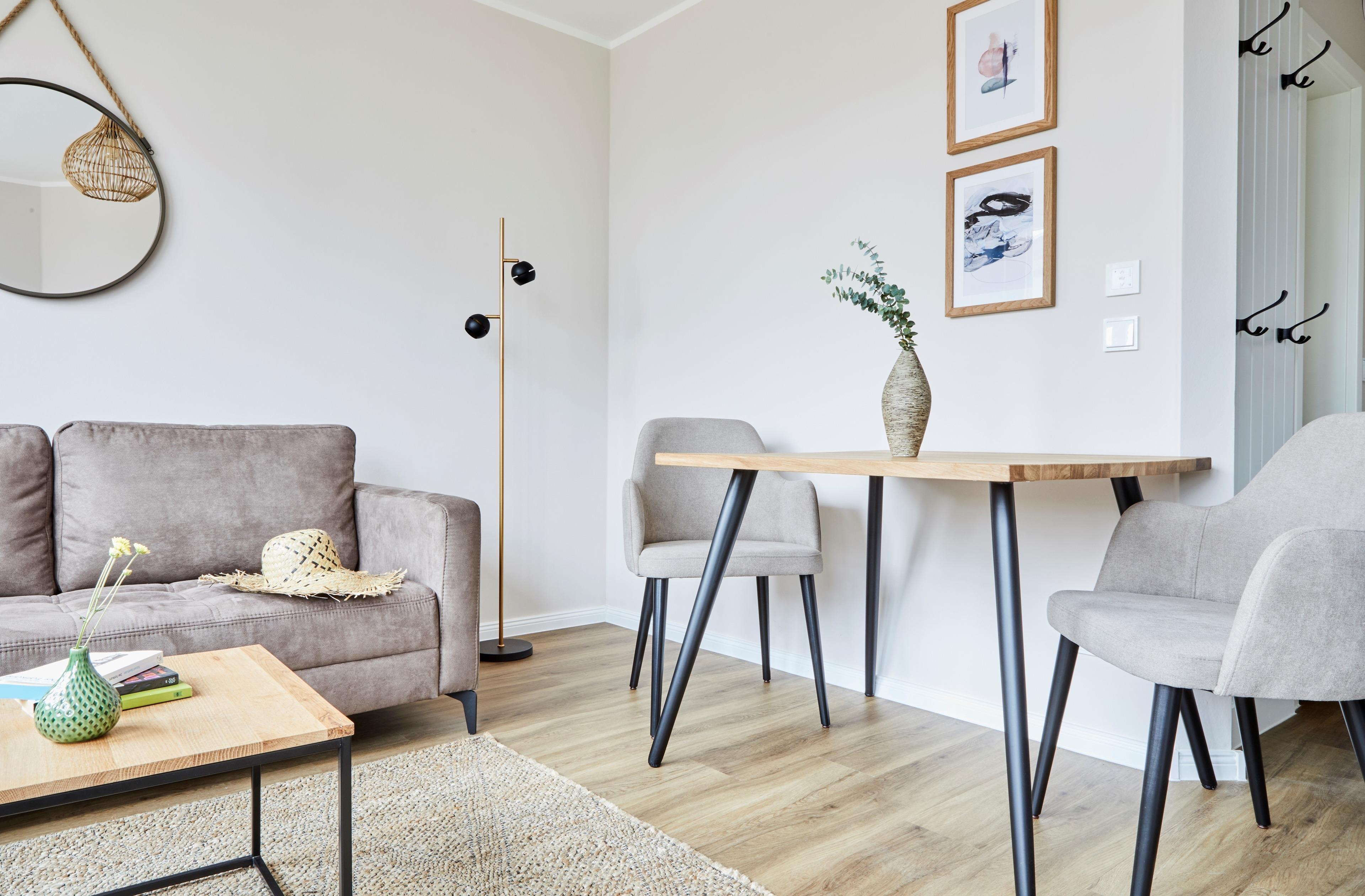 Die Wohnung befindet sich im Erdgeschoss des Anbaus und hat eine eigene Terrasse, die in Richtung Garten gelegen ist. Die Wohnung verfügt über einen großen Wohnraum mit integrierter, moderner Küchenzeile, sowie einem separaten Schlafraum.