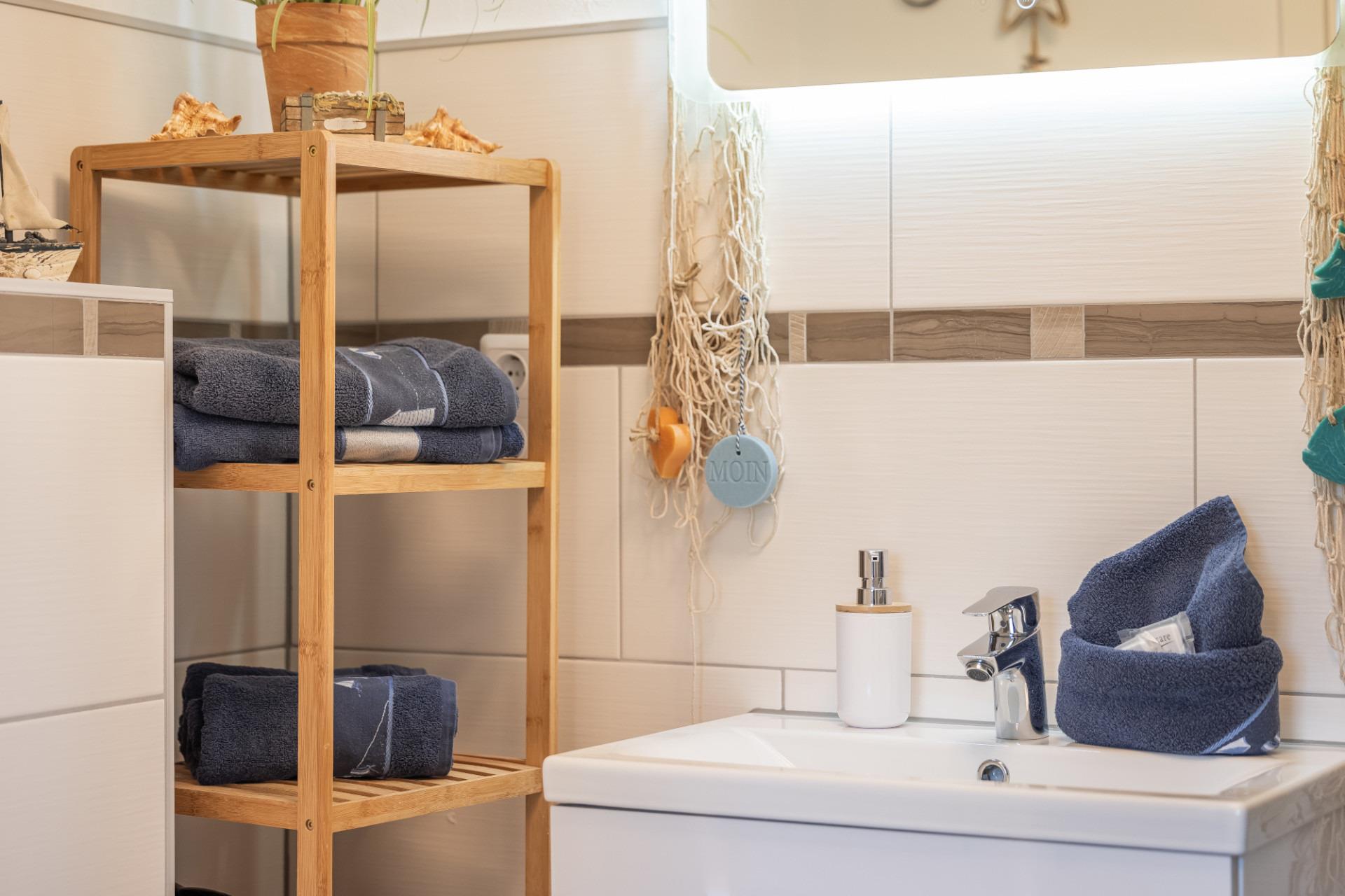 Die Wohnung ist geschmackvoll im Landhausstil eingerichtet und verfügt über ein Wohn-/Esszimmer mit Küchenzeile, ein Schlafzimmer mit Boxspringbett und ein Badezimmer mit Dusche.