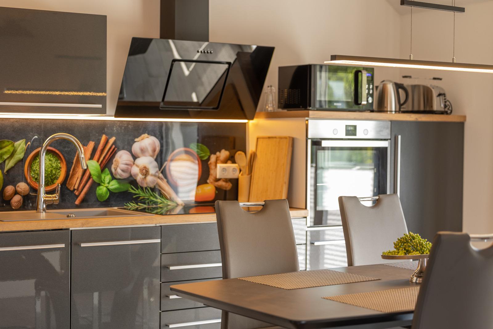 Vom Flur gelangen Sie direkt in den lichtdurchfluteten Wohnbereich mit angrenzender Küche. Die Küche ist voll ausgestattet und Sie können mit einem guten Frühstück in Ihren Urlaubstag starten.