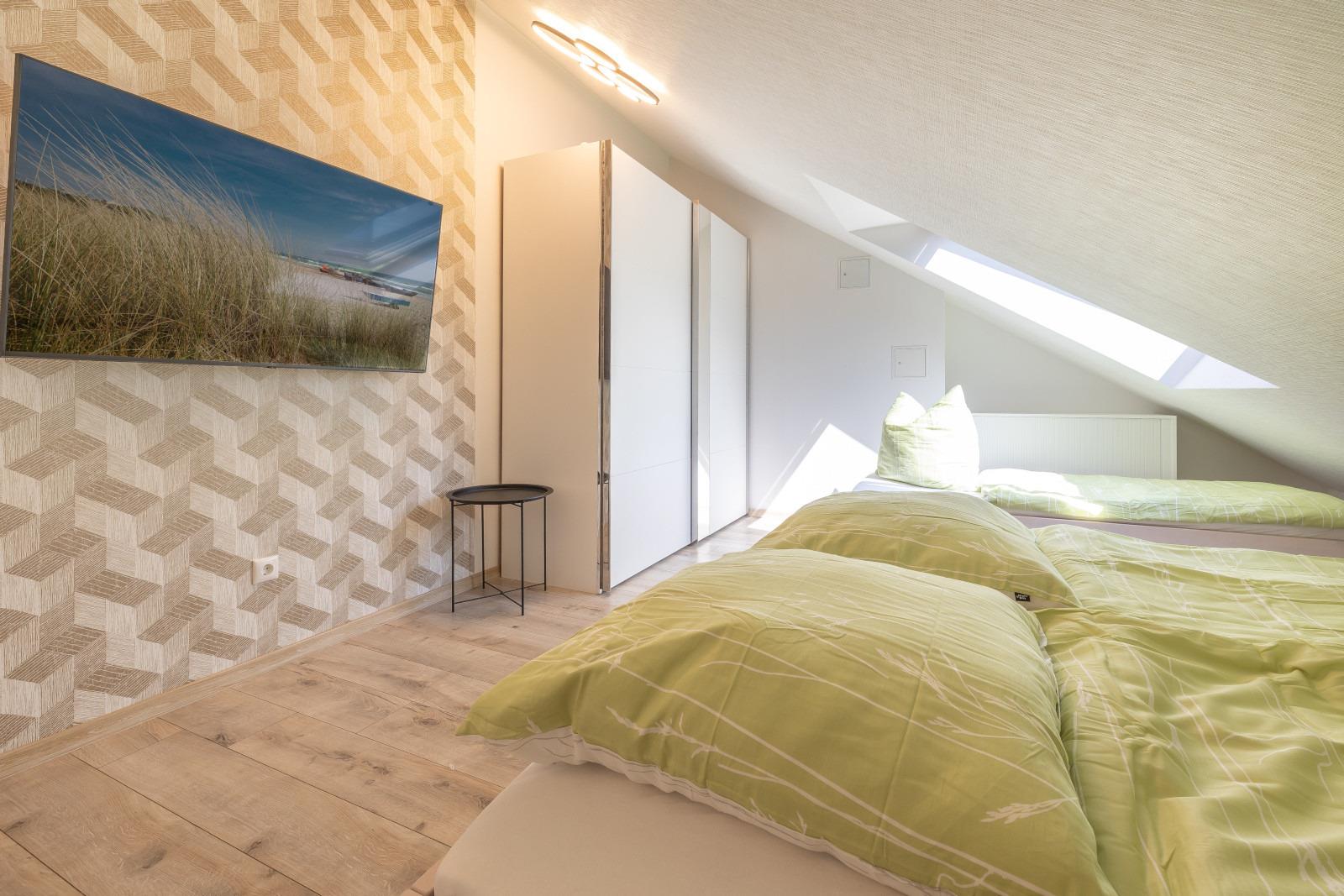 Über eine offene Treppe gelangen Sie in den großzügigen Schlafbereich, ausgestattet mit zwei Doppelbetten (180 x 200 cm) und einem Einzelbett (je 90 x 200 cm)