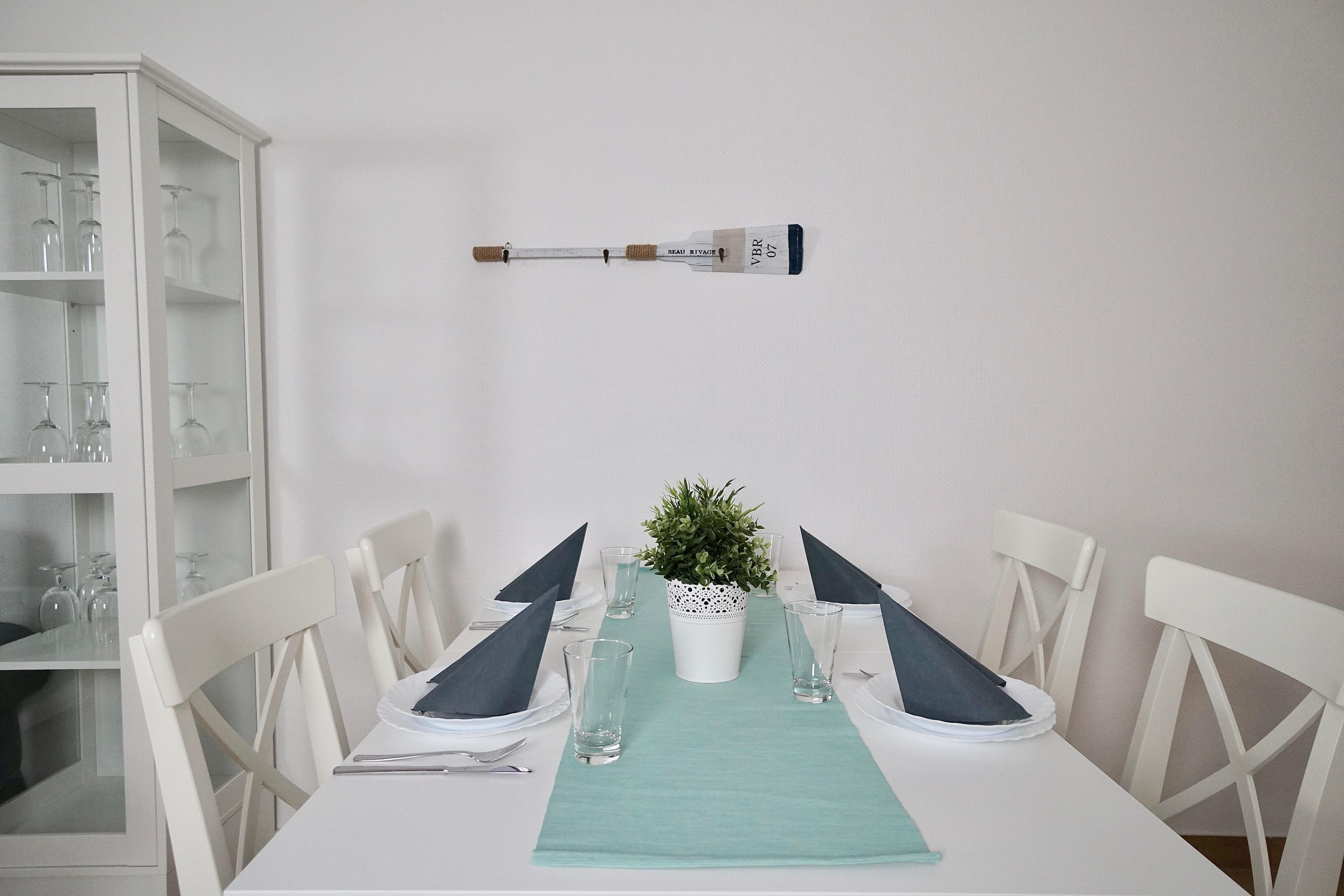 In dem Raum befindet sich auch die Küchenzeile der Wohnung, die für Sie voll eingerichtet ist und sogar über einen Backofen und einen 4-Platten-Herd sowie eine Kühl-Gefrierkombination verfügt. Am angrenzenden Esstisch können Sie dann Ihre selbst zubereiteten Mahlzeiten zu sich nehmen.