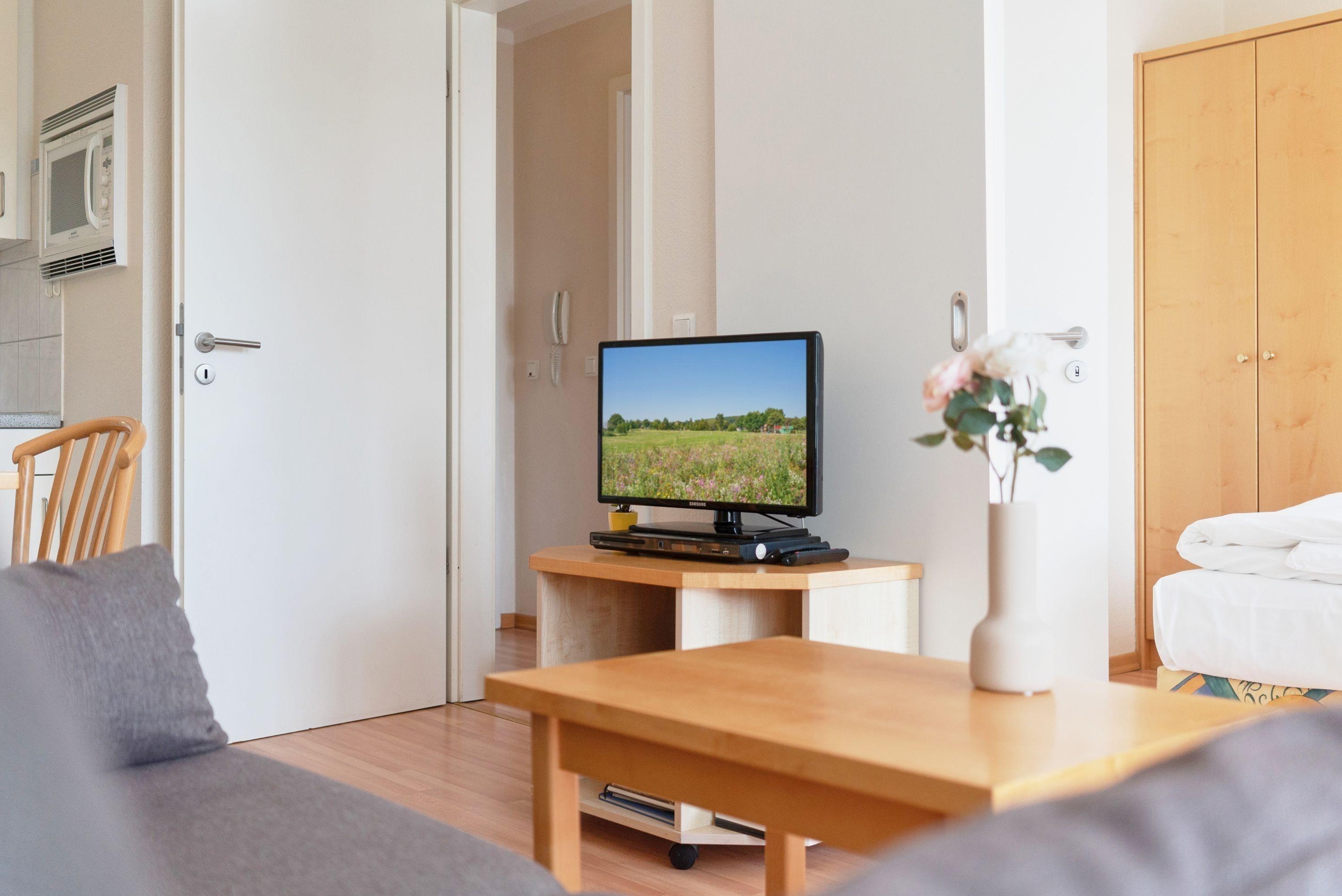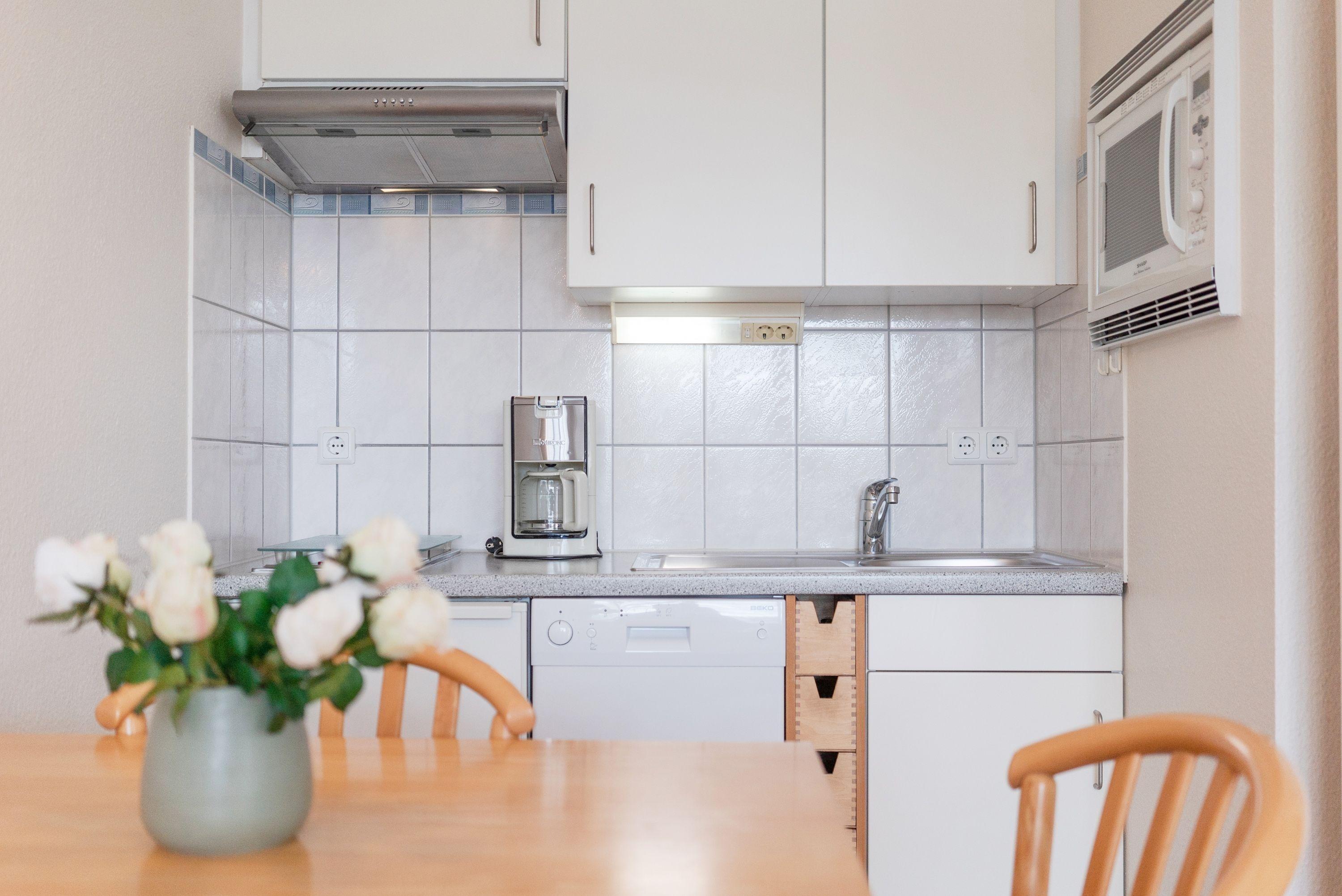 Die zwei Zimmerwohnung besteht aus einem Wohnraum mit Küchenzeile (Spülmaschine, Kaffeemaschine, Esspressomaschine, Eierkocher, Toaster, 2er Ceranfeld, kombinierter Backofen mit Mikrowelle) Essecke, Sessel und Schlafsofa (für die dritte Person - Achtung, das kann eng werden! ). TV, Radio und DVD-Player.