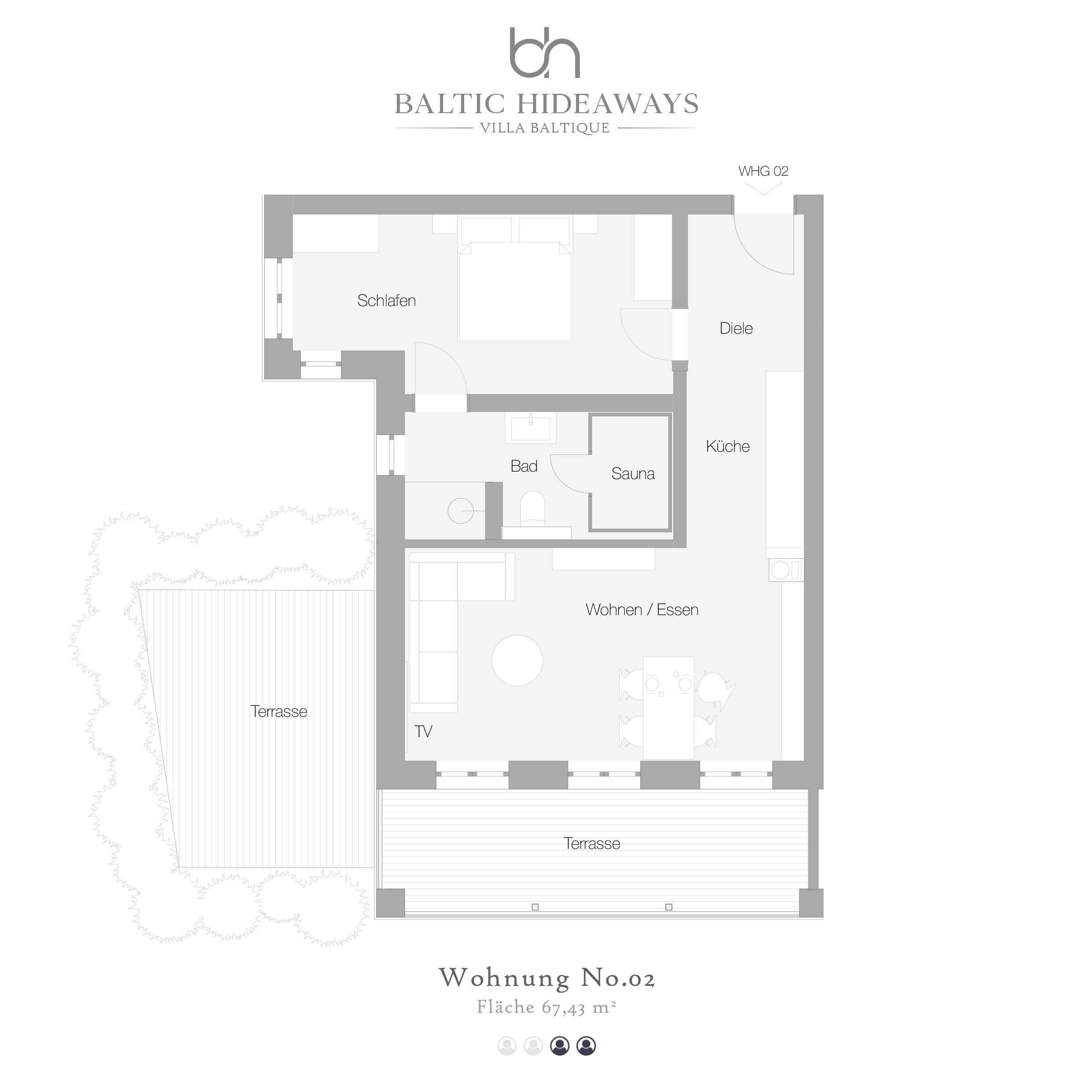 Die Garden Suite mit Terasse befindet sich im Erdgeschoss und verfügt über geräumige ca. 67 qm, über einen separaten Schlaf-/Wohnraum, eine offene Küchenzeile und ein Badezimmer mit Dusche sowie einer Sauna.