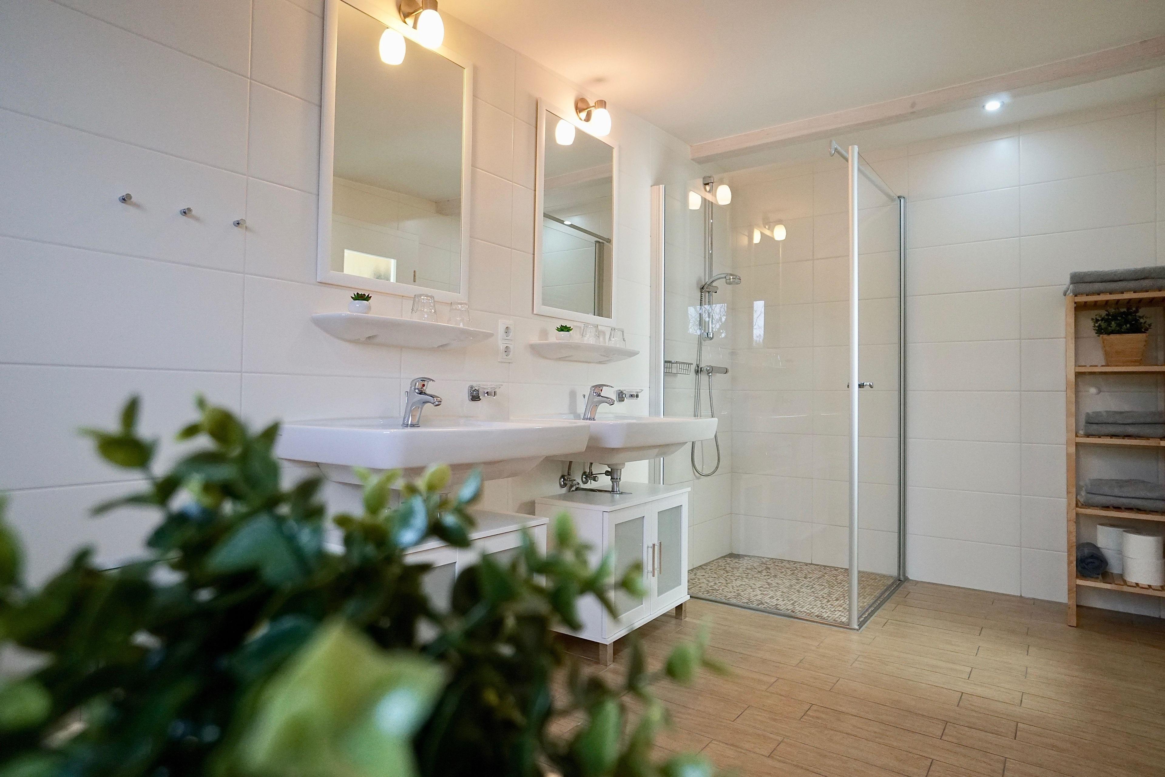 Genauso schließt hier das moderne Tageslichtbad mit großzügiger Dusche, zwei Waschbecken und WC an.