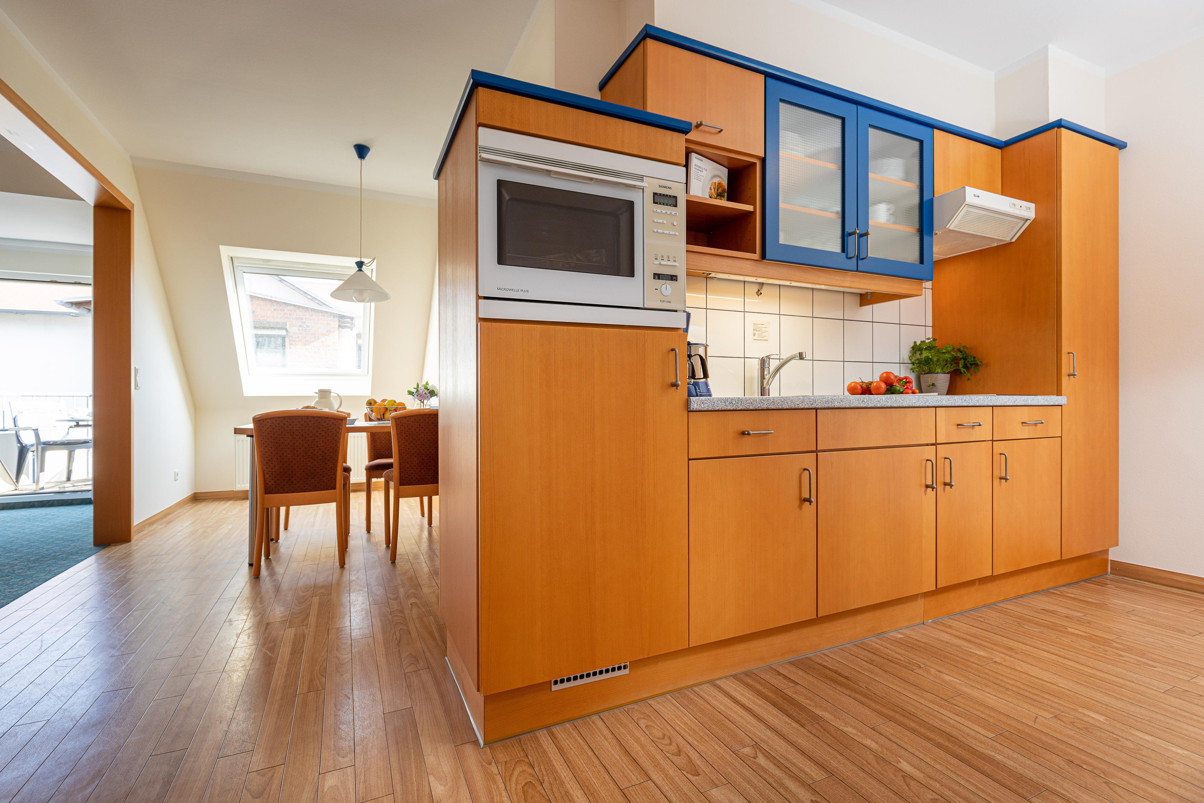 Die Küchenzeile ist mit einem Kühlschrank, einem Ceranfeld und einem Backofen/Mikrowelle ausgestattet. Ebenso finden sich hier alle nötigen Küchenkleingeräte (Wasserkocher, Kaffeemaschine, Toaster..).