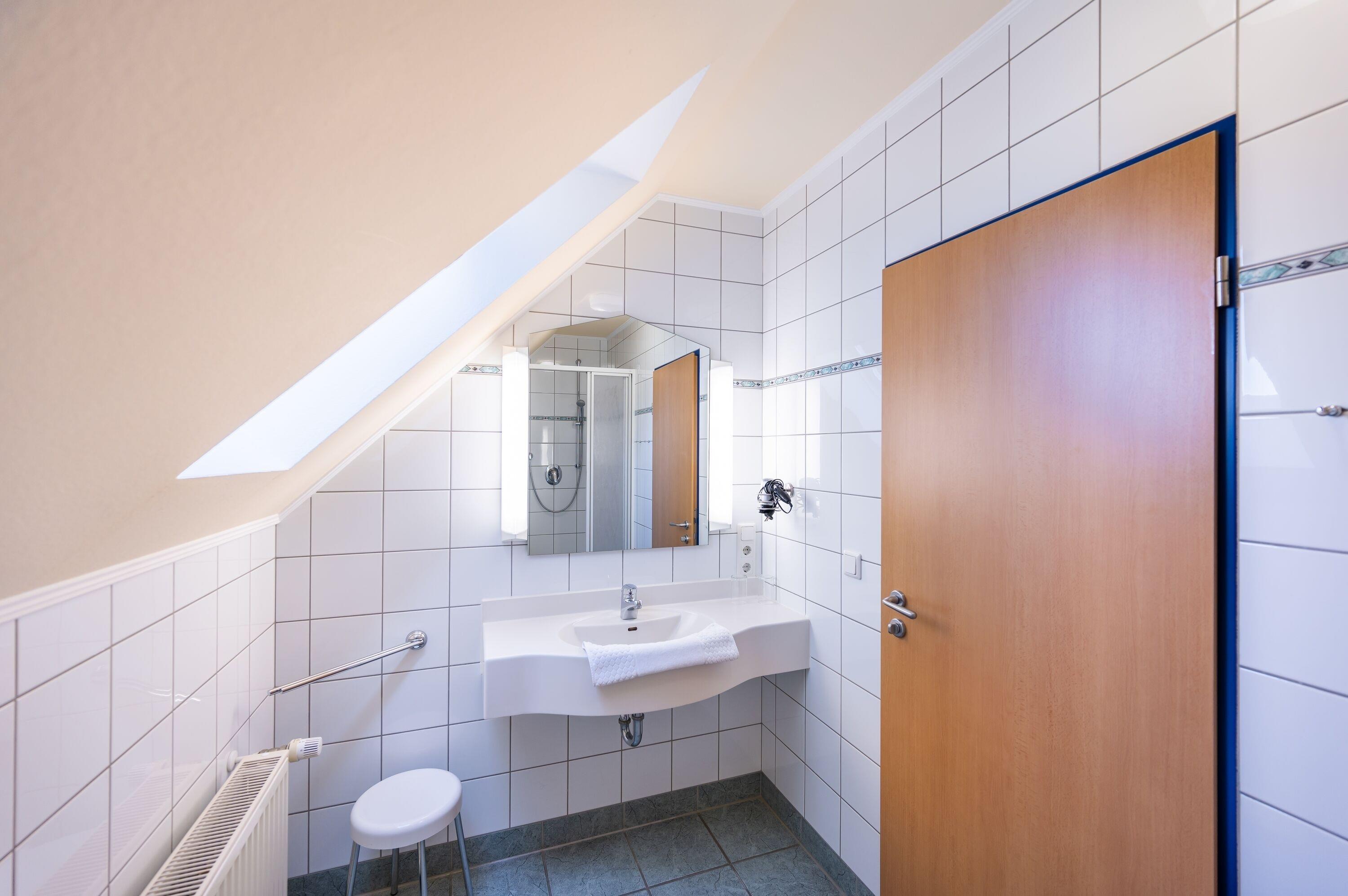 Im Schlafbereich steht ein komfortables Doppelbett, ein geräumiger Kleiderschrank und ein kleiner Schreibtisch bereit. Im Badezimmer mit Fenster befindet sich eine Dusche und ein WC.