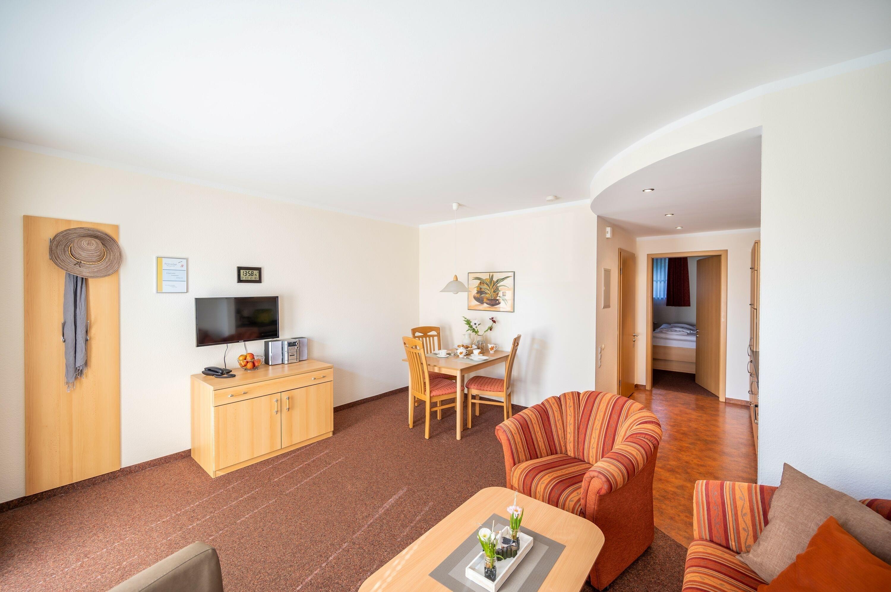 Das helle Wohnzimmer verfügt über eine bequeme Couchgarnitur,[nbsp] einen TV und eine kostenfreien WLAN-Zugang. Zudem erreichen Sie von hier aus die sonnige Terrasse inkl. Terrassenmöbel.