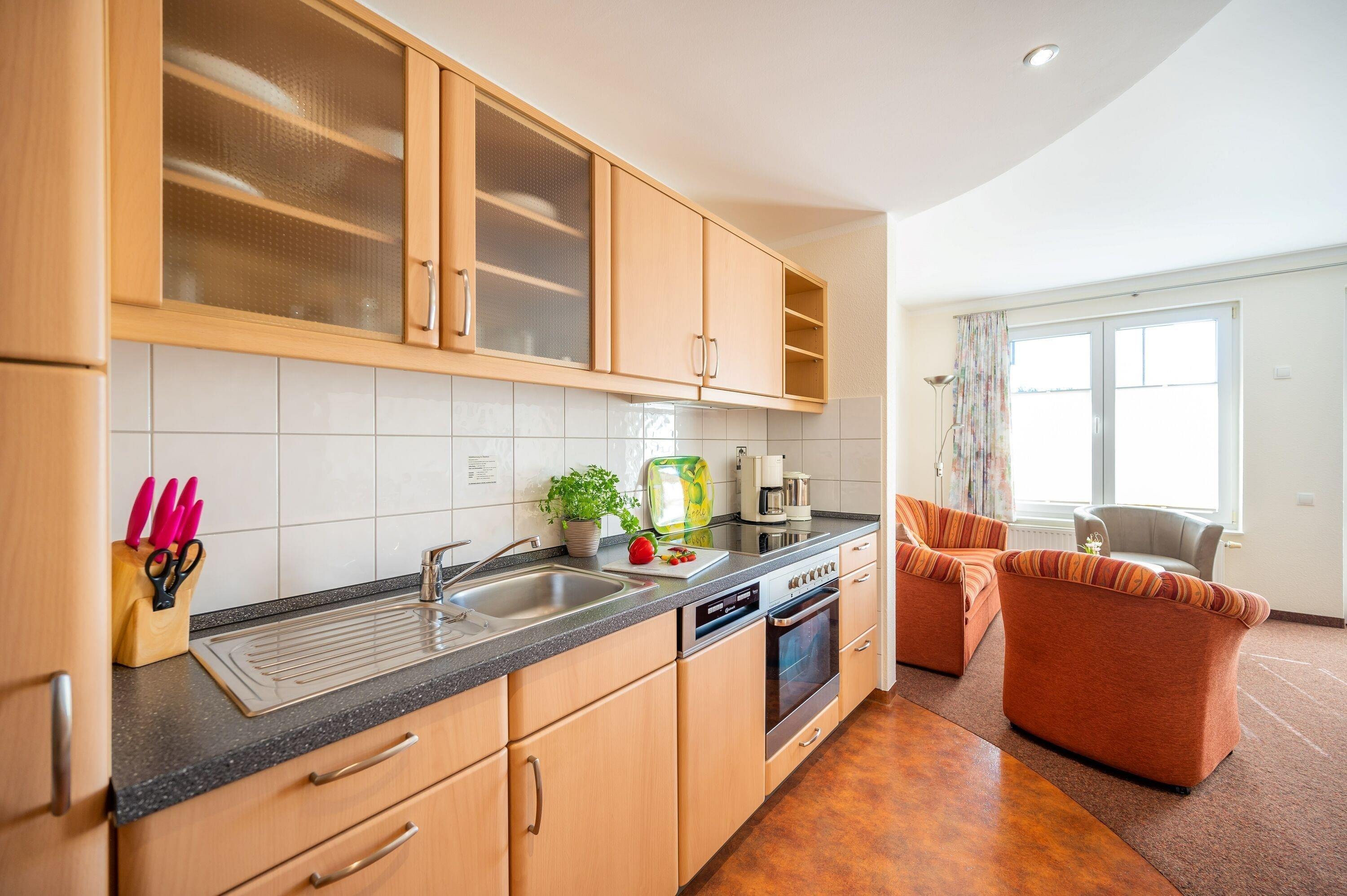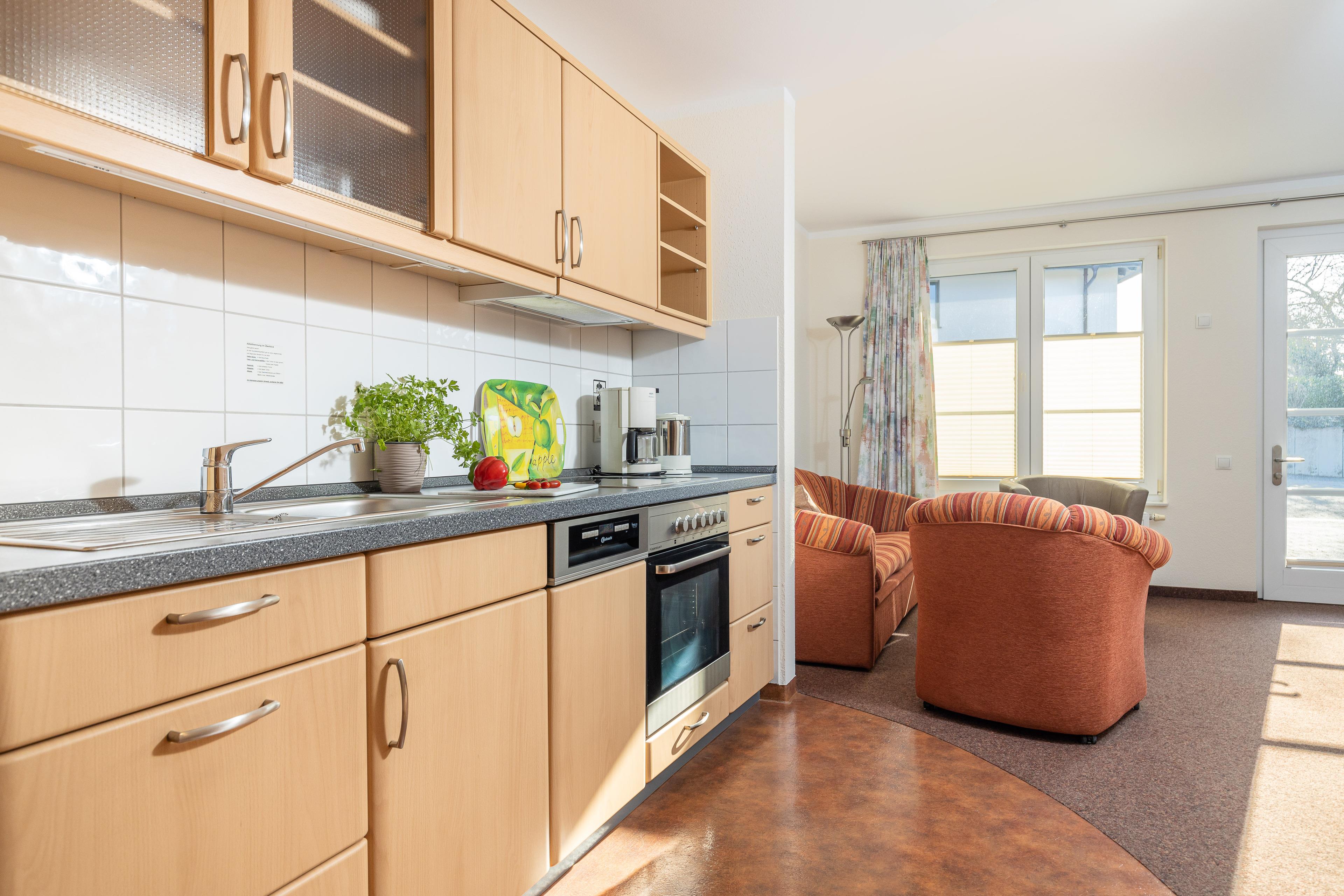 Die Küchenzeile ist mit einem Kühlschrank, einem Ceranfeld mit Backofen, einer Spülmaschine und einer Mikrowelle ausgestattet. Ebenso finden sich hier alle nötigen Küchenkleingeräte (Wasserkocher, Kaffeemaschine, Toaster..).