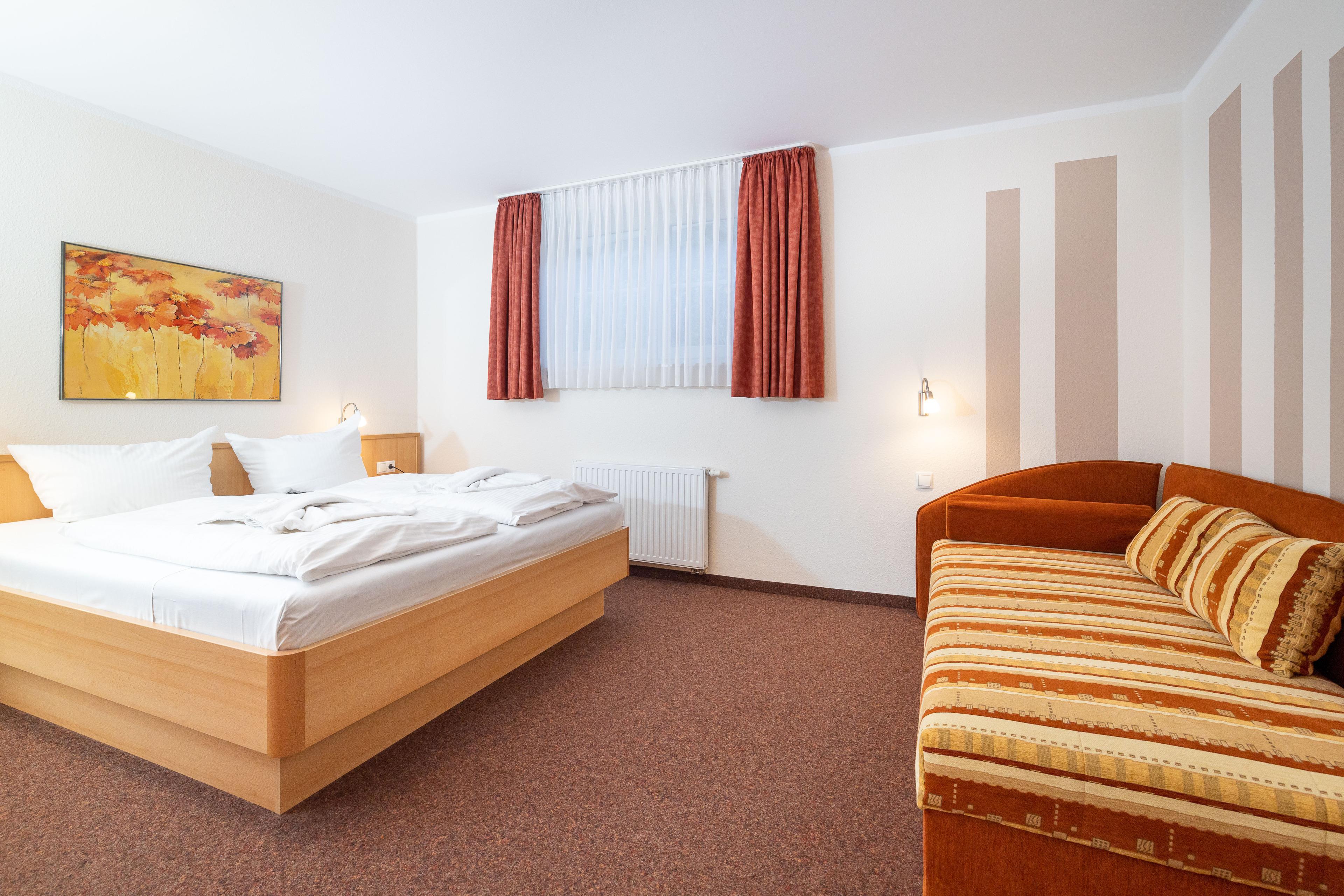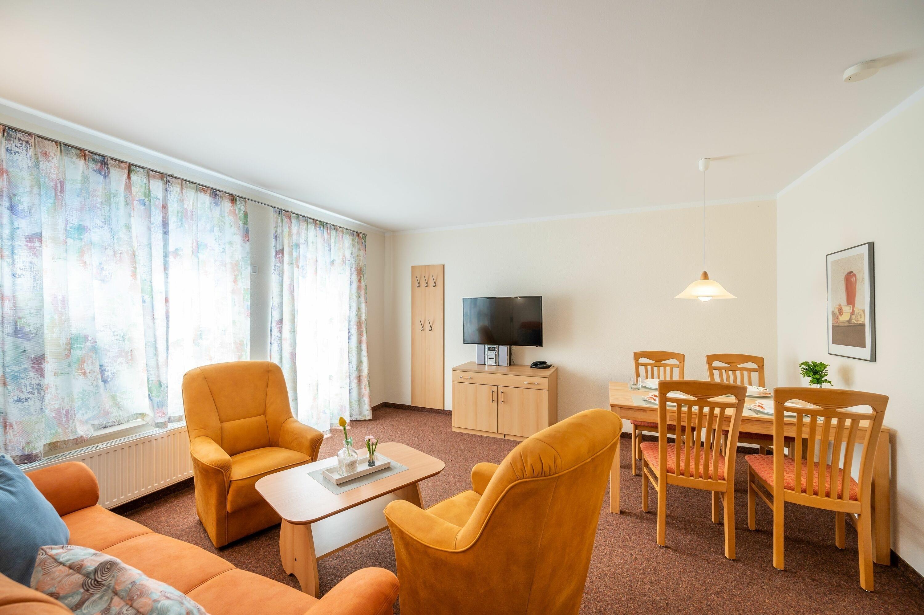 Das helle Wohnzimmer verfügt über eine Couchgarnitur, einen TV und einen kostenfreien WLAN-Zugang. Zudem erreichen Sie von hier aus die sonnige Terrasse inkl. Terrassenmöbel.