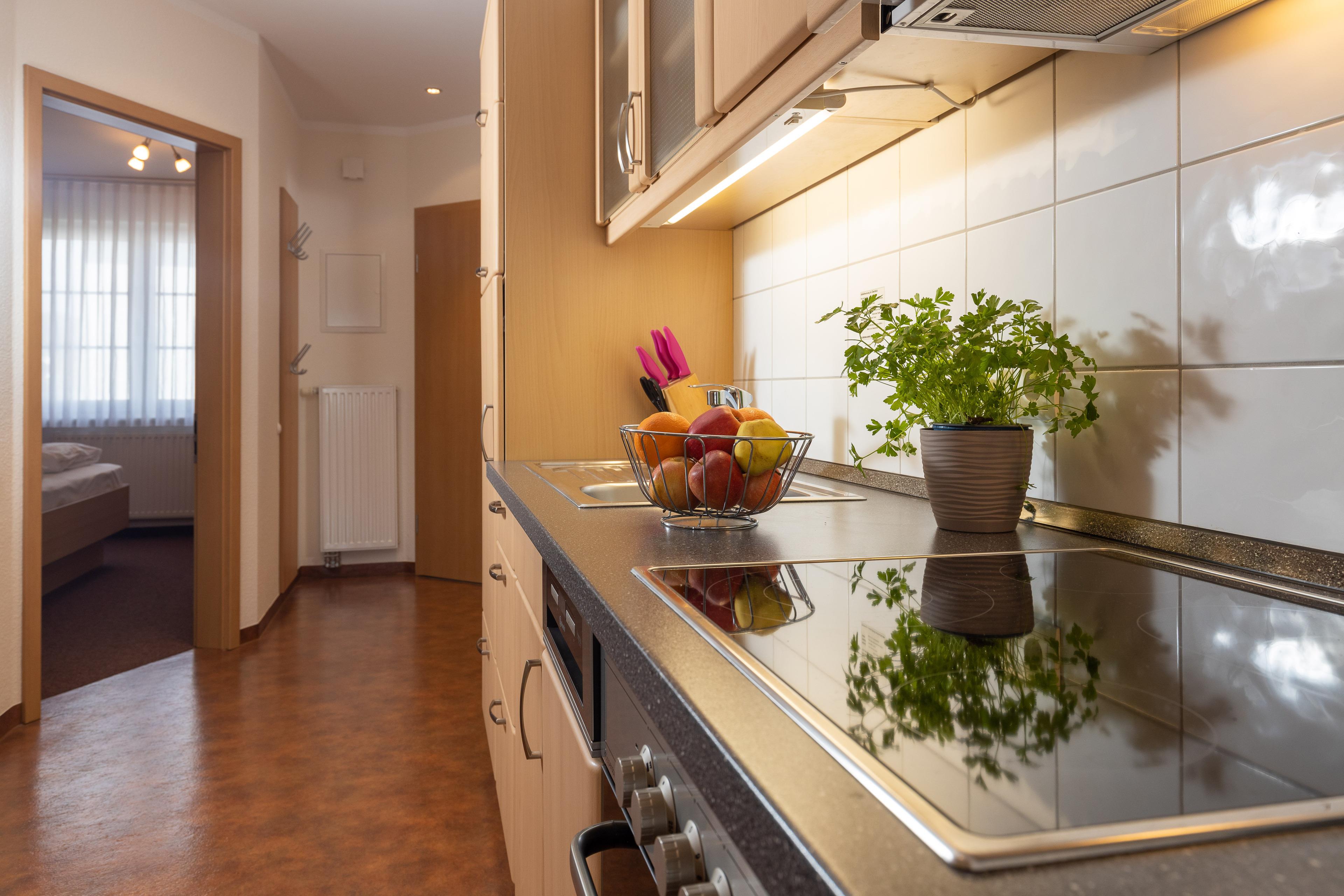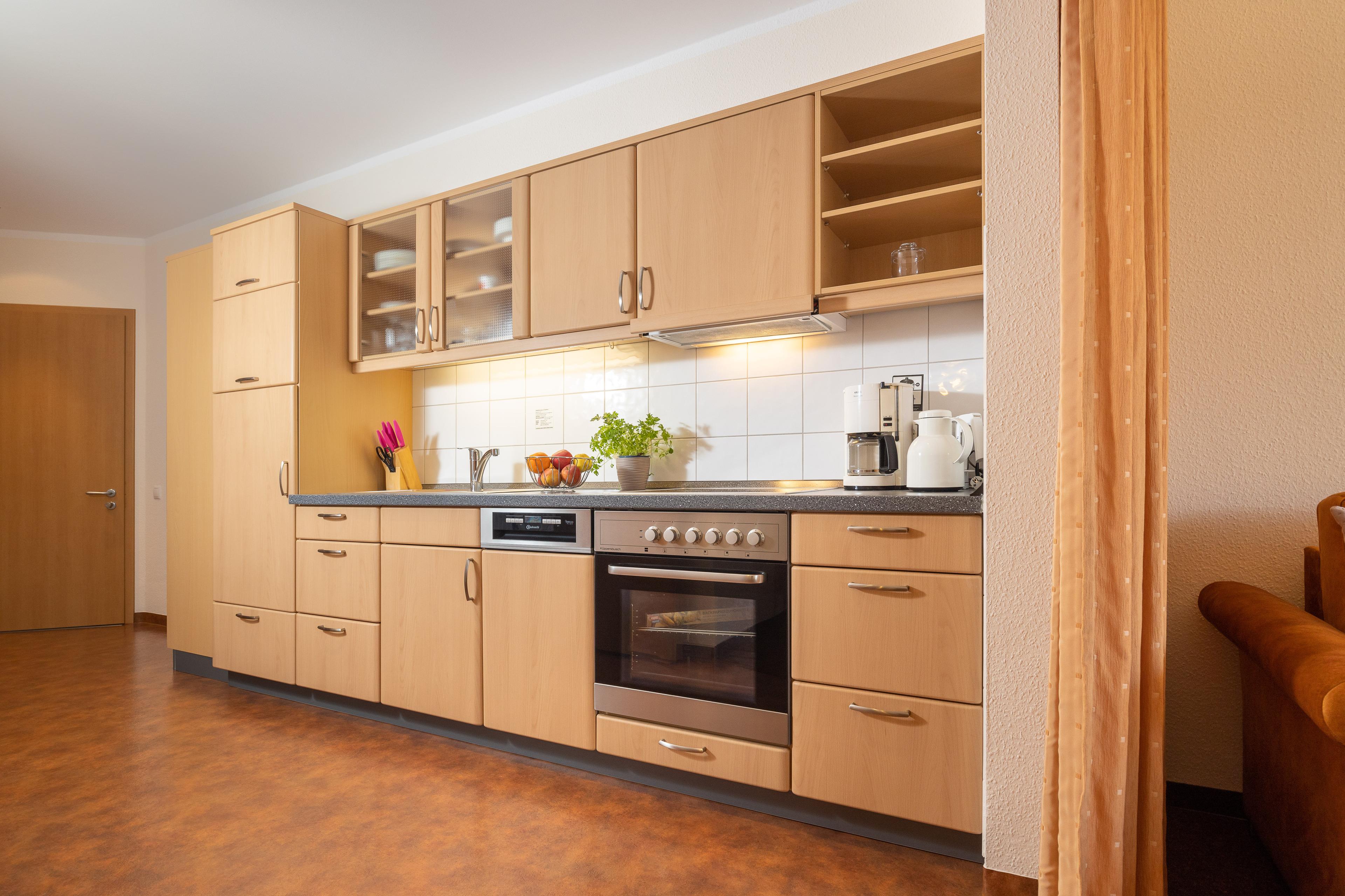 Die Küchenzeile ist mit einem Kühlschrank, einem Ceranfeld mit Backofen, einer Spülmaschine und einer Mikrowelle ausgestattet. Ebenso finden sich hier alle nötigen Küchenkleingeräte (Wasserkocher, Kaffeemaschine, Toaster..).