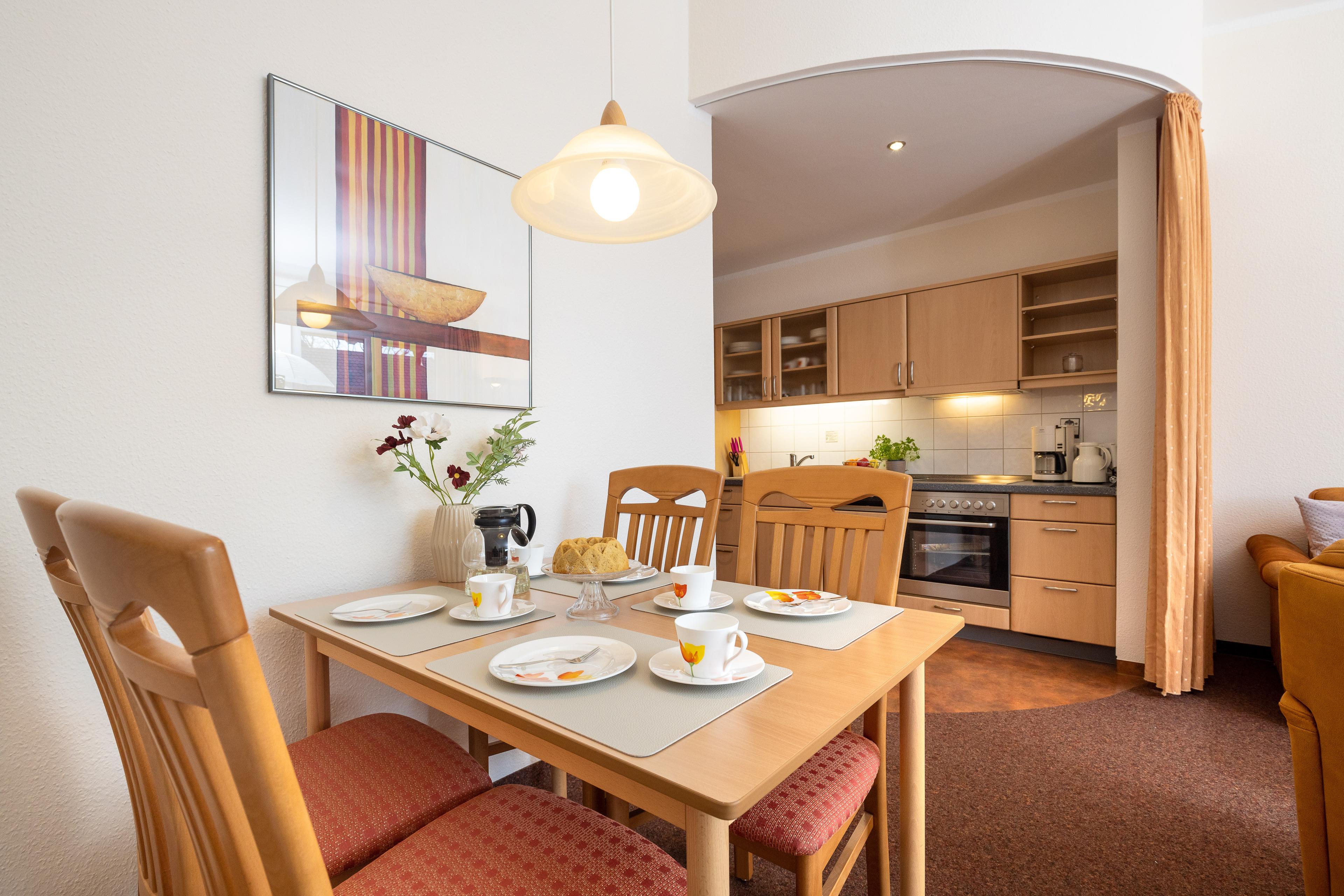 Die freundlich eingerichtete Wohnung 14 in der Ferienanlage Margaretha ist ca. 58 m² groß und für bis zu 4 Personen ausgelegt.