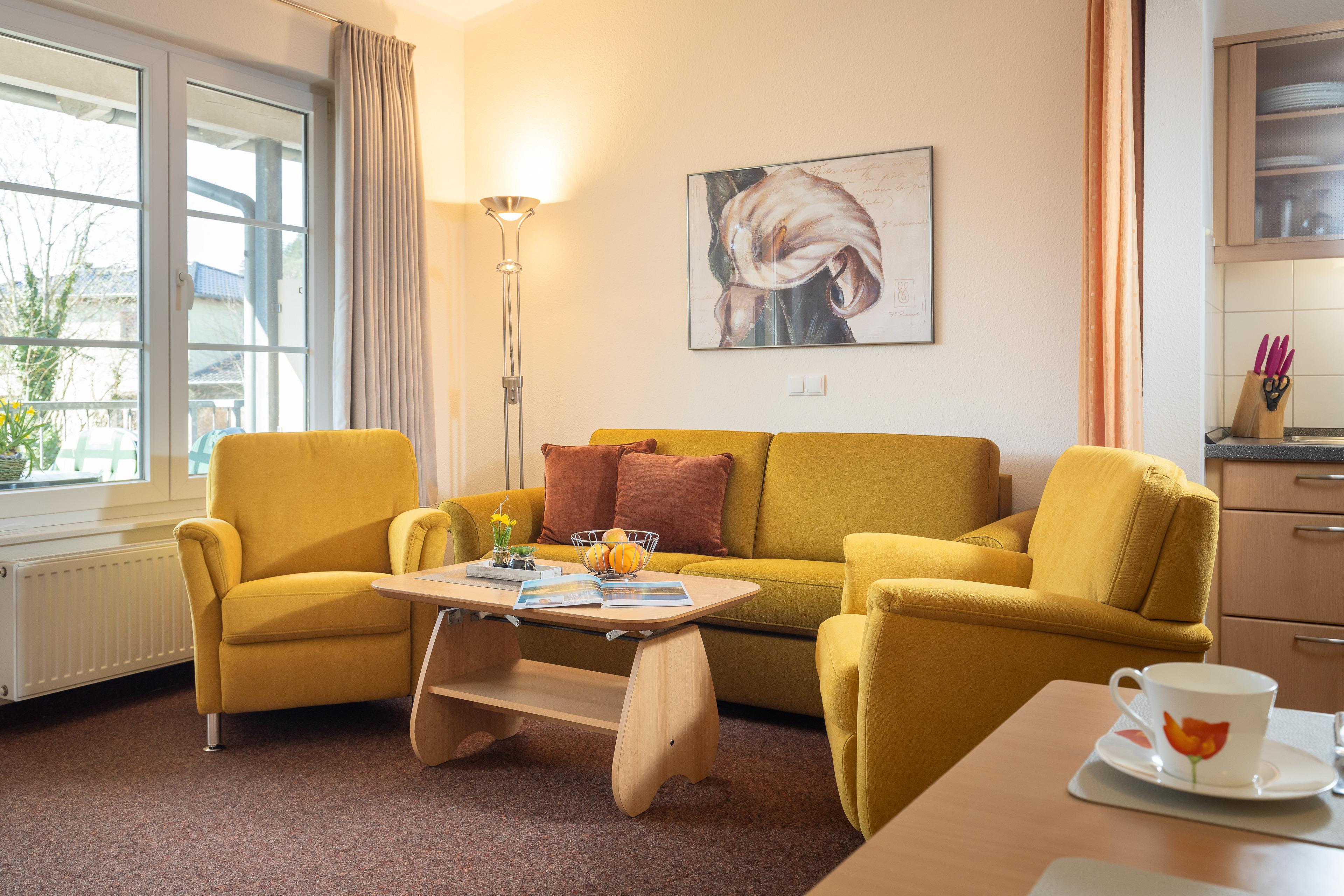 Das helle Wohnzimmer verfügt über eine Couchgarnitur, welche ebenso eine Aufbettung für 2 weitere Personen darstellt. Neben einem TV und einem kostenfreien WLAN-Zugang erreichen Sie von hier aus den sonnigen Balkon inkl. Balkonmöbel.