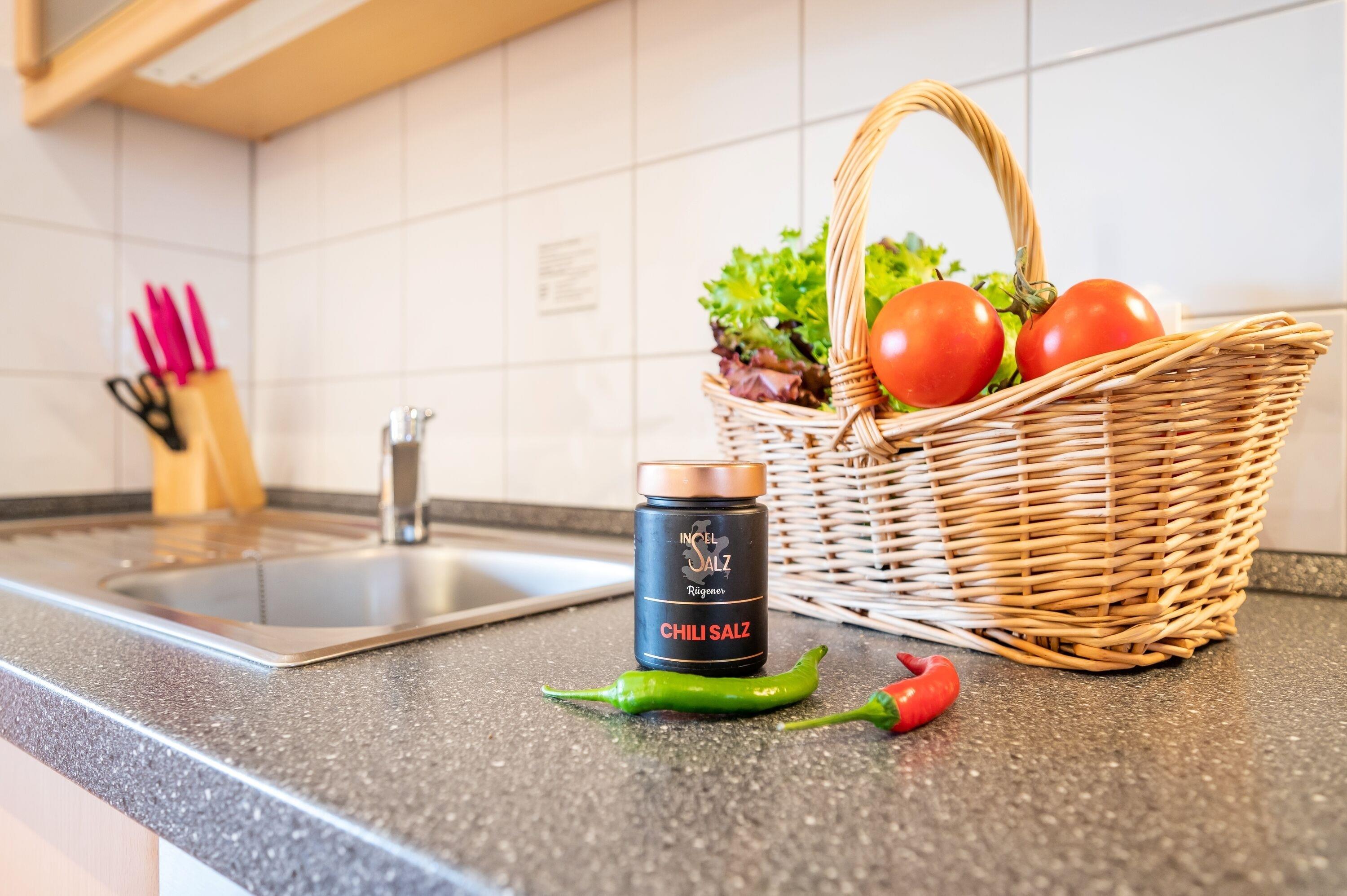 Die Küchenzeile ist mit einem Kühlschrank, einem Ceranfeld mit Backofen, einer Spülmaschine und einer Mikrowelle ausgestattet. Ebenso finden sich hier alle nötigen Küchenkleingeräte (Wasserkocher, Kaffeemaschine, Toaster..).